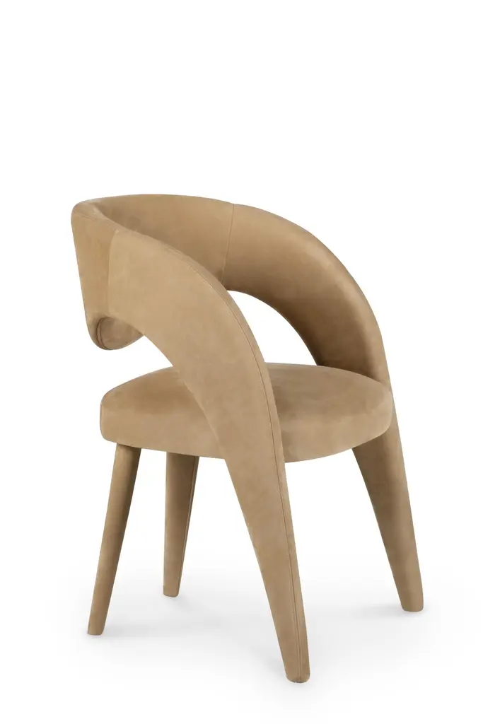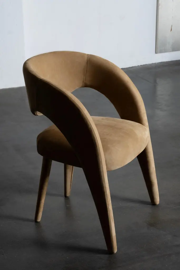 Laurence Chair, Contemporary Collection, Handcrafted in Portugal - Europe by Greenapple.The Laurence leather dining chair is an artistic tribute to the essence of femininity in contemporary design. With its elegant and daring silhouette, this leather dining chair is a sensory trigger, revealing dynamic and vibrant contours with each encounter. Meticulously crafted in premium leather, Laurence combines fine craftsmanship and unique design, becoming a favorite dining chair among designers and a versatile addition to sophisticated interiors.The Laurence chair is upholstered in brown nubuck leather, offering a rich and comfortable seating experience for indoor spaces. The leather can be treated with a stain-resistant finish for added durability.Its structure is made from anti-fungal and vermin-free solid steamed beechwood and birch plywood, ensuring strength and stability. Designed to withstand humid environments, it is also suitable for outdoor use when customized with weather-resistant fabric. Metal connecting components provide additional reinforcement, making it a versatile choice for different settings.The Laurence chairs can be customized in terms of dimensions, materials and finishes. Laurence Chair Material CodesM105083 Nubuck Leather, BrownHandcrafted in Portugal - Europe by GreenappleUnique by design, Crafted by peopleGreenapple transforms contemporary spaces into exclusive narratives of design and craftsmanship. From custom-made furniture to bespoke interiors, each creation is a timeless work of art, shaped by master artisans who honor centuries-old techniques.Founded in 2005 by Sérgio Rebola and Rute Martins, Greenapple has earned global recognition among high-end clientele and leading design firms. While Rute designs each unique piece, Sérgio ensures uncompromising quality from design to production and from production to your home. We provide a seamless experience, offering short production lead times, worldwide delivery within 7 to 10 days, and white-glove service upon request.For U.S. clients, we can handle all customs clearance, cover duties, and offer white-glove service as well upon request.Seat, Office Chair, Chair with Arms
