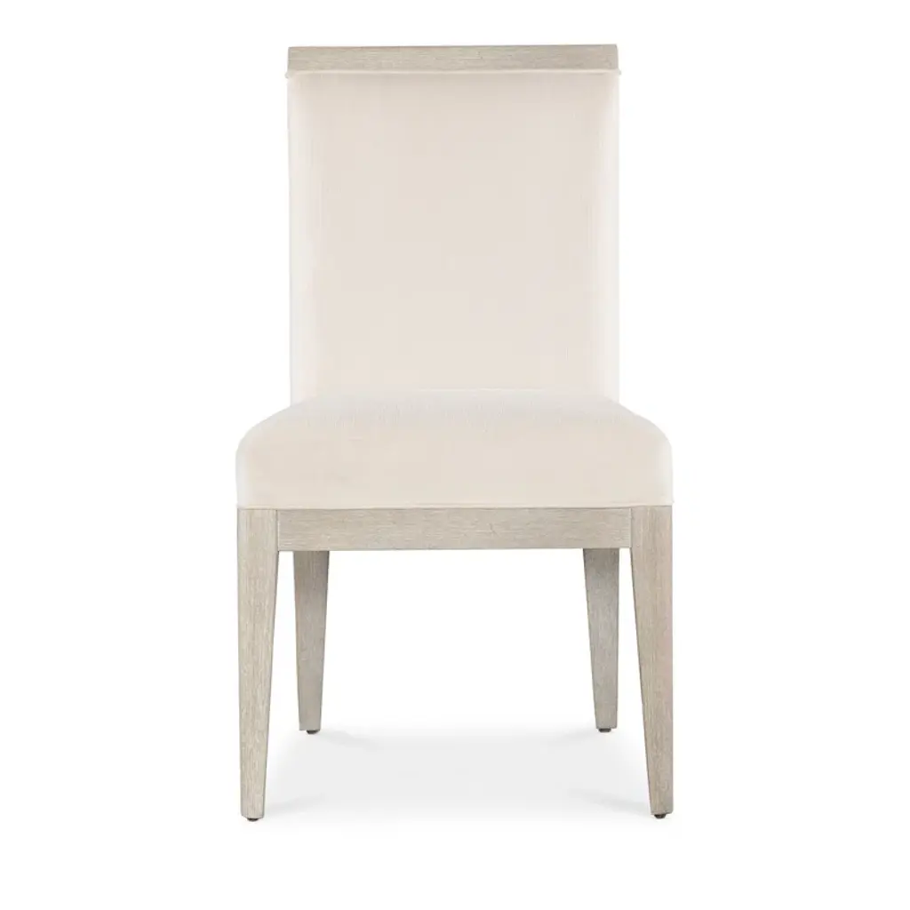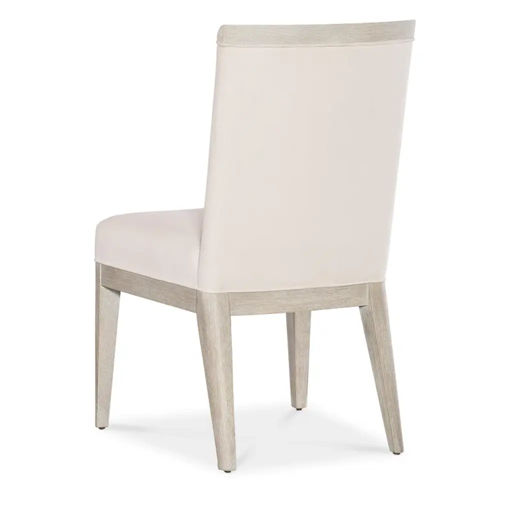 Cozy chic is married to a clean modern profile with the Modern Mood side chair, featuring a comfortable upholstered seat and back. The wood trim along the top of the chair and the wood base and legs are crafted of flat-cut quartered oak veneers with wire-brush detailing, delivering a soft sophistication. The versatile chair is upholstered in the cottony cotton cover.