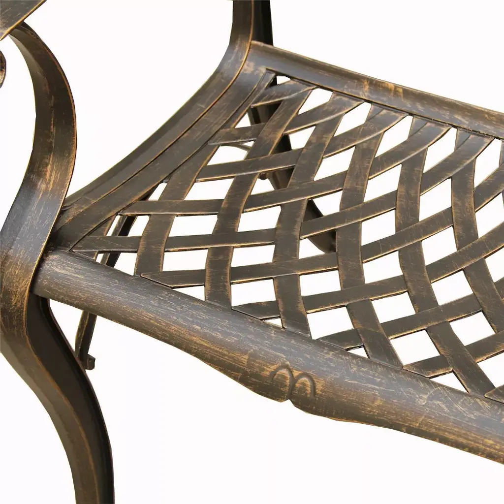 Constructed of cast aluminum in UV resistant, powder coated, hand applied bronze finish, this modern contemporary mesh lattice dining chair features designs specifically to prevent damages caused from pooling by allowing water to pass through freely. This chair is sturdy and perfectly designed to seat comfortably both tall and short people. This chair pairs well with any table and offers styling ideal for any patio, porch, deck, balcony and backyard. Suitable for indoor or outdoor and commercial or residential use. Aluminum Modern Contemporary Mesh Lattice Outdoor Dining Chair Dimensions: 23" L x 22" W x 35" H, 35 lbs.