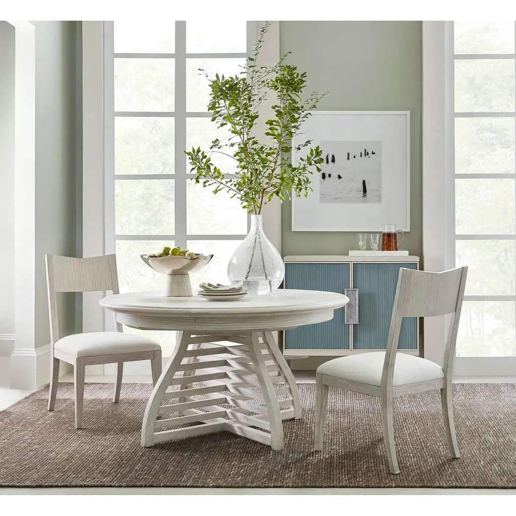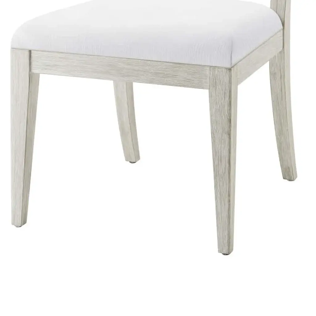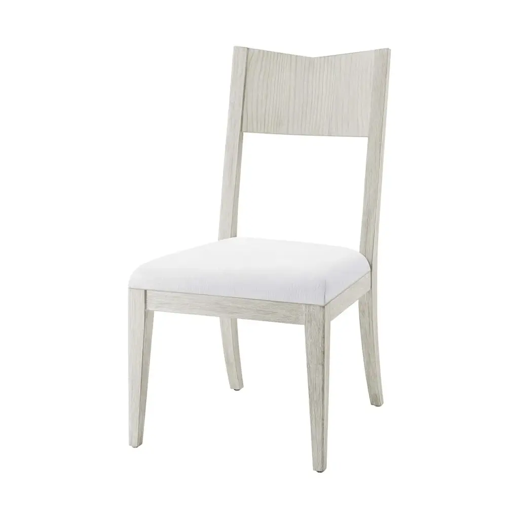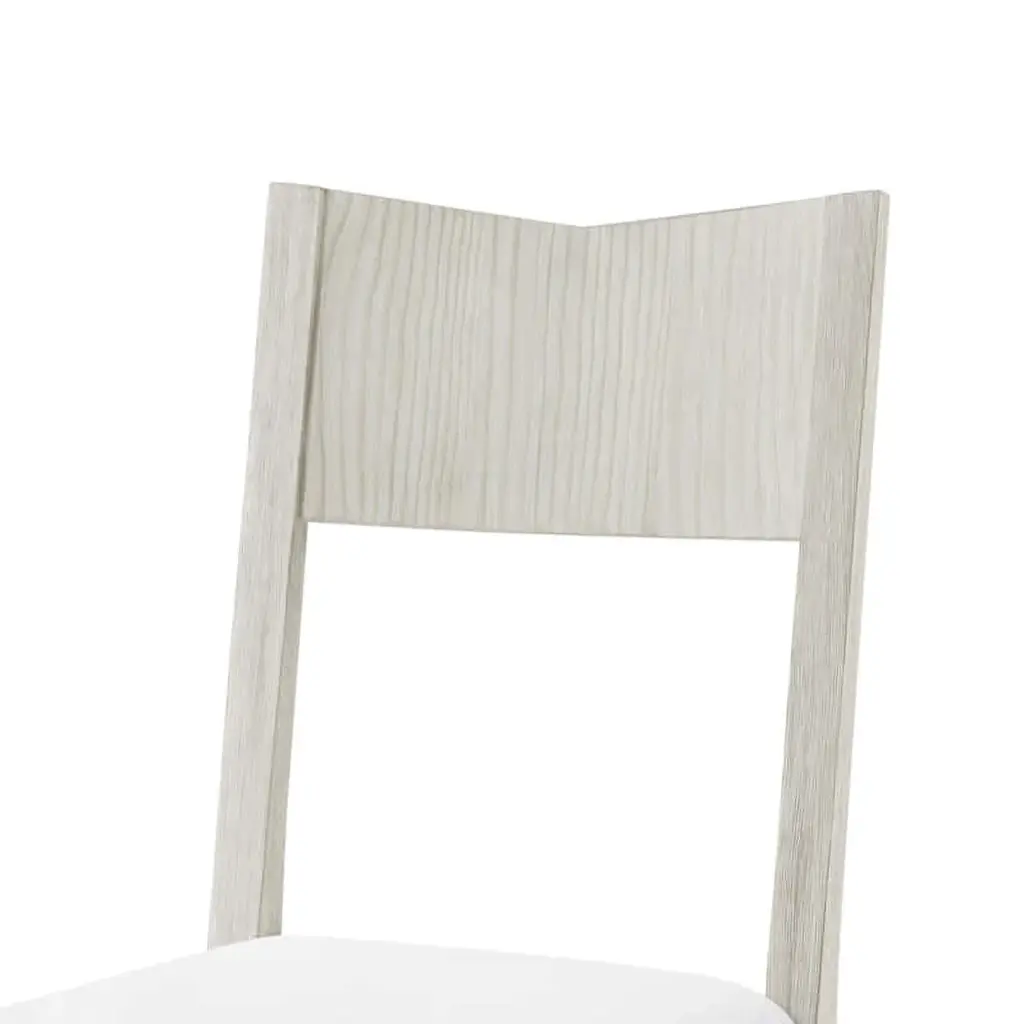 Modern painted dining chair, designed with a beveled back, incredibly comfortable seat crafted from wire-brushed cerused pine in our Sea Salt finish. Dimensions: 20.5" W x 24.25" D x 38" H Shown in Sun Bleached-UP6137 fabric