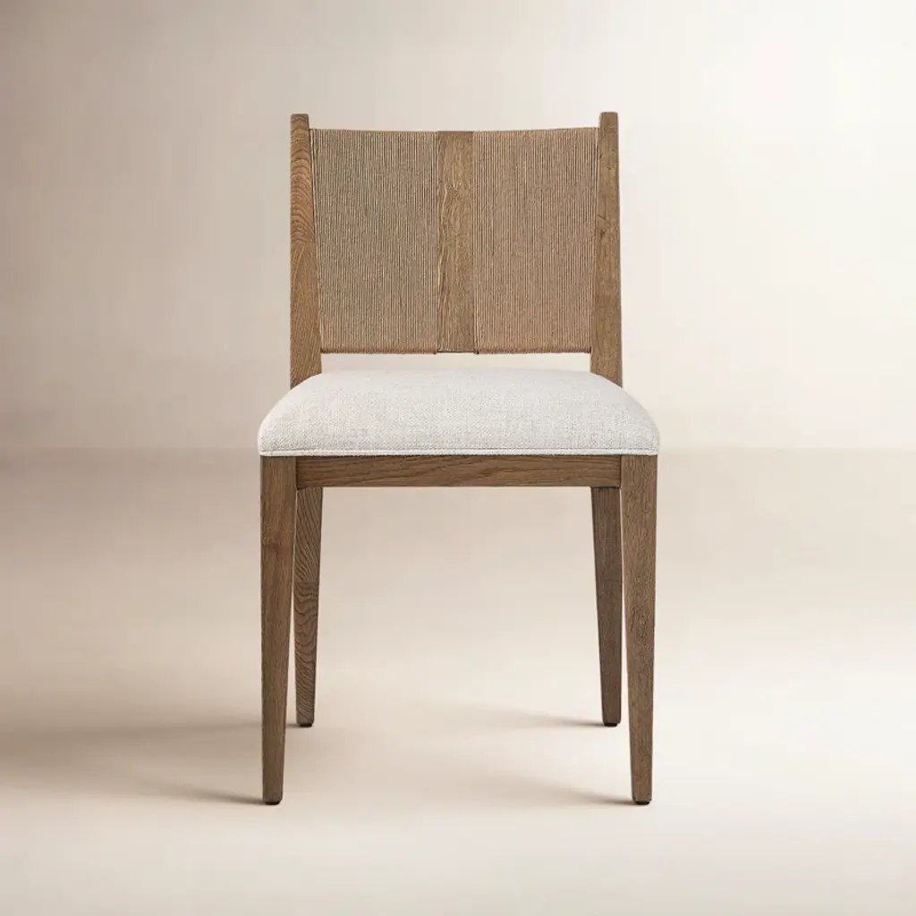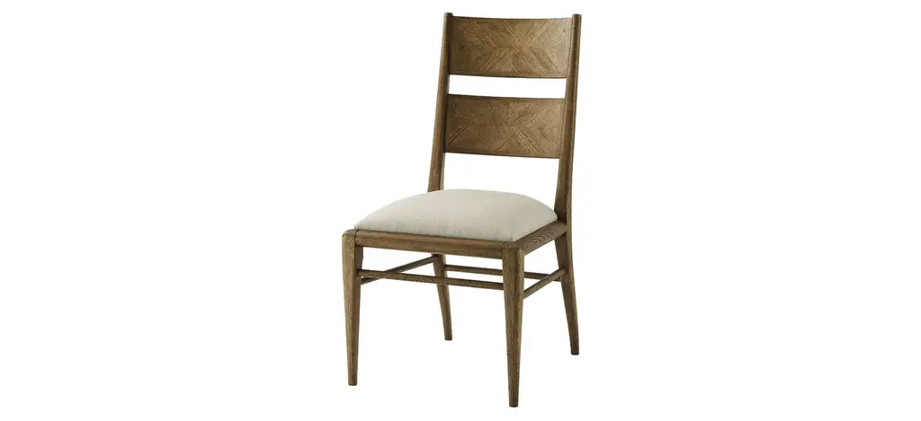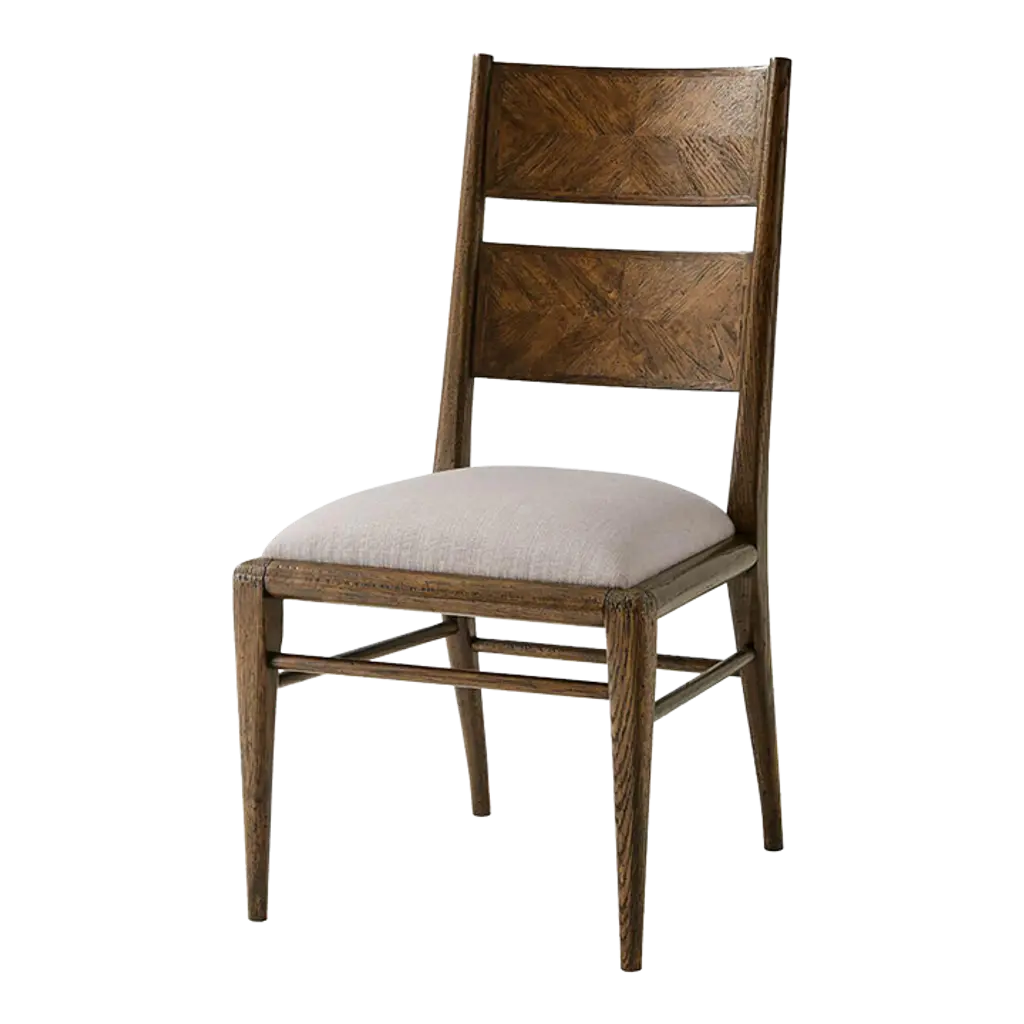 A dark oak parquetry dining chair with tapered oak legs. Its upholstered seat is constructed with a top and mid-rail bar joined by stretchers. Shown in Dusk FinishShown in Linen-UP5409 FabricDimensions19.5" W x 22.5" D x 37.25" H Seat Height 19.25" H.