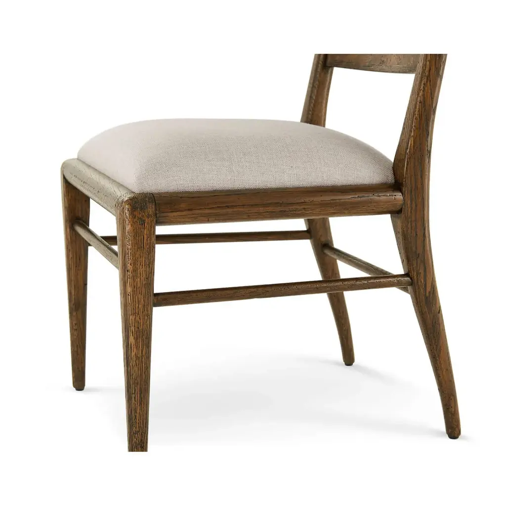 A dark oak parquetry dining chair with tapered oak legs. Its upholstered seat is constructed with a top and mid-rail bar joined by stretchers. Shown in Dusk Finish Shown in Linen-UP5409 Fabric DIMENSIONS 19.5" W x 22.5" D x 37.25" H Seat Height 19.25" H