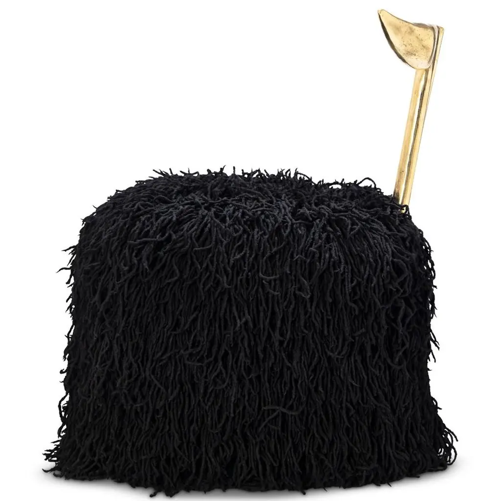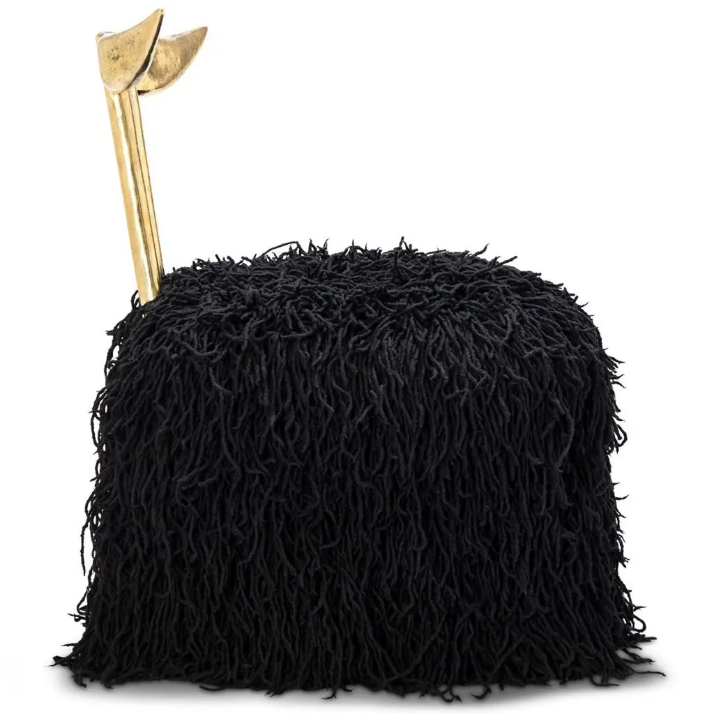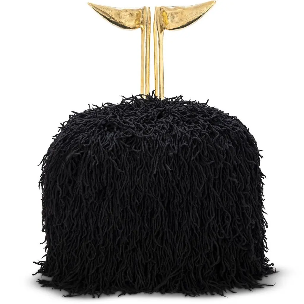The Strelitzia bespoke, dining chair is designed by Egg Designs and manufactured in South Africa. This luxury dining chair has a backrest of solid sand-cast brass; the method of sand-casting creates a beautiful pitted surface. Each chair is single cast; therefore, each chair is unique. The brass sections are then hand-polished, a task that takes in excess of 100 hours. The rich gold frames have been paired with a handmade rolled wool, naturally dyed black, which creates a shaggy appearance reminiscent of the 70's.The Strelitzia dining chair is both modern and classical at the same time. A handmade, bespoke and crafted piece, the brass sections cusp your back to ensure that the chair is comfortable. The chair is fitted onto castors to allow for easy movement.