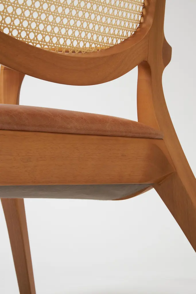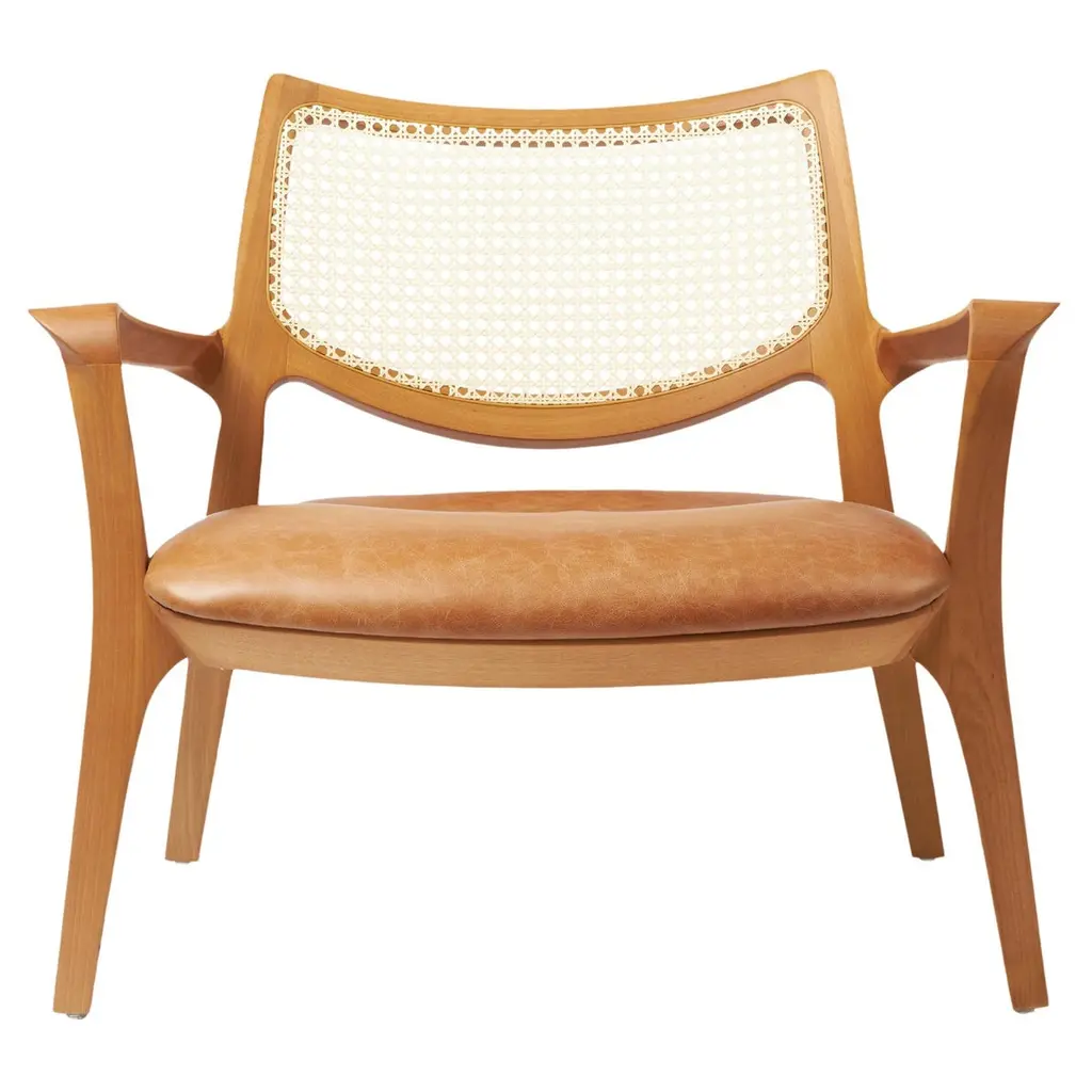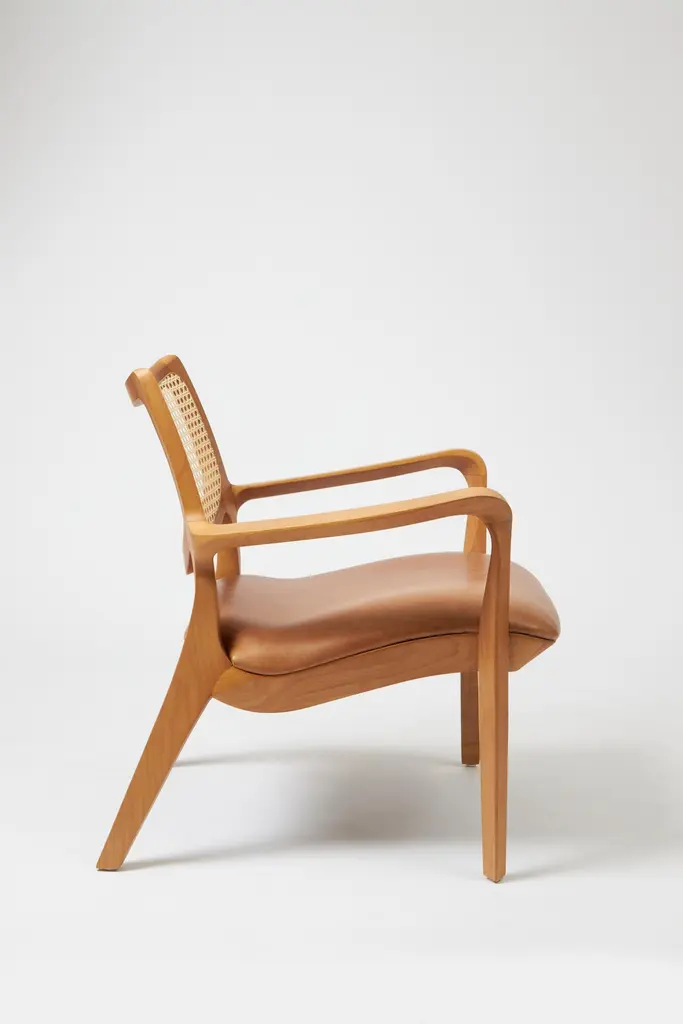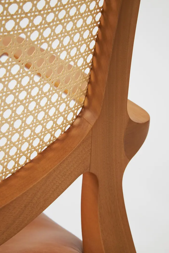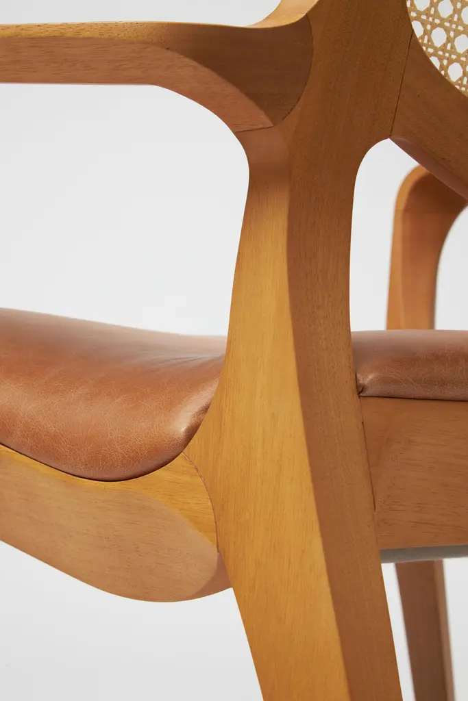 Modern Style Aurora Armchair Sculpted In Solid Wood, Caning Back, Leather Seat