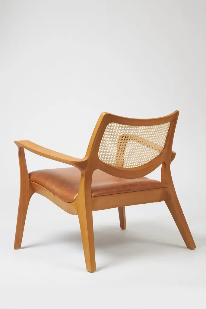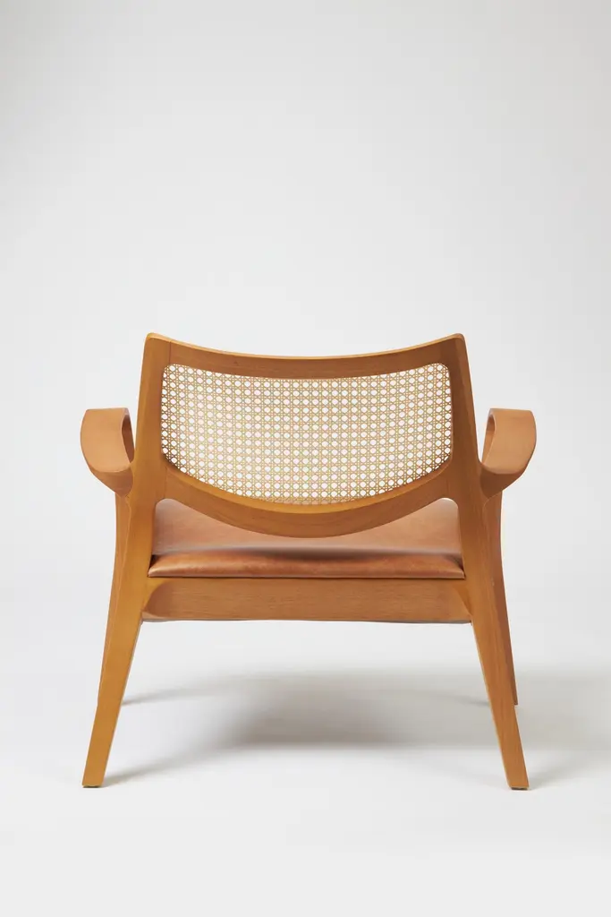 Modern Style Aurora Armchair Sculpted In Solid Wood, Caning Back, Leather Seat
