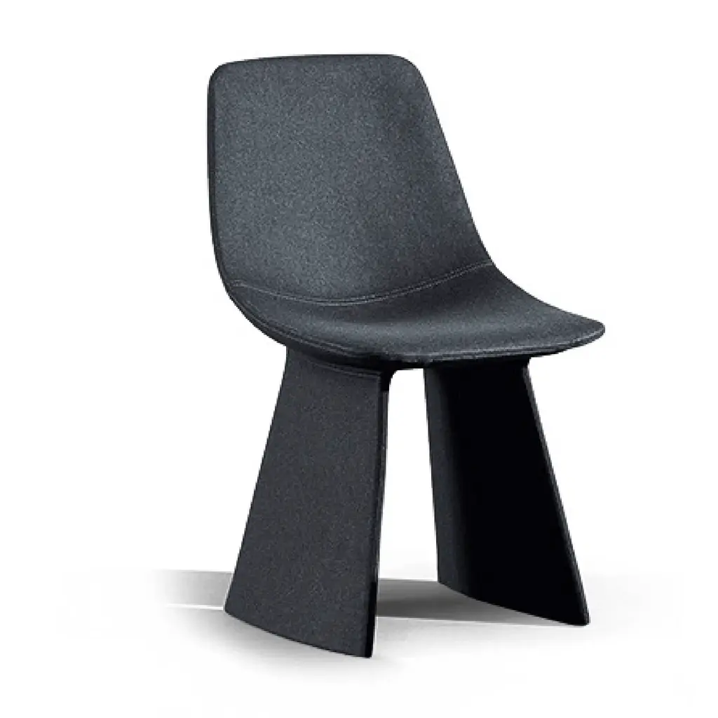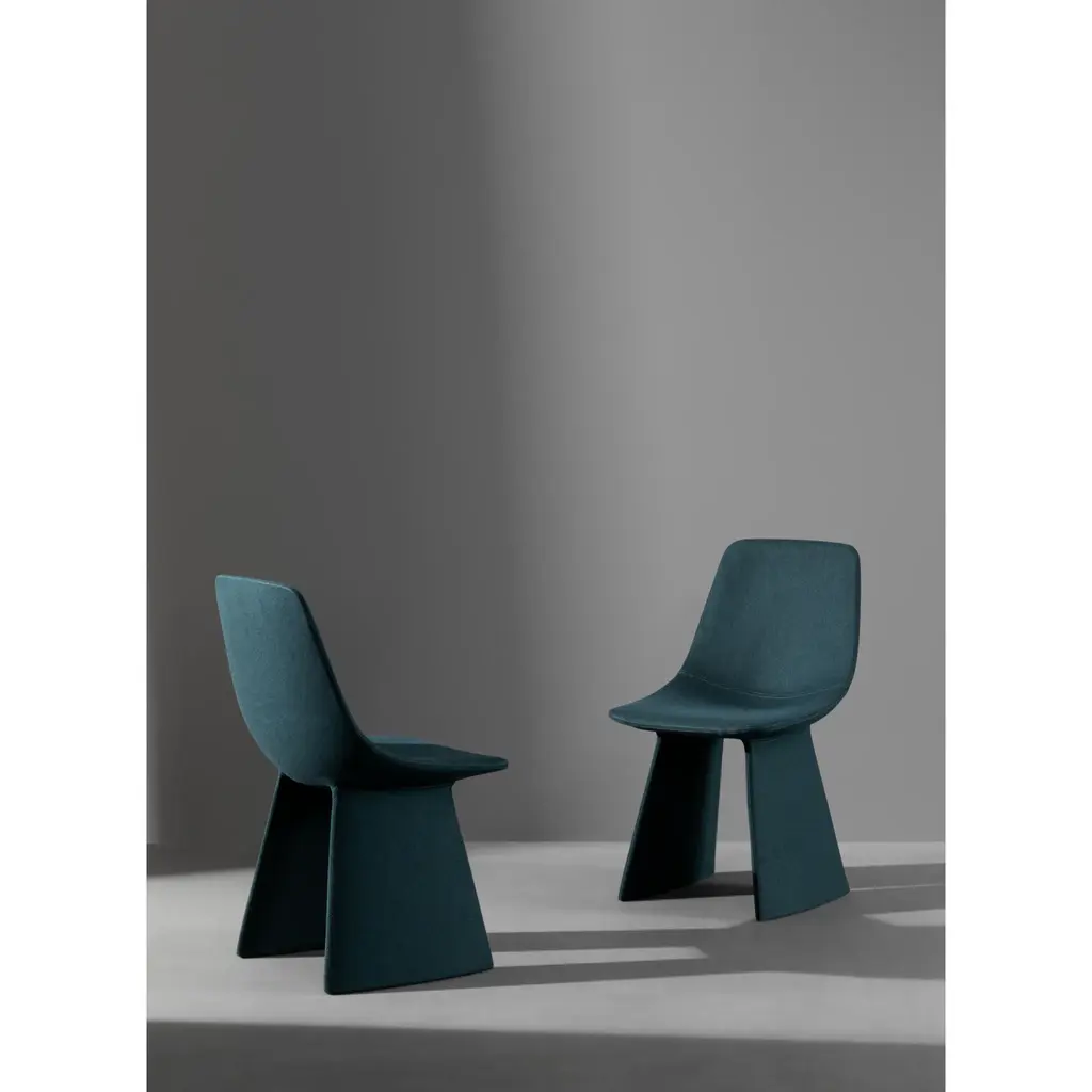 The Agea chair, one of the exquisite examples of upholstered modern dining chairs, is characterized by its striking legs which seem rooted to the ground, as if to leave their mark in the space where they are placed. The legs support the padded body like two buttresses, giving the seat stability, charm, and an essential nature. The body and legs are covered in a single leather eco-leather or fabric material, which reinforces the image of the Agea chair.