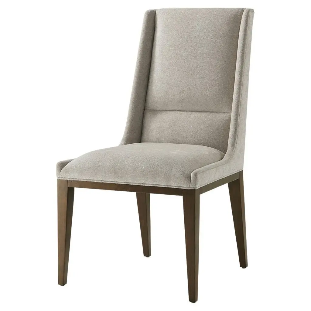 Modern upholstered dining side chair with solid beech and a dark Macadamia finish. With a scoop barrel back and tightly upholstered seat cushion on clamped tapering legs.Dimensions:20.25" W x 25.5" D x 36.75" HSeat height - 19.25"Shown in linen-UP5409 fabricTrim: Welting.