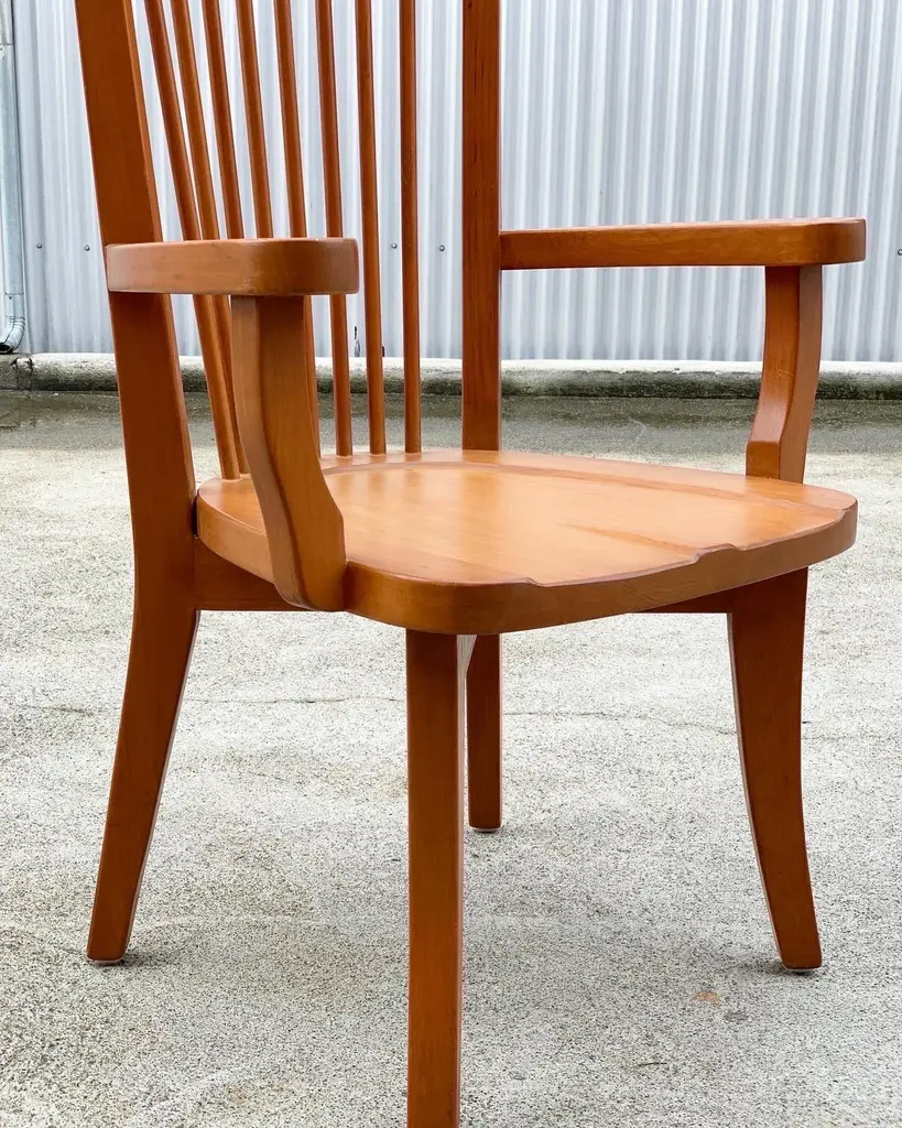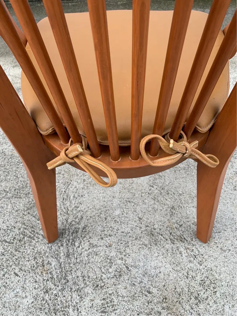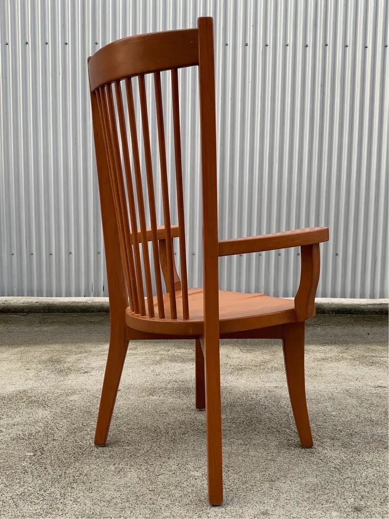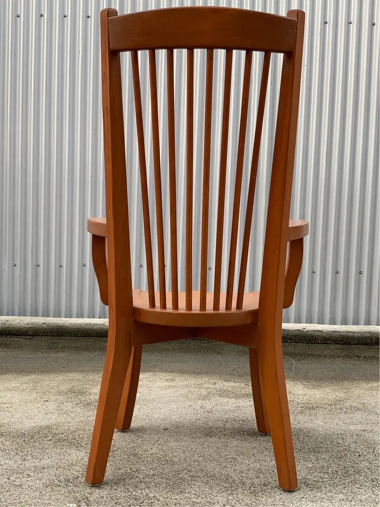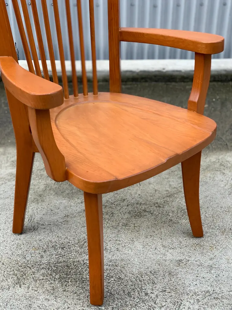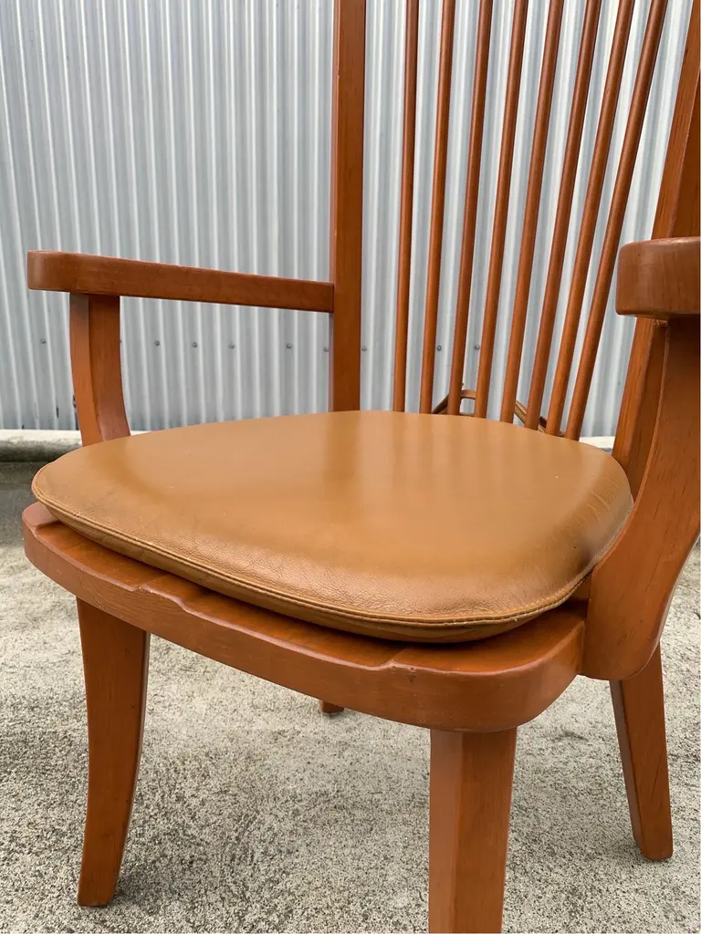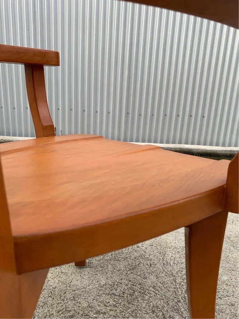 Dining arm chair by internationally renowned architect, Ricardo Legarreta. Used in countless projects and widely photographed and documented. These chairs have both the contours and curves characteristic of Legoretta’s designs, as well as the linear plains and columnar verticality Legarreta is known for. Constructed of solid, oak, and pleasing in weight and balance of comfort. Original cognac leather seat pads in excellent condition as well.
