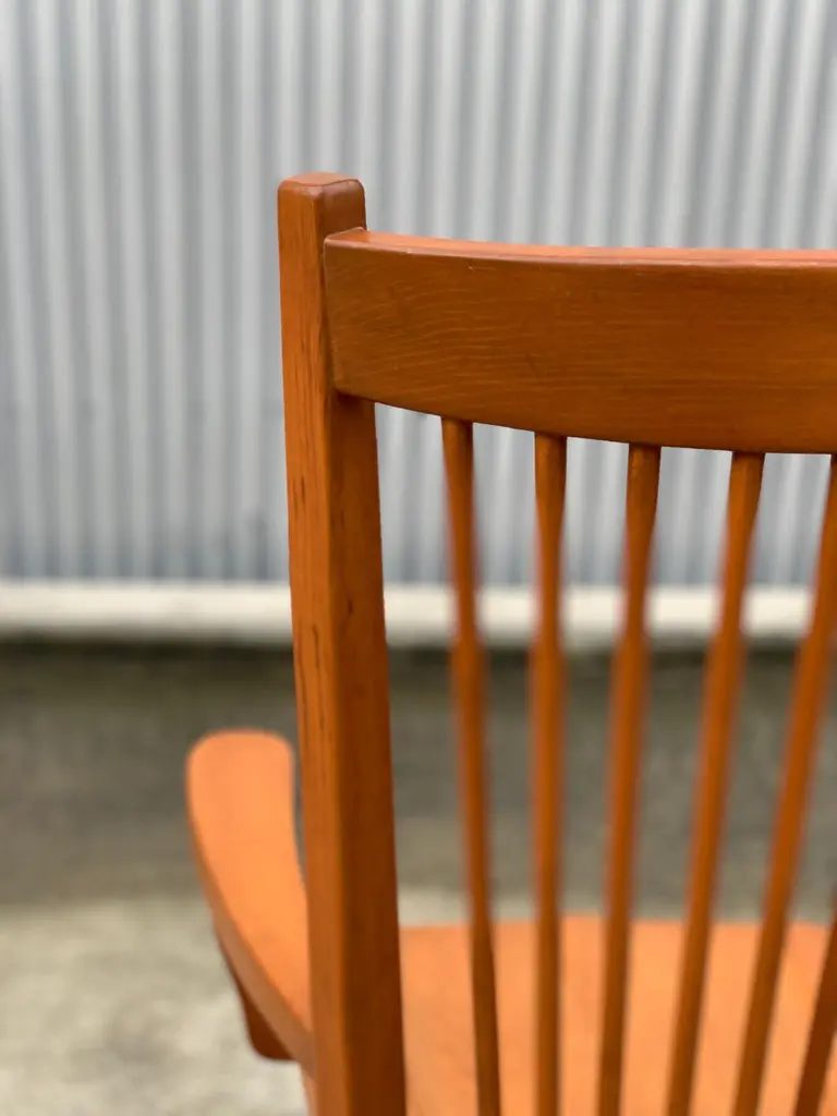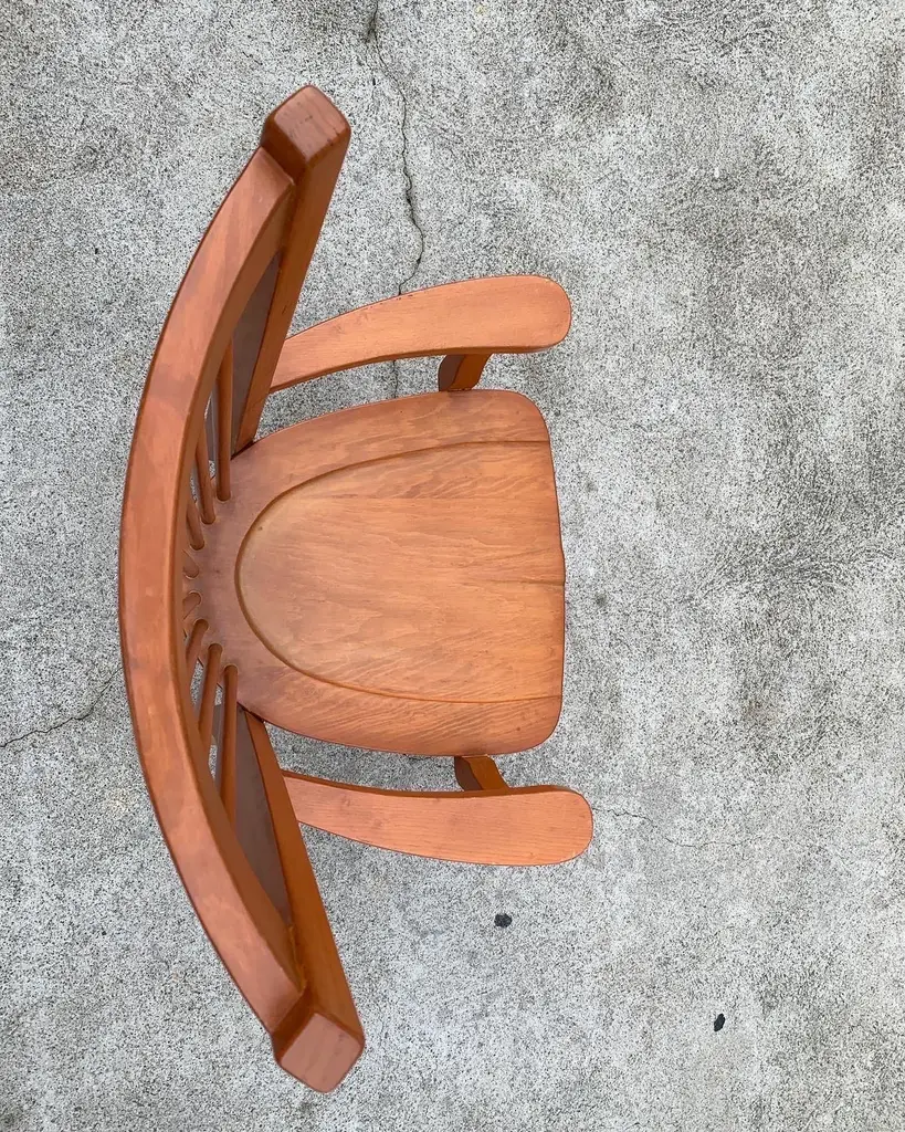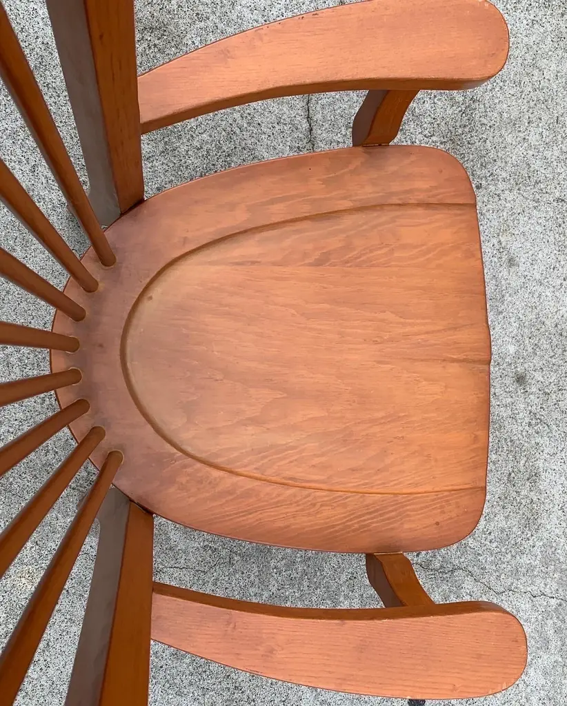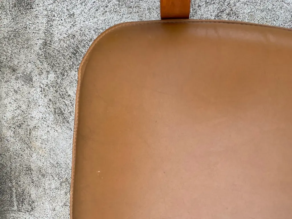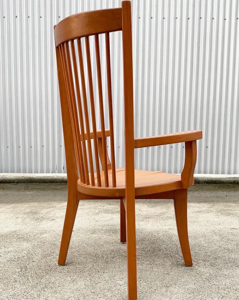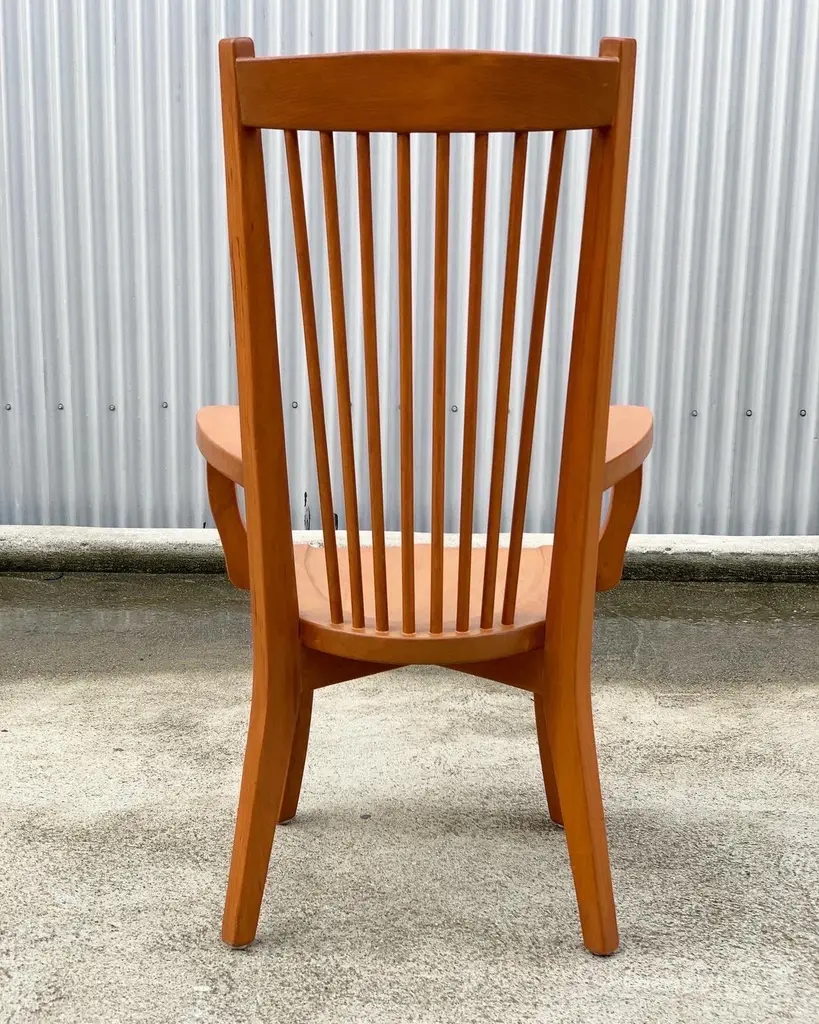 Dining arm chair by internationally renowned architect, Ricardo Legarreta. Used in countless projects and widely photographed and documented. These chairs have both the contours and curves characteristic of Legoretta’s designs, as well as the linear plains and columnar verticality Legarreta is known for. Constructed of solid, oak, and pleasing in weight and balance of comfort. Original cognac leather seat pads in excellent condition as well.