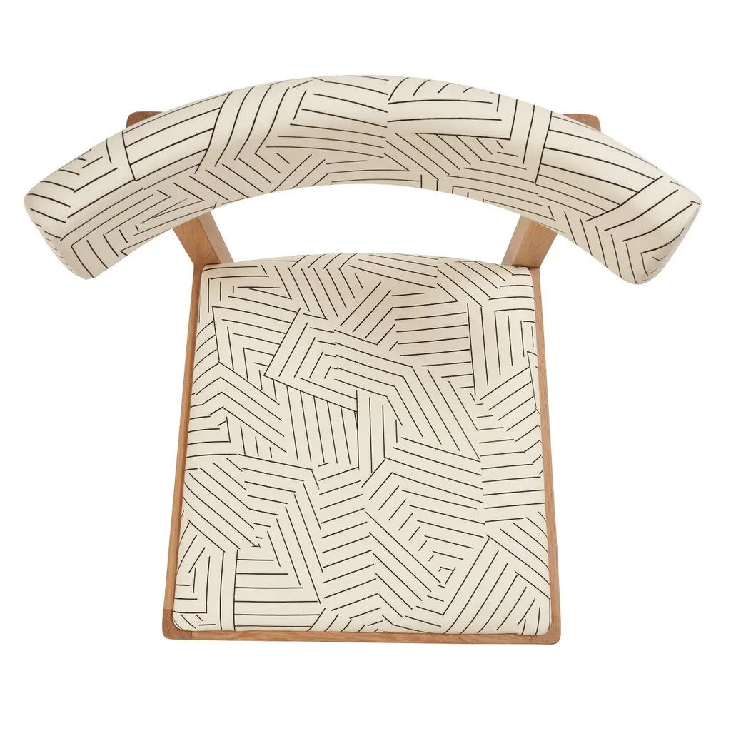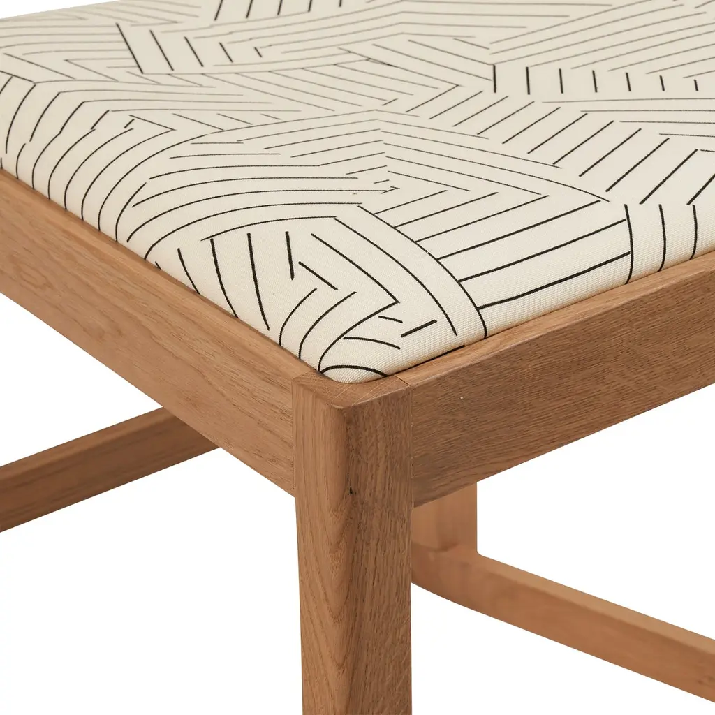 Combining an upholstered seat and back with the surprise of jauntily angled legs, the Mokki Dining Chair was designed by Salla Luhtasela and Wesley Walters of Finland’s Studio Kaksikko. Beautifully finished to highlight the natural qualities of solid oak, this chair’s clean and uncomplicated lines evoke the relaxed mood of Finnish summer cottages. Meticulously handcrafted in Italy, Mokki’s elegant economy of design belies its lasting construction. Upholstered in Schumacher's Deconstructed Stripe Indoor/Outdoor fabric by Miles Redd, a graphic collage of stripes is an homage to the legendary decorator Albert Hadley.