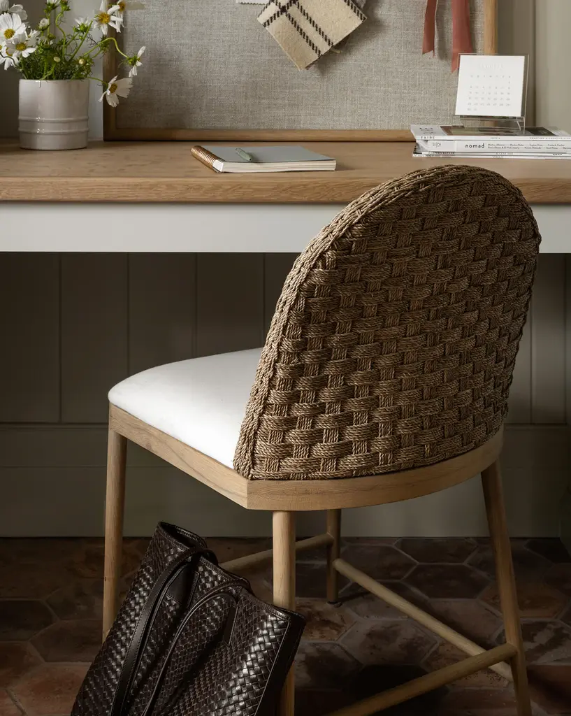 From the slightly tapered legs to the structural base details, we designed the Molly Dining Chair with effortlessly sophisticated style in mind. With a base crafted from solid oak, kiln-dried for durability and quality, this chair has all the makings of a modern staple. The textural woven back plays against the crisp white cushion, for a look that's casual, approachable and unique all at the same time.