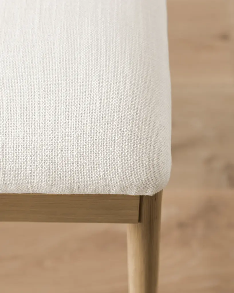 From the slightly tapered legs to the structural base details, we designed the Molly Dining Chair with effortlessly sophisticated style in mind. With a base crafted from solid oak, kiln-dried for durability and quality, this chair has all the makings of a modern staple. The textural woven back plays against the crisp white cushion, for a look that's casual, approachable and unique all at the same time.