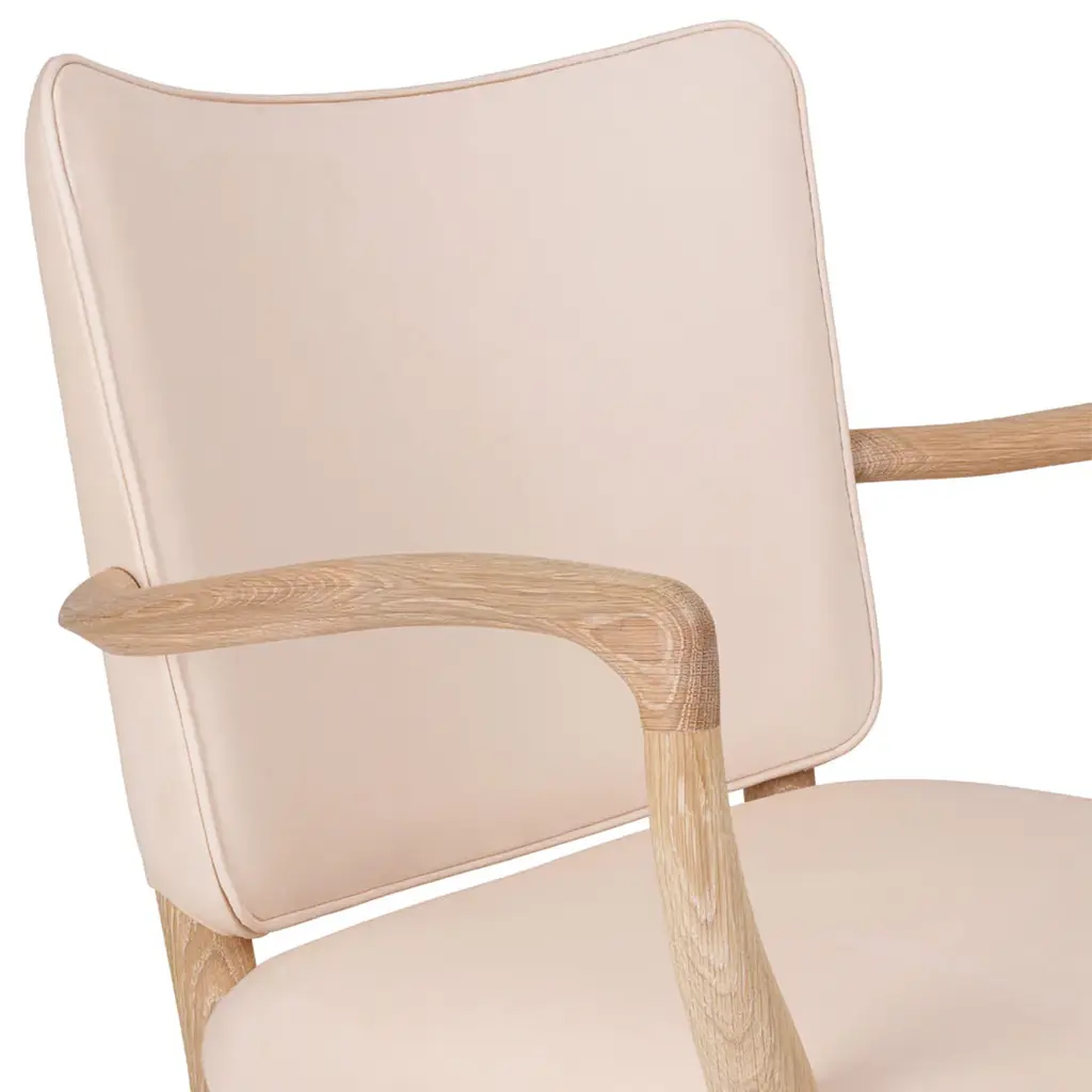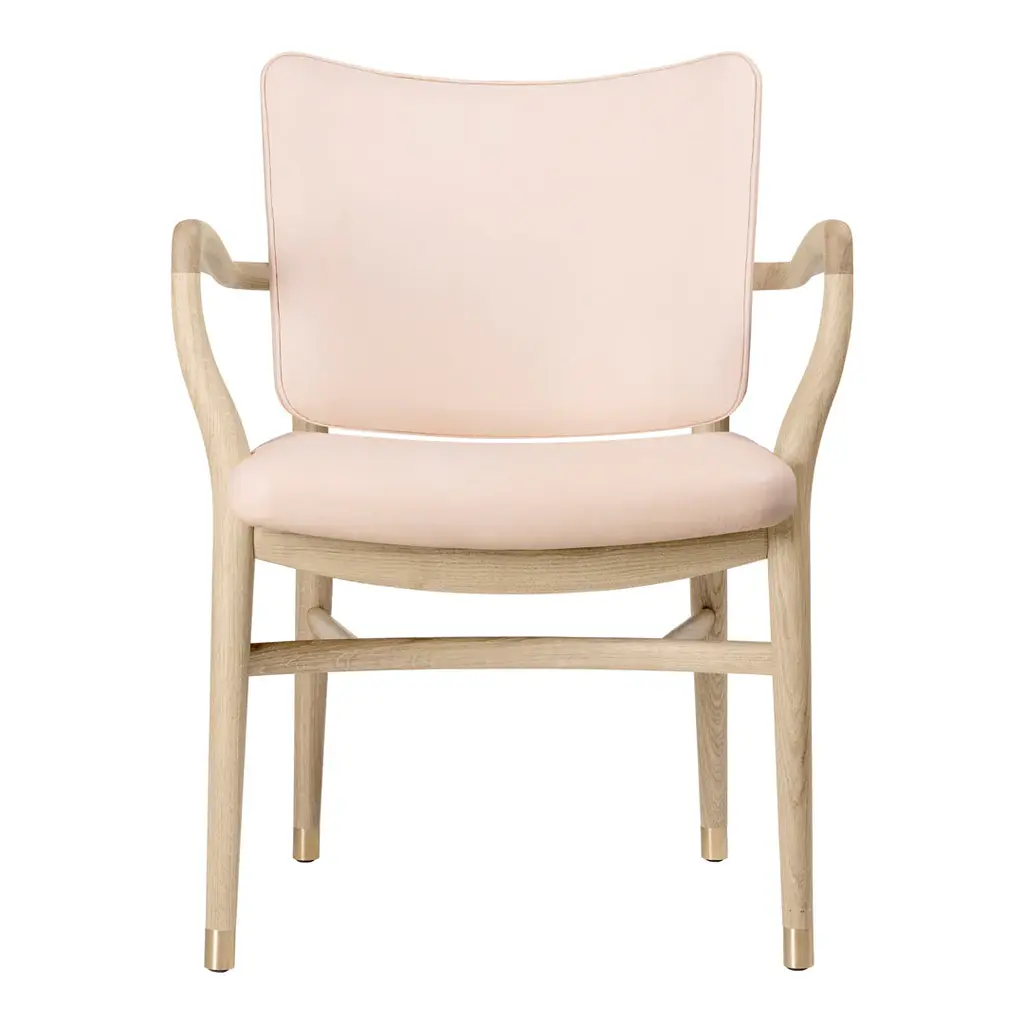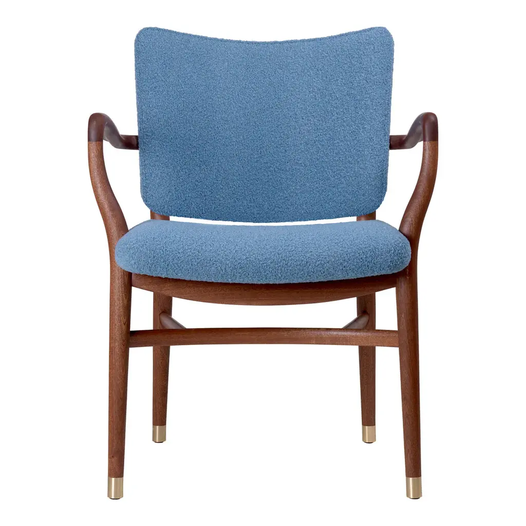 The VLA61 Monarch Chair is named after the majestic Monarch butterfly, and the name is a tribute to the architect's keen interest in butterflies, which he diligently studied throughout his life. With its generous upholstery, curved armrests, and organic, teardrop-shaped curvatures of the bars, the chair embodies an artistic expression that is light and sumptuous at the same time. Details such as the small brass feet and hand-polished joints testify to Lauritzen's consistent design signature.