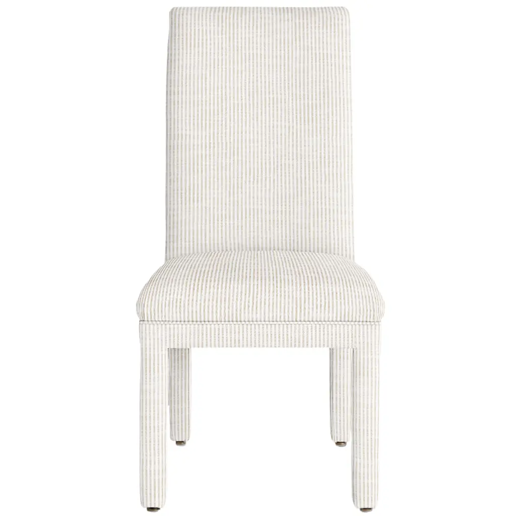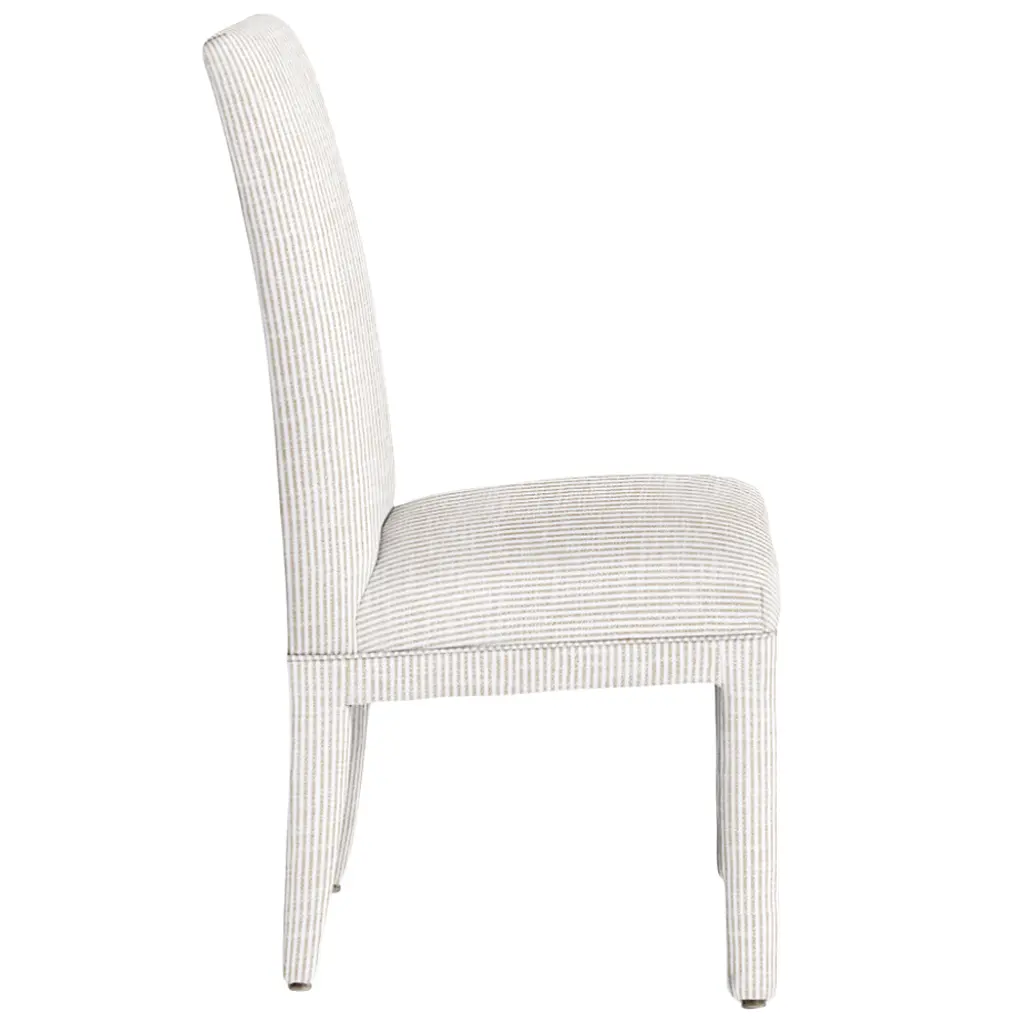 Exclusive to One Kings Lane: This elegant fully upholstered dining chair features a tight seat and tight back with an upholstered leg. It is upholstered in Inside Out, an eco-friendly high-performance fabric that repels stains, spills, bacteria, mold and offers UV fading characterisitics. Constructed of an engineered hardwood-laminate frame and a Pirelli Webbed suspension system which ensures lasting comfort and support. Each piece is handcrafted by skilled artisans in High Point, NC and offers a lifetime warranty on the frame and suspension system.