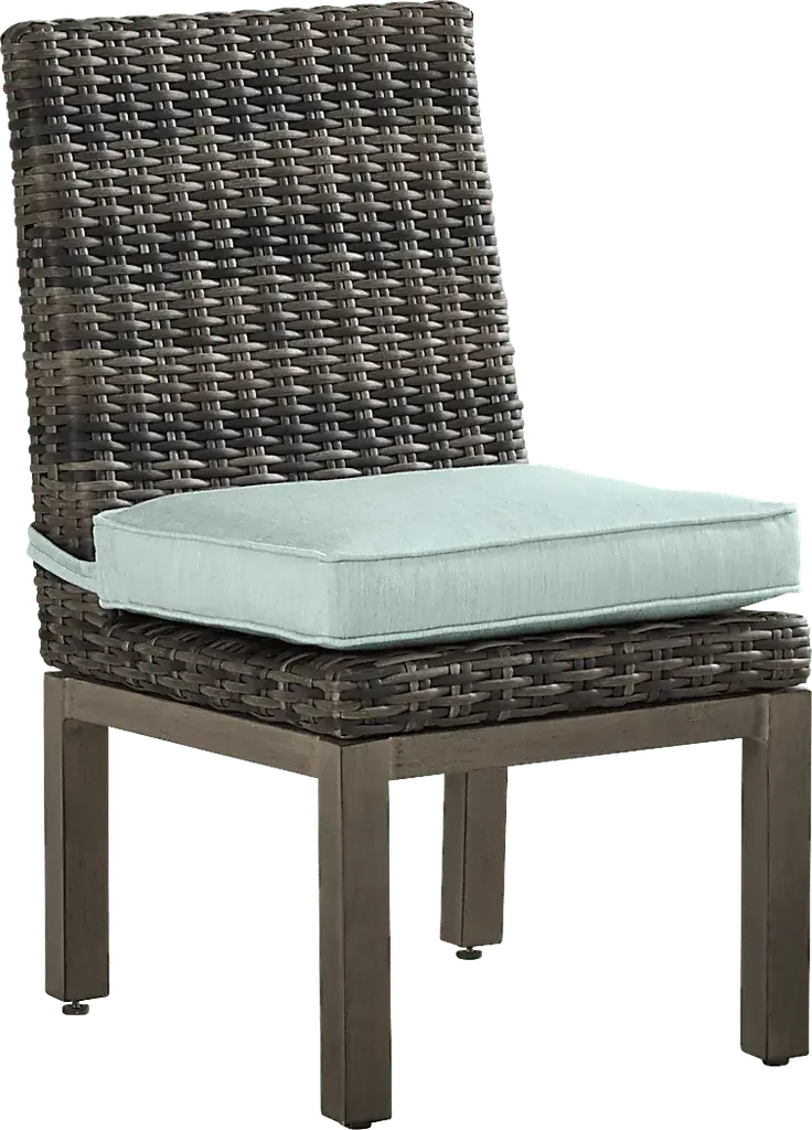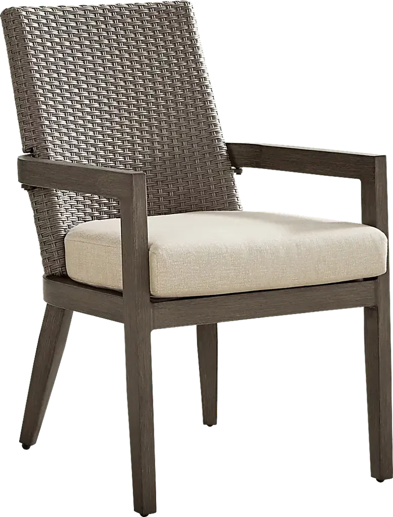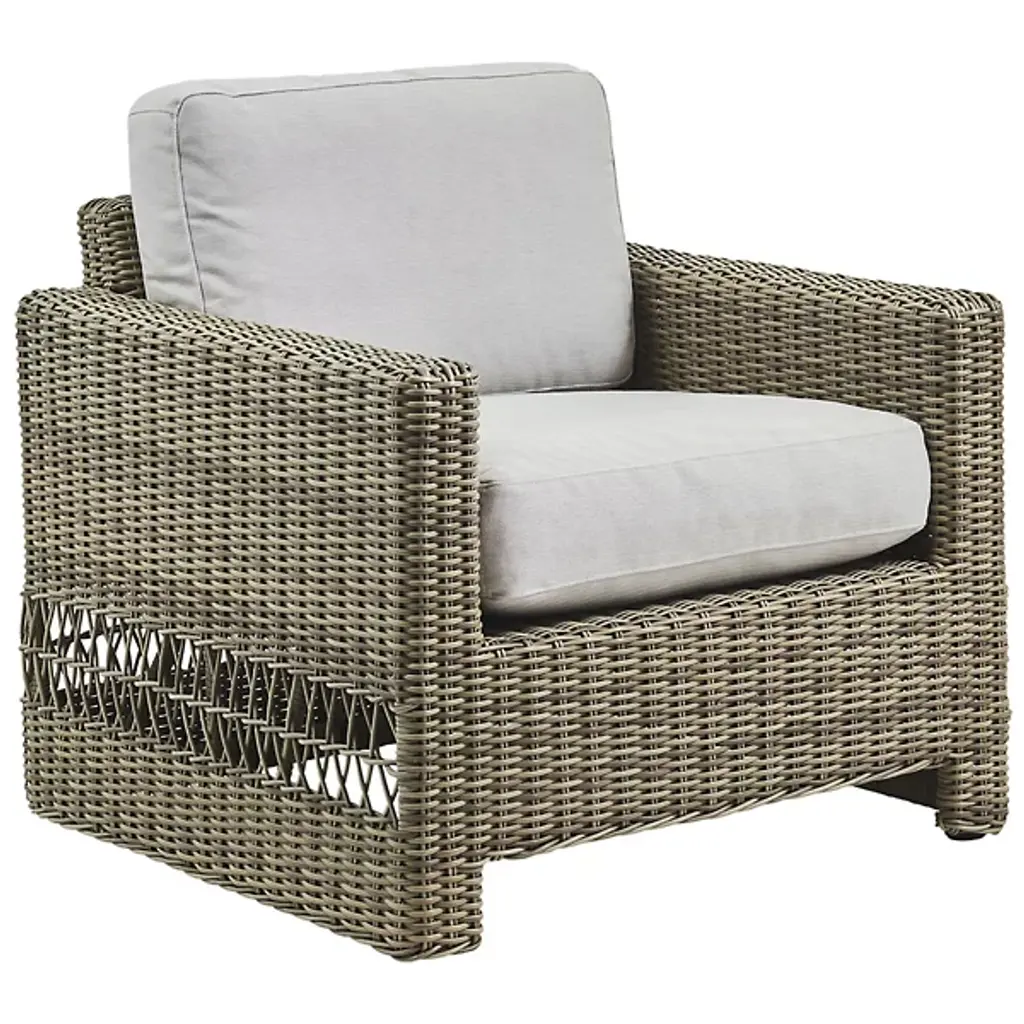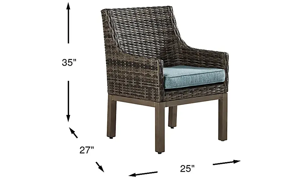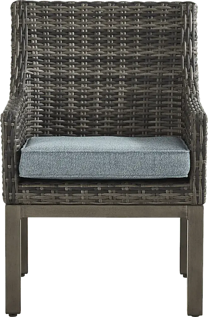The Montecello outdoor dining collection from Cindy Crawford Home beautifully combines casual beachside living and contemporary style. Showcasing woven wicker in a gray finish, this arm chair boasts a soft azure cushion in a durable outdoor fabric for lasting enjoyment, mold and mildew resistance, and UV-resistant color. Select cushion colors available in Sunbrella fabric.