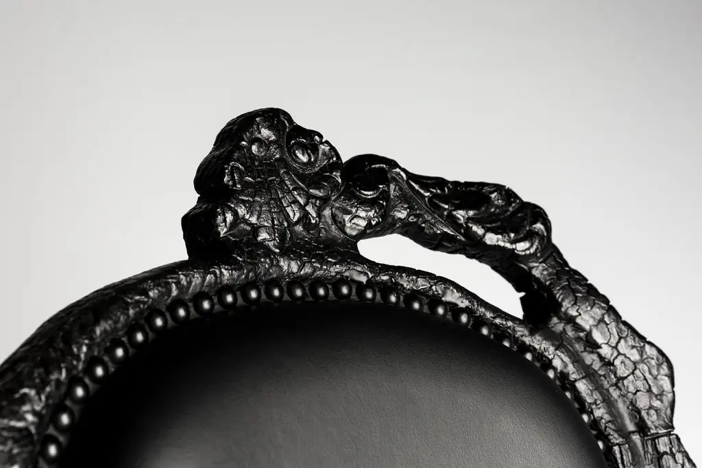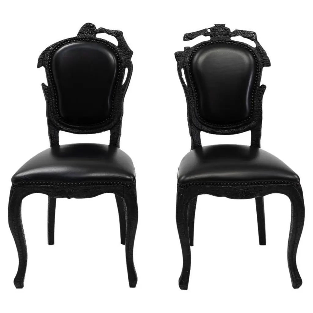 Don't burn the diner — burn the dining chair! The beauty and character of burned wood is now captured in a long lasting material, creating the strange sensation of sitting on burnt furniture Maarten Baas interpreted his fascination for the element fire with a groundbreaking approach. Capturing the burning flames into the solidity of wood. Each chair is unique due to this exceptional production process. Just like the Phoenix, the Smoke objects are reborn from their ashes, gaining new vitality and beauty in a very unusual way.Additional information:Material: Burnt wood finished with epoxy resin, fire retardant foam, leather upholstery.Upholstery: Abbracci, Black - Cat IIFrame finish: Burnt woodDimensions: 48 W x 57 D x 106 H cmSeat height: 51 cm.