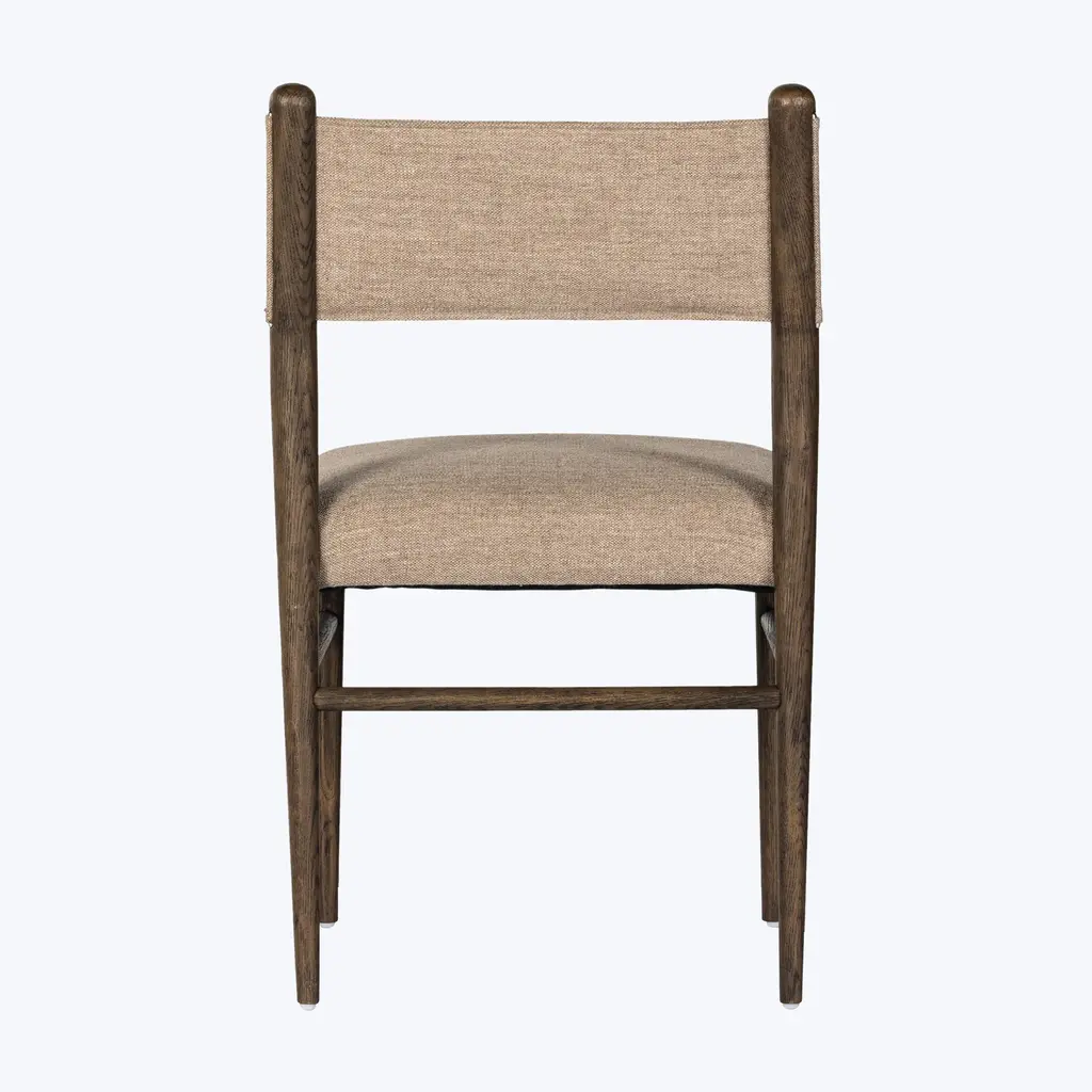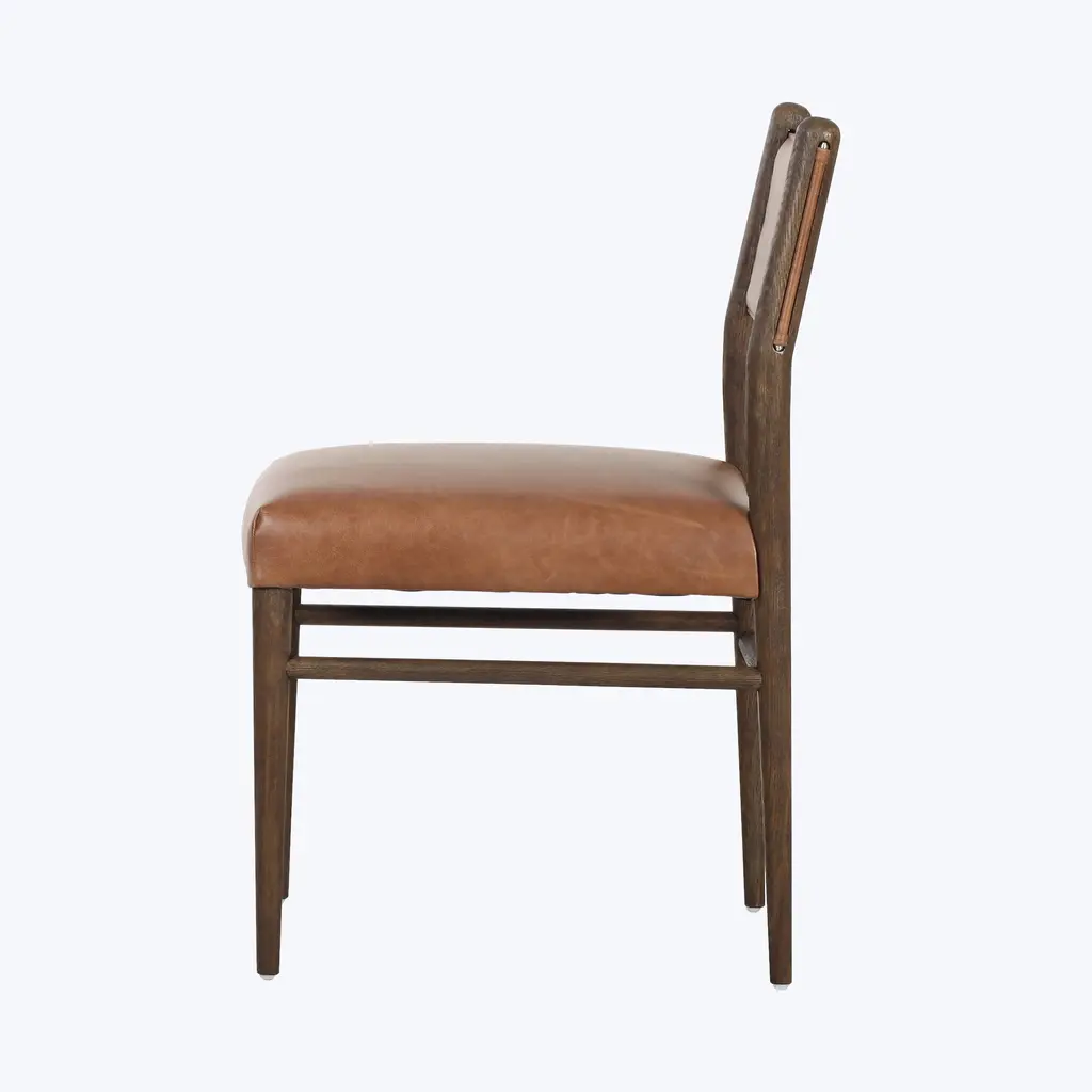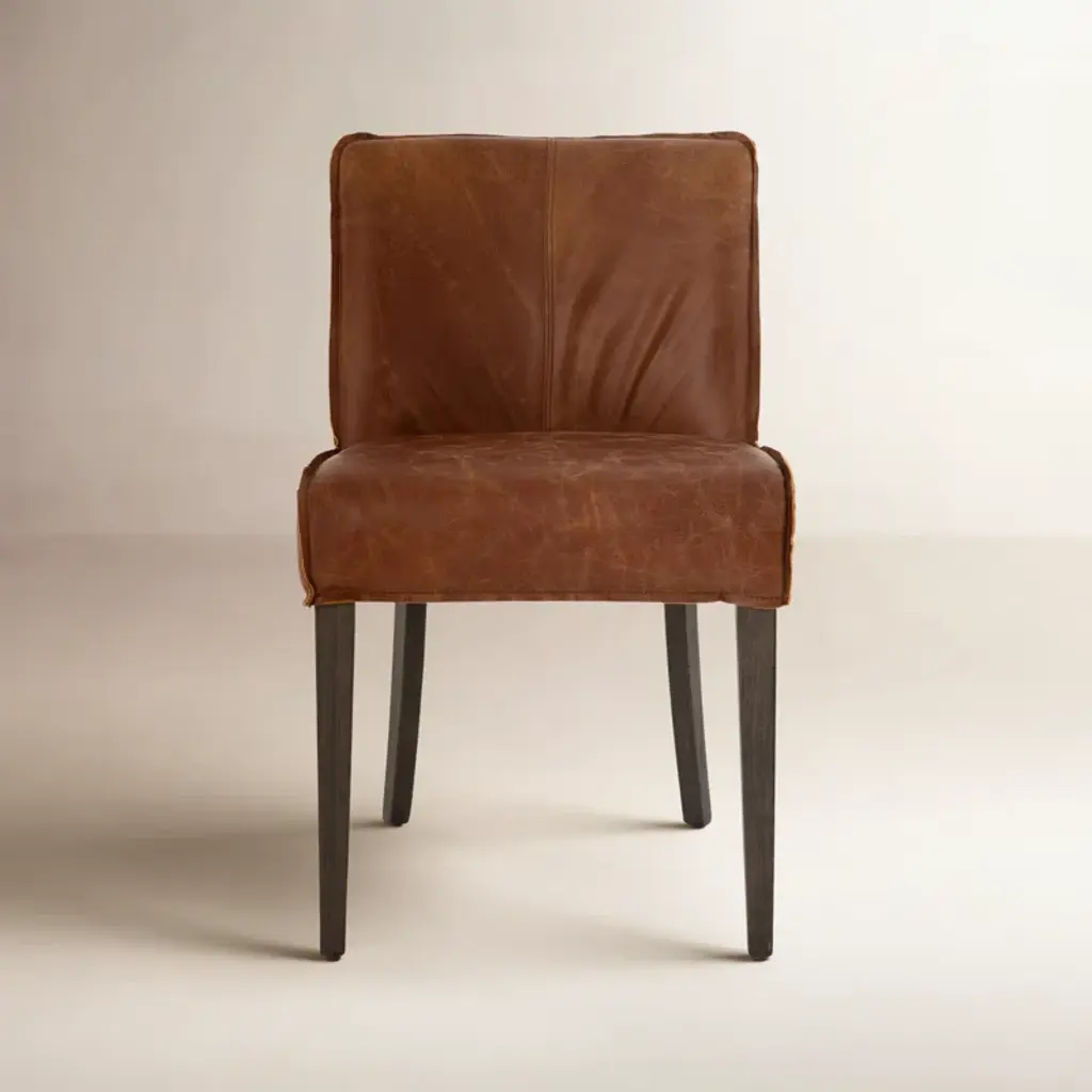 The Four Hands Morena Dining Chair combines modern design with traditional craftsmanship. With dimensions of 20" W x 22.5" D x 34" H, and a seat height of 20", the Morena Dining Chair is designed for both style and functionality. Featuring a solid oak frame with rounded dowel legs, this chair exudes timeless charm while offering a contemporary twist. This dining chair is offered in a warm, chestnut leather and linen and is complemented by an S-spring seat construction for added support. Its neutral color palette of leather and warm oak makes it easy to integrate into various dining settings.Whether paired with a rustic or modern table, this versatile chair enhances any dining room with its sleek lines and comfortable seating. Crafted with quality materials in China, this chair is built to last and adds a refined, yet approachable aesthetic to your home.