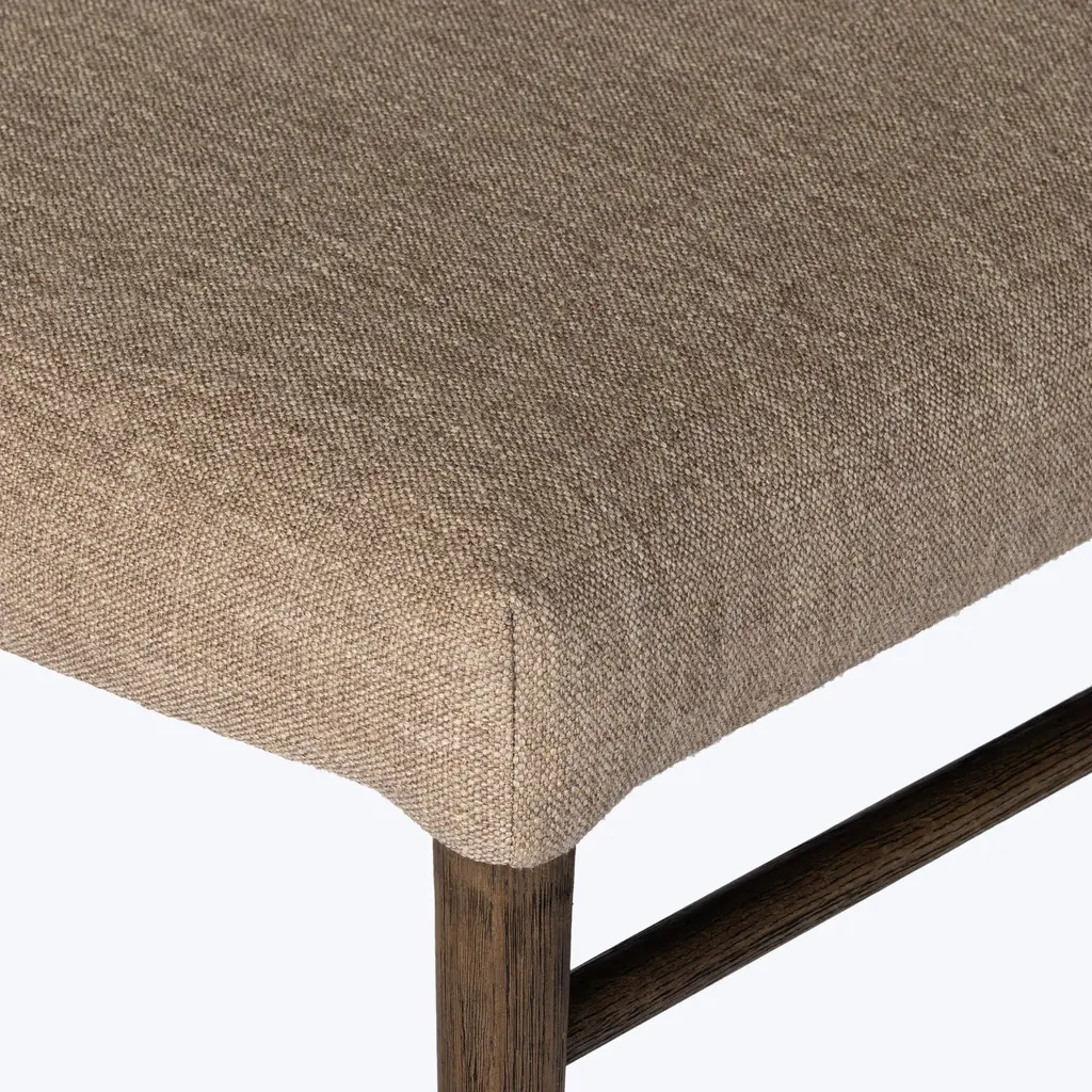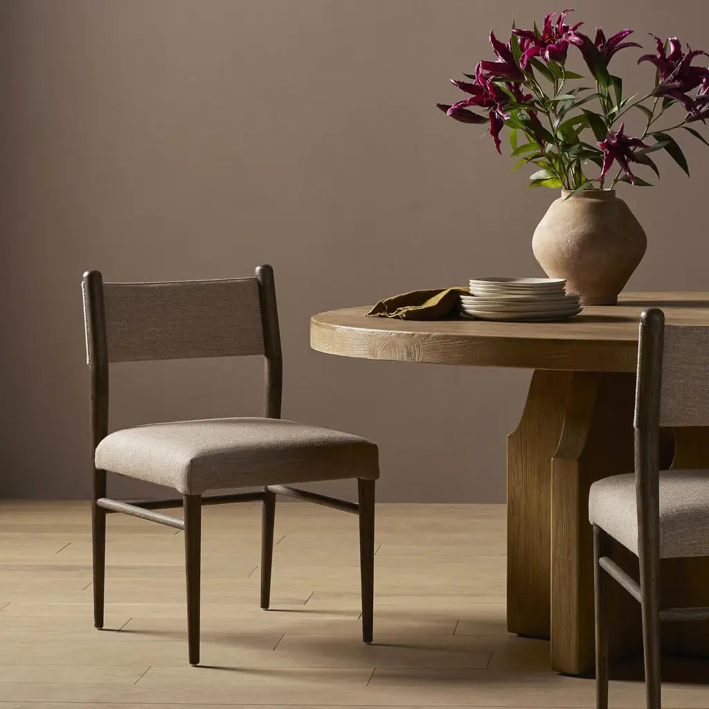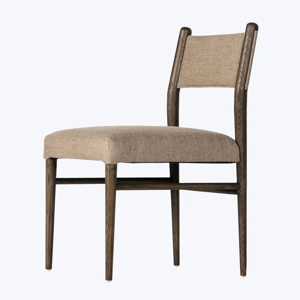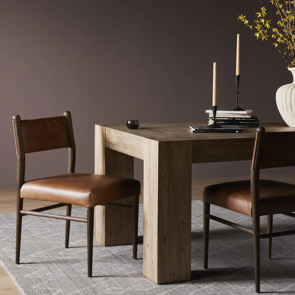 The Four Hands Morena Dining Chair combines modern design with traditional craftsmanship. With dimensions of 20" W x 22.5" D x 34" H, and a seat height of 20", the Morena Dining Chair is designed for both style and functionality. Featuring a solid oak frame with rounded dowel legs, this chair exudes timeless charm while offering a contemporary twist. This dining chair is offered in a warm, chestnut leather and linen and is complemented by an S-spring seat construction for added support. Its neutral color palette of leather and warm oak makes it easy to integrate into various dining settings.Whether paired with a rustic or modern table, this versatile chair enhances any dining room with its sleek lines and comfortable seating. Crafted with quality materials in China, this chair is built to last and adds a refined, yet approachable aesthetic to your home.