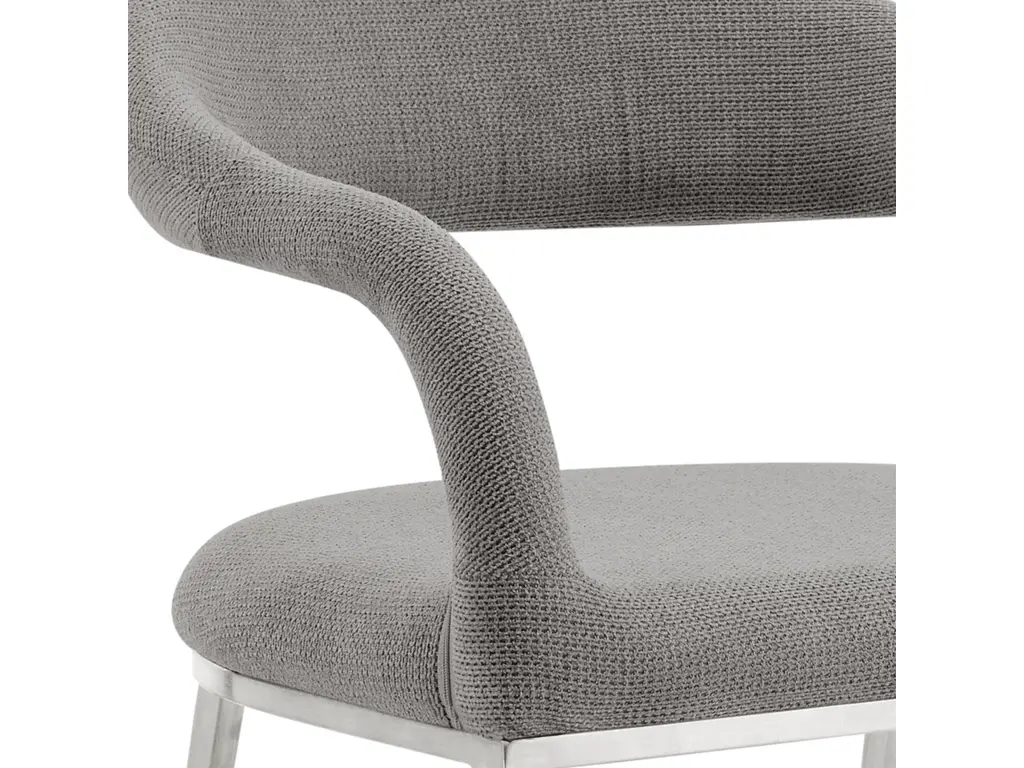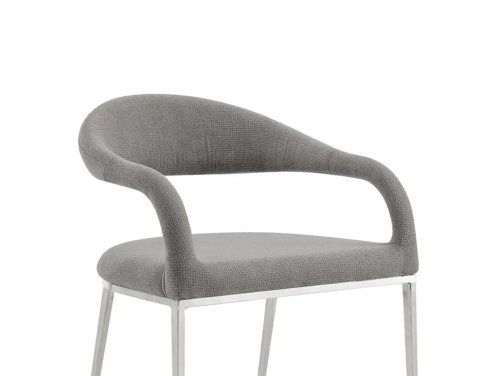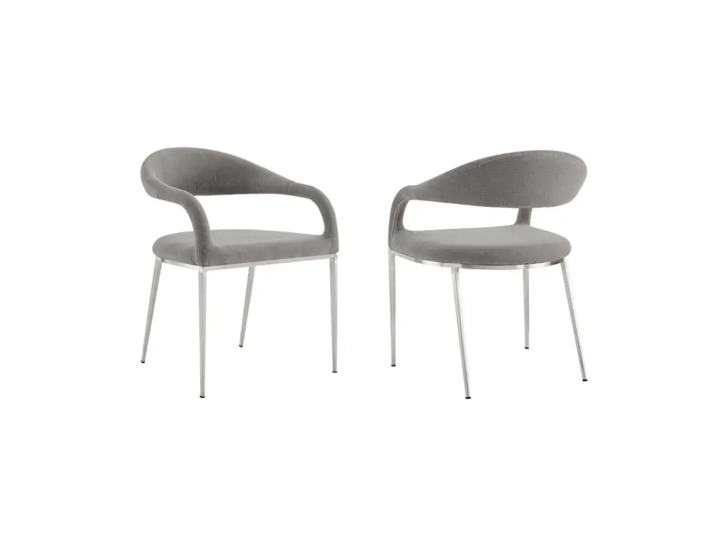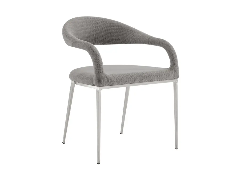 Transform any space with the luxurious charm and comfort of the Morgan Dining Chair in Fabric and Metal - Set of 2 by Armen Living. The cozy yet streamlined profile of our chair offers comfort with a touch of opulence. Its beautifully curved back and seamlessly flowing arms lend refinement to this dining chair and any room you put it in. The back, arms, and seat cushion are fully upholstered to offer hours of comfort. The Morgan chair is covered in performance fabric, which provides easy care and maintenance. Perched on four slender legs, this dining chair serves as a stylish complement to any contemporary or modern room. From casual to formal meals, elevate your eat-in kitchens and dining rooms to the simple elegance of the Morgan Dining Chair. Beyond dining, it can offer a chic and comfortable accent chair anywhere from your living space to your home office. Available as a set of two, the Morgan Upholstered Dining Chair comes in matte black iron with Light Gray, Charcoal, or Blue Fabric, or brushed stainless steel with Light Gray, Charcoal, or Blue Fabric to bring comfort and grace to your home.