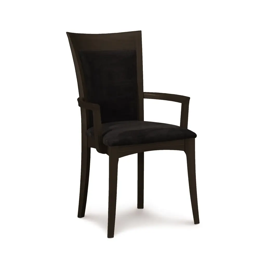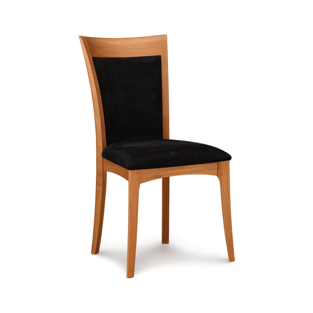 New Shaker style Copeland Sarah Morgan dining chairs in solid American Black Cherry with plush black microfiber upholstered back and seat. Comfortable Shaker dining chairs available in side or arm chair style, designed to wear well with highly durable and luxurious polyester fabric. Best in its class of authentic custom fine dining furniture, this fully upholstered dining chair is destined to be a cherished family heirloom! Sarah Shaker extension table and Sarah Shaker solid top tables also available.Copeland Sarah Shaker is real solid wood fine dining furniture crafted for generations of service in your natural home. Custom handmade to order with solid natural or stained American Black Cherry wood. Clean Shaker style lines and balanced proportions are what the Copeland Sarah dining furniture collection is all about. Handcrafted in Vermont, with sustainably harvested hardwoods, this collection is 100% American made.Base price represents natural cherryShown in natural cherry with onyx microsuedeMatching furniture available in our Audrey Furniture Collection, Catalina Furniture Collection and Sarah Furniture CollectionNatural variations in solid wood and hand applied finishes make each piece unique. Slight grain and finish irregularities tell you that the furniture has been crafted from solid wood and are considered hallmarks of quality.
