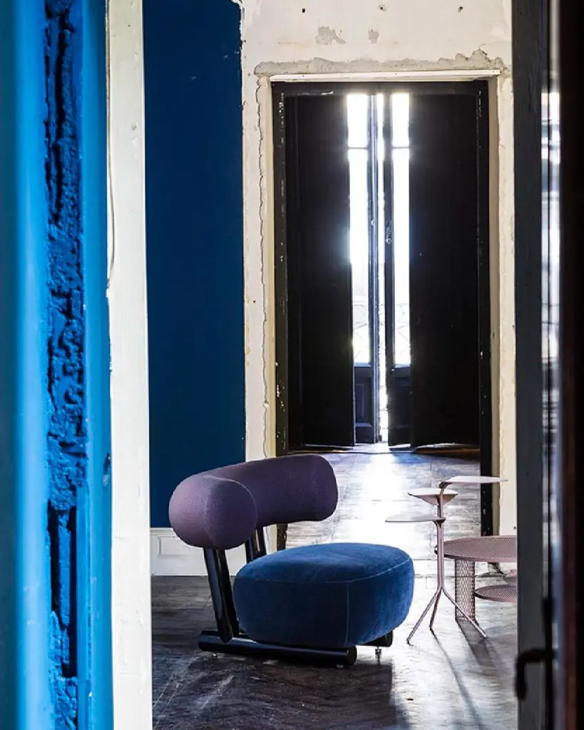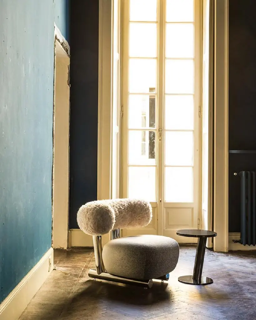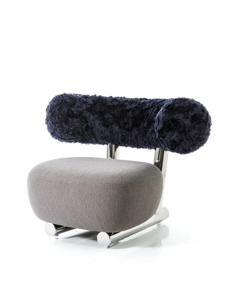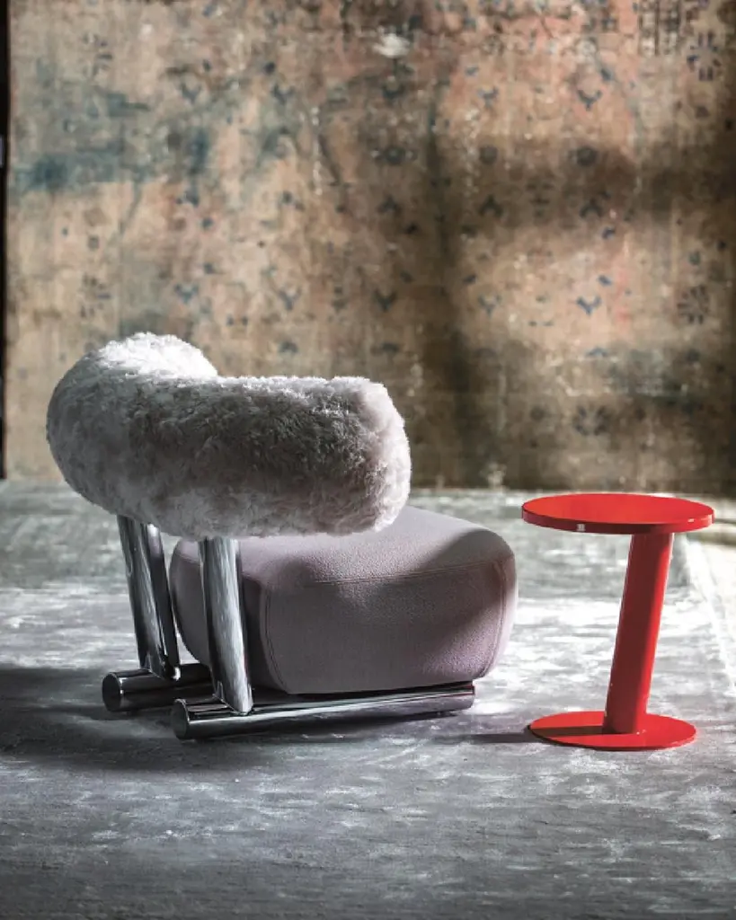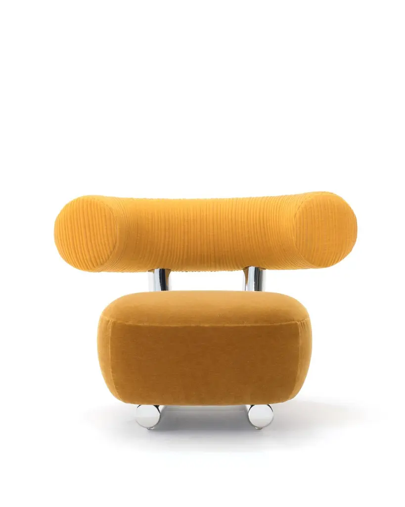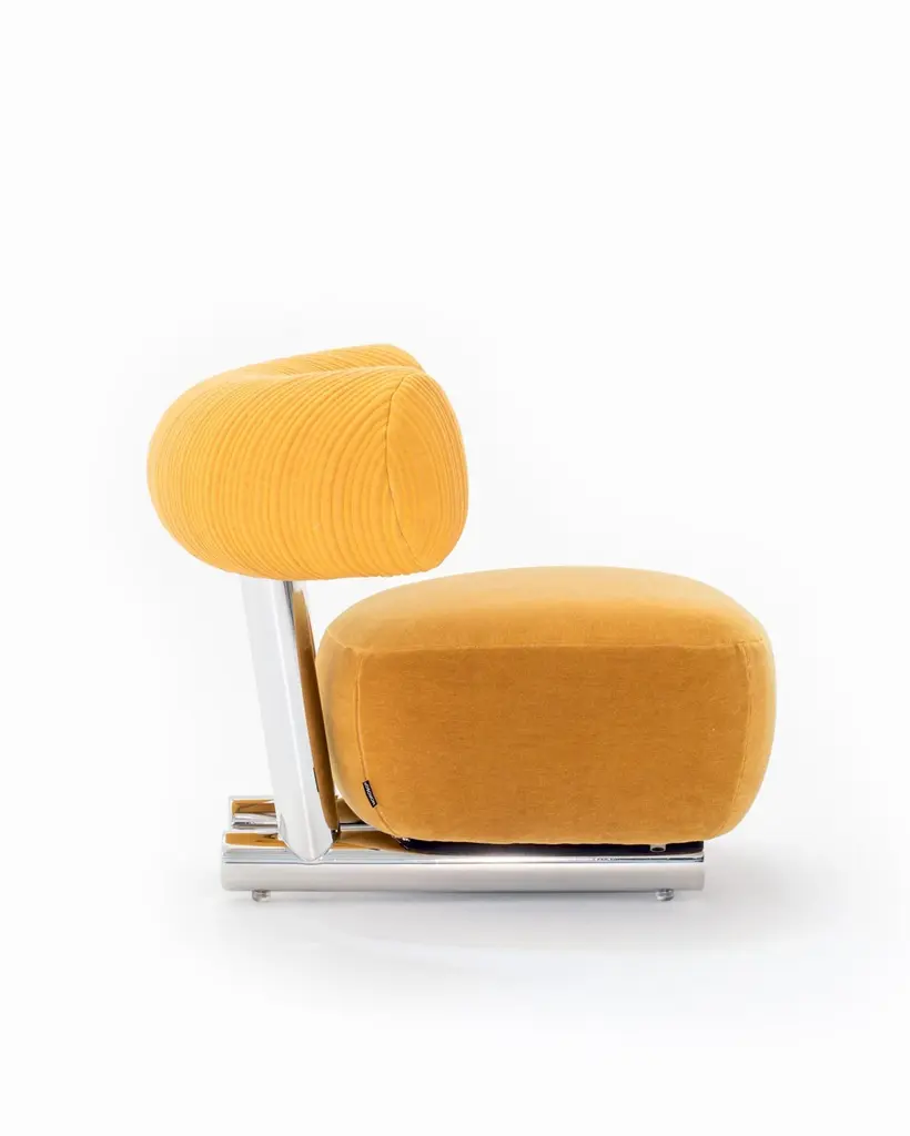 Placing the coarse before the fine, preferring a choice that bucks the trend compared to the most common research into the slim form. Despite this, staying light, ethereal. The design is thus structured around the most reassuring aspect of the oversized: the simplicity. The minimalist and rugged structure is built with a powder-painted aluminium tube with diameter of 80 mm. Resting on it is a seat cushion with a rounded physique, a covert suggestion of the idea of the inflatable module. The back, like a bold parenthesis, promises comfort. The effect, as well as the natural appeal, is that of a pleasing roundness, casual and lightweight.Seat is stress-resistant flame-retardant polyurethane in varied densities and polyester fiber on hardwood frame. Back is injected flame-retardant polyurethane foam and polyester fiber. External backrest supports and legs are tubular steel with chrome finish or powder coat; transparent PVC glides. Pipe collection covers are not removable.DIMENSIONS:W. 100 x D. 82 x H. 71 cmAvailable in different options, price upon request.