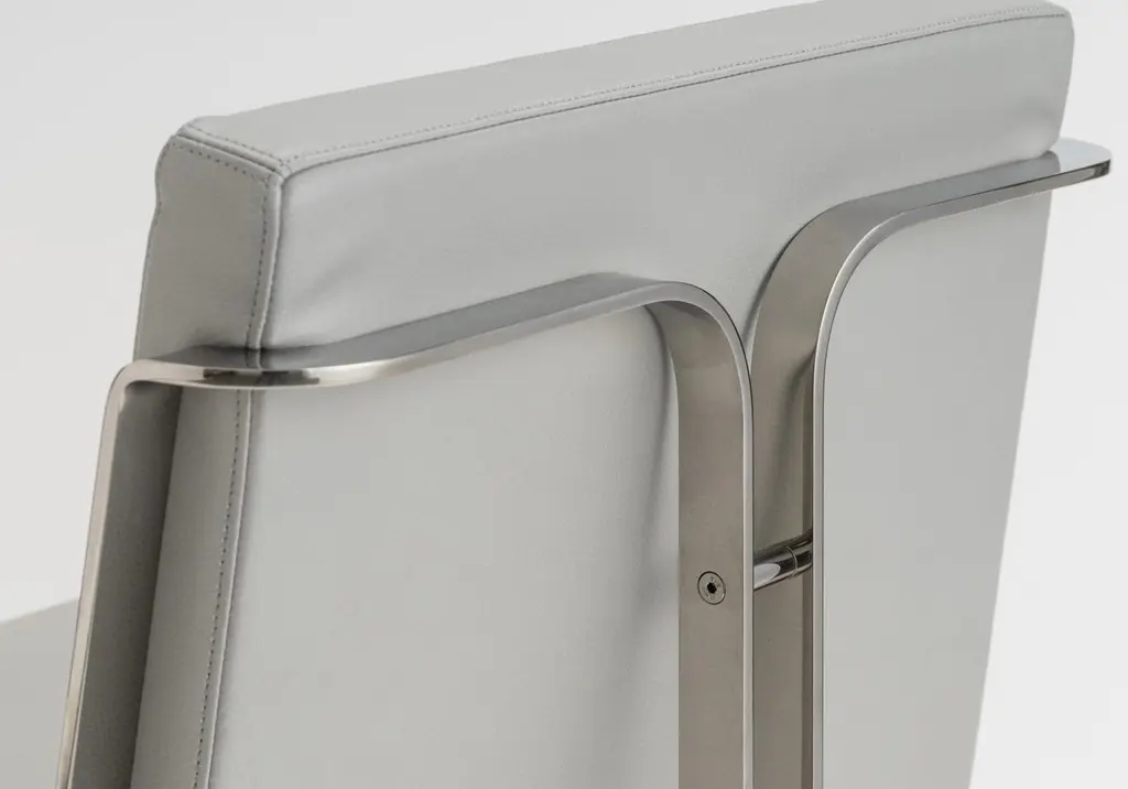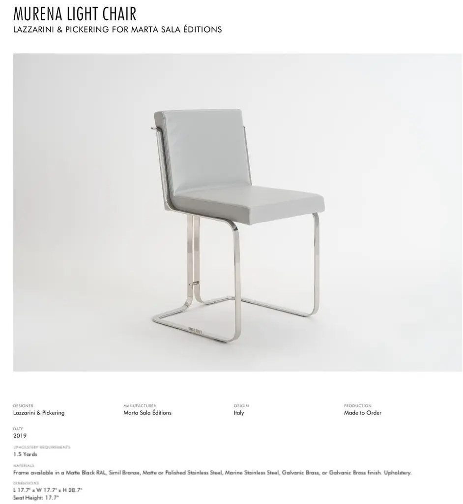 This new “Light” version of Murena chair offers a piece less massive, with just a suggestion of arm, to keep the comfort in a lighter visual impact. The form of the Murena chair characterized by the geometric but never rigid lines that give a poetic and delicate soul to the piece. The back of the chair, so simply designed, gives a unique elegance that allows to combine Murena with any different style and type of table. This configuration of the “Murena Light” features the Polished Stainless Steel and Dani Lord L MSE Leather. Retail price per chair is 7125 USD with a typical lead time of 25 weeks. Multiple available immediately here. Listing is for single chair. Established in 2015 by Milan-based design editor Marta Sala, Marta Sala Éditions is a furniture, lighting and objects brand that is guided by the certainty that the best designers are architects. As such, the first designers chosen to collaborate with Sala on the collection are Rome-based architects Claudio Lazzarini and Carl Pickering of Lazzarini Pickering, both experts in the design of interiors for architecture both found and invented. The result is a selection of pieces which seamlessly fuse functionality and intelligent design with high quality materials and craftsmanship for a collection that promises longstanding, useful service.