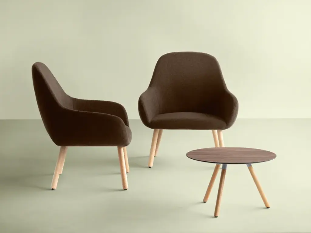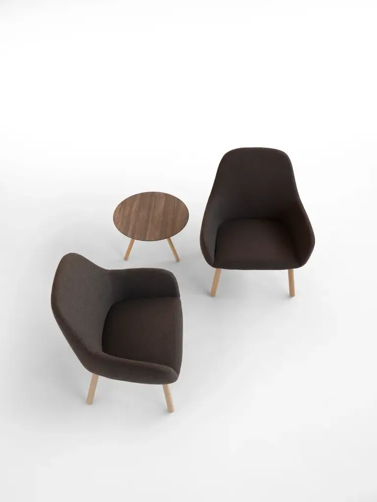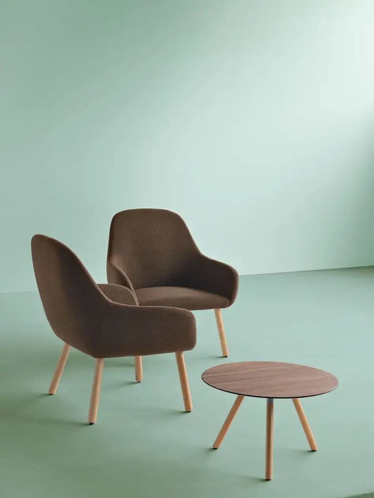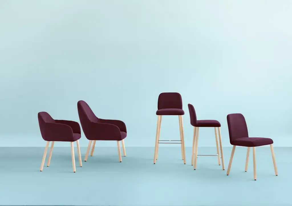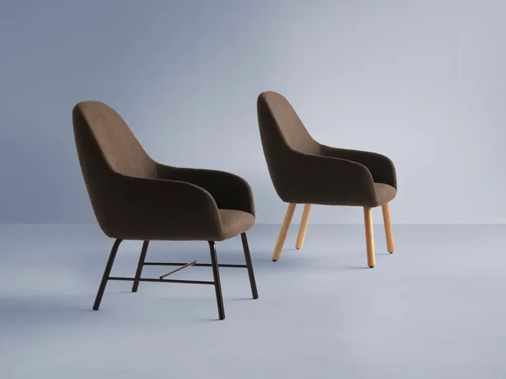 4-leg lounge chair with wooden frame and upholstered shell in fabric.Et al. presents the new collection of upholstered seats: Myra, designed by Emilio Nanni.Following the company’s spirit, this family of upholstered seats testifies that idea of comfort that the products Et al. ensure. A seat with an especially contemporary volumes layout, in accordance with the international taste that is attentive to design mood, Myra lends itself to instil its reassuring elegance to any environment. ‘The Curve is the subliminal shape that recalling a desire to wrap up as well as the comfort implied by the ancestral idea of trust, protection, and rest represents’ Emilio NanniThe curve is its distinctive feature, along with the extreme attention to detail. The contrasting stitching and the many possible combinations of colours and materials give the product a strong versatility. Myra, with its infinite option and its discreet yet equally strong style, satisfies every specific request of inclusion and attention to comfort, making it a good candidate to become a real long seller. The collection includes all types: side chair, armchair, high and low stool, lounge chair, and it is available in two different frame options: beech wood or steel.