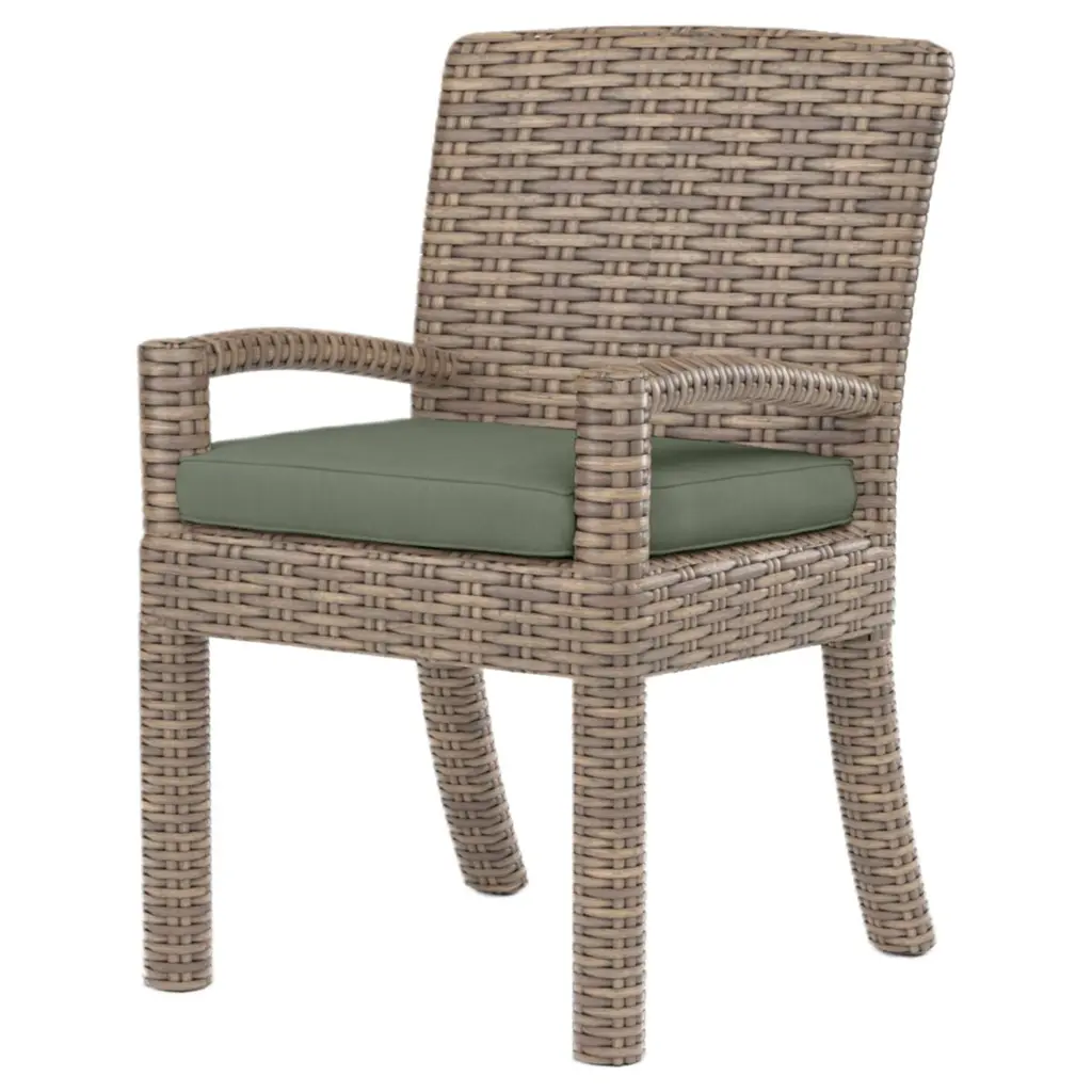 Crafted with the highest quality comfort and durability in mind, the Naevia Dining Chair features gently sloped arms and an aluminum frame wrapped with premium all-weather wicker. It includes a fully welded powder-coated aluminum frame and is wrapped in virgin PE Resin Wicker. The chair incorporates Progressive Springing System Technology and weather-resistant, high-resiliency foam cushions. It is stocked in premium fabric and features non-marking plastic glides. With commercial quality construction,