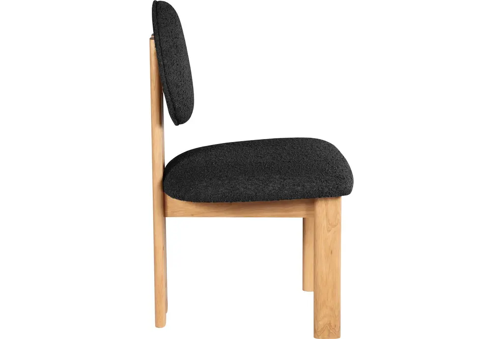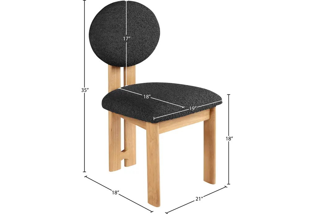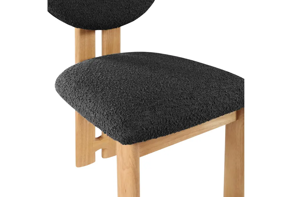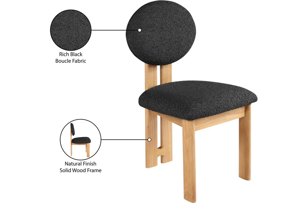 The Napa Black Dining Chair with Natural Finish Set of 2 offers modern design and comfort for your dining room. This set features chairs covered in boucle fabric with sturdy rubberwood legs, ensuring a durable and stylish addition to your home. Perfect for any dining space, these chairs combine practicality with a contemporary look.