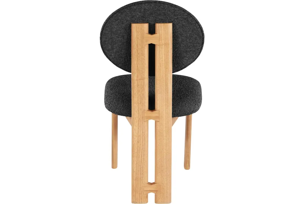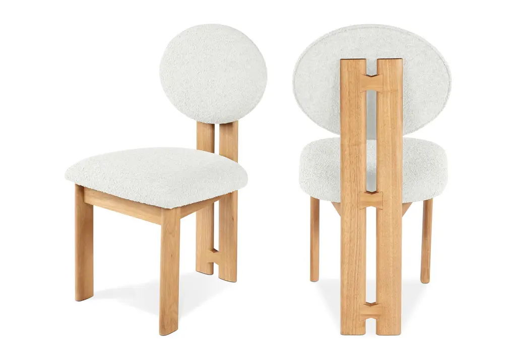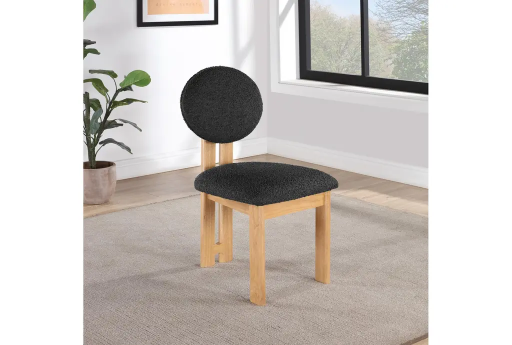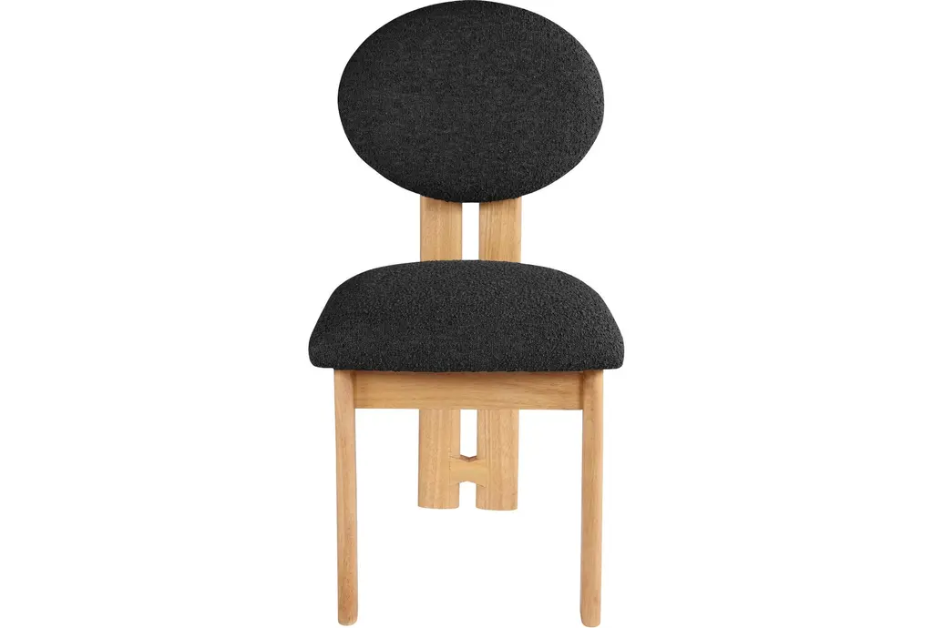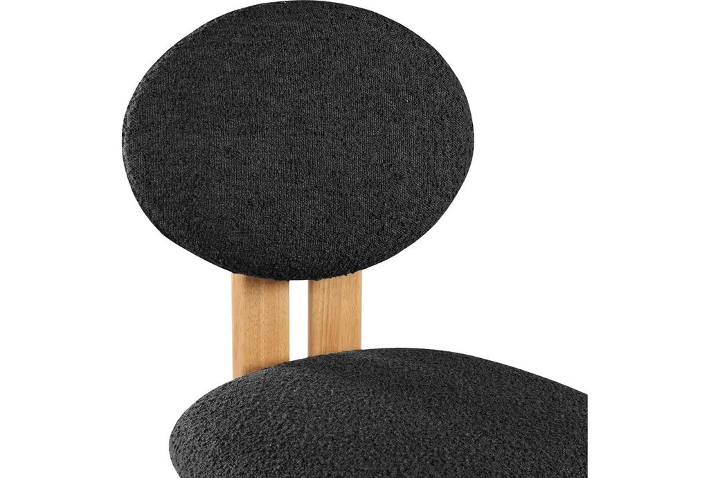 The Napa Black Dining Chair with Natural Finish Set of 2 offers modern design and comfort for your dining room. This set features chairs covered in boucle fabric with sturdy rubberwood legs, ensuring a durable and stylish addition to your home. Perfect for any dining space, these chairs combine practicality with a contemporary look.