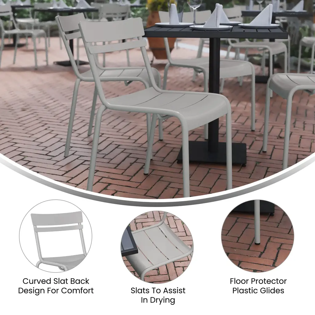 Sleek modern style is upwardly mobile and affordable with this modern commercial grade armless stack chair. Ideal for any indoor or outdoor space at your restaurant, bar, kitchen, or patio the slatted, contoured design of the back and seat aids with airflow and water drainage for comfort and quick turnaround for seating. The armless design is svelte and functional allowing this metal chair to slide completely under tables to create open floorspace in offices or breakrooms. Rising to the demands of the hospitality industry, as well as your home, this steel chair boasts a powder coated frame that is UV and weather resistant and holds up to 300 lbs. static weight. Lightweight and agile with a recommended stack height of 8 chairs, this bistro chair wipes clean with a damp cloth for quick easy cleanup at the end of the night. Convenience is key in busy establishments and households so this chair ships fully assembled for instant use right out of the box. Protective floor glides keep your indoor flooring surfaces free from damage making this kitchen chair a winner from all angles. Available in multiple colors, pair this dining chair with our metal armchair and bar height stool for a cohesive look throughout your home or business.