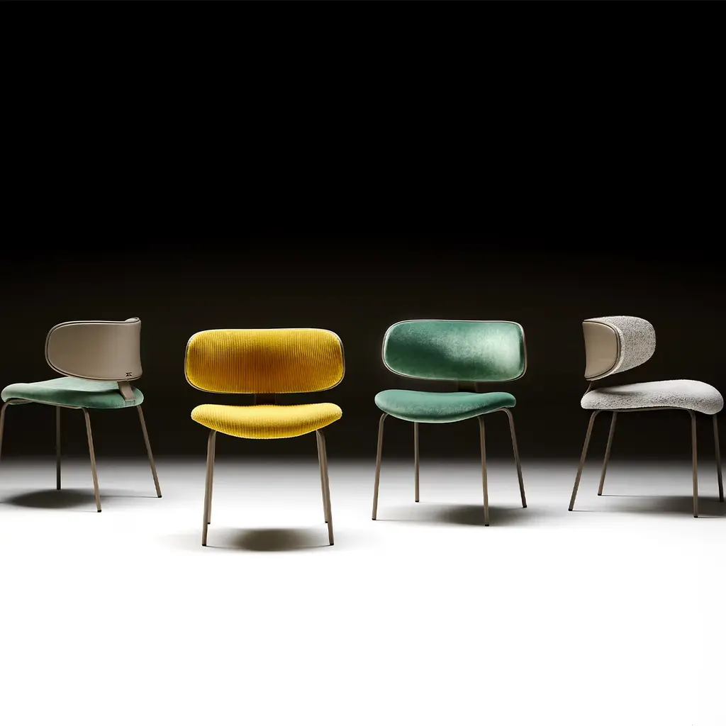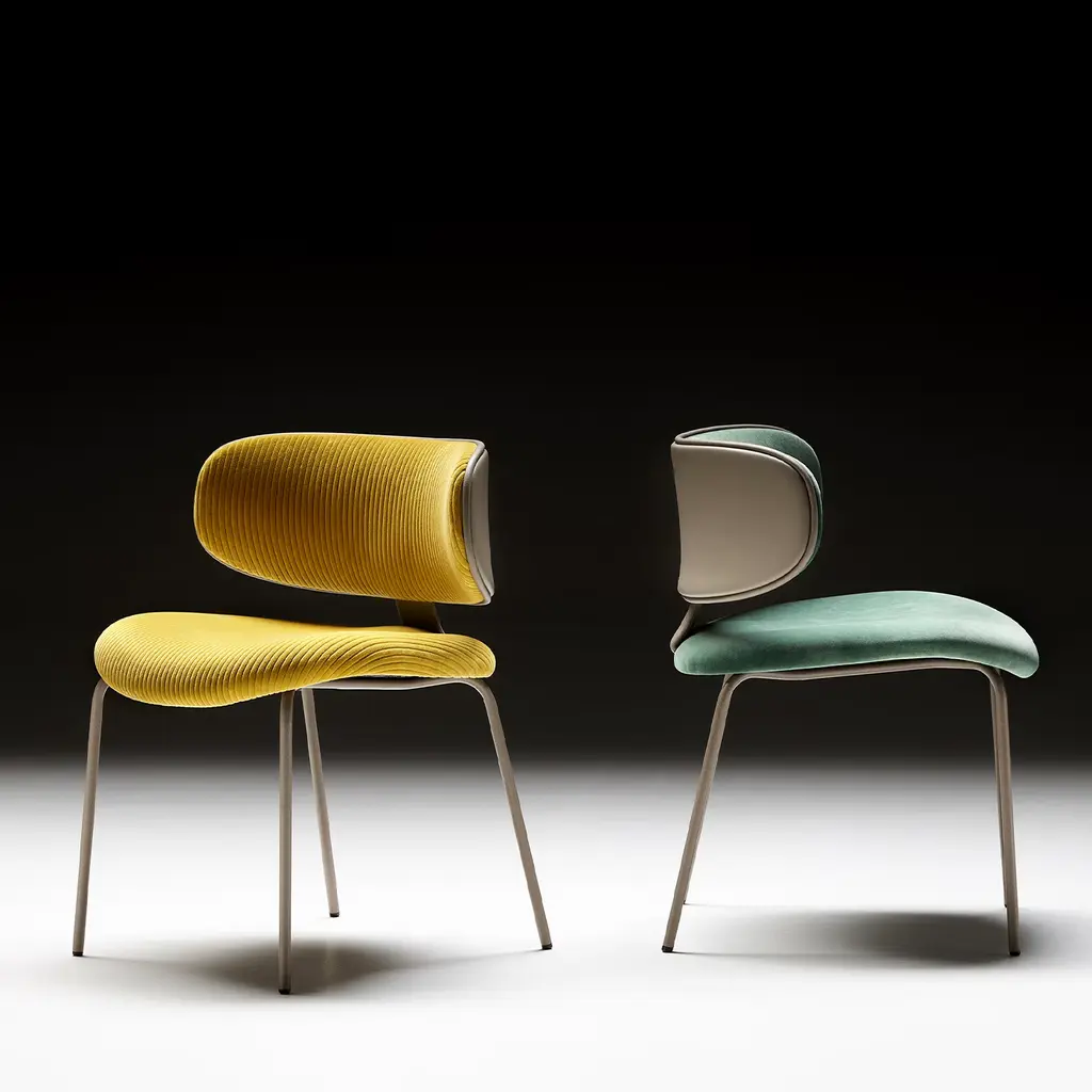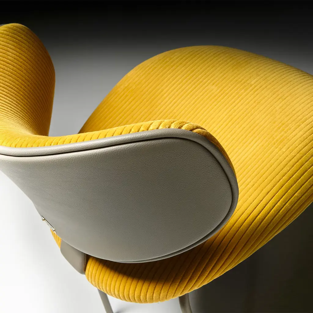Clean and simple yet lively and original, this exquisite dining chair embodies the combination of form and function. Resting on a brown-lacquered metal base, the seat and back are made of curved beechwood, padded with high-resilience polyurethane foam, and upholstered with a ribbed yellow fabric cover enhanced with eco-leather details. Please inquire with the Concierge for further information.