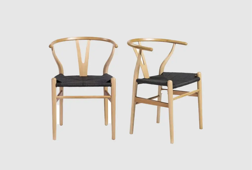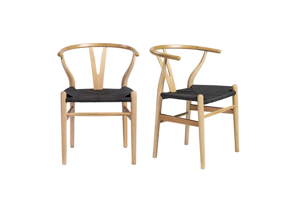 Natural Wood Wishbone Side Chair With Black Woven Seat Set Of 2 With Back | Curved Back | Armless