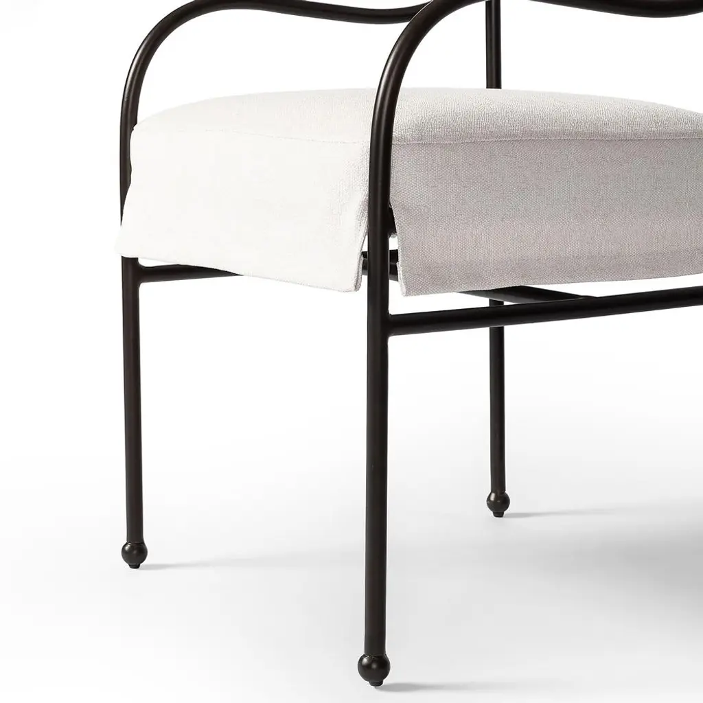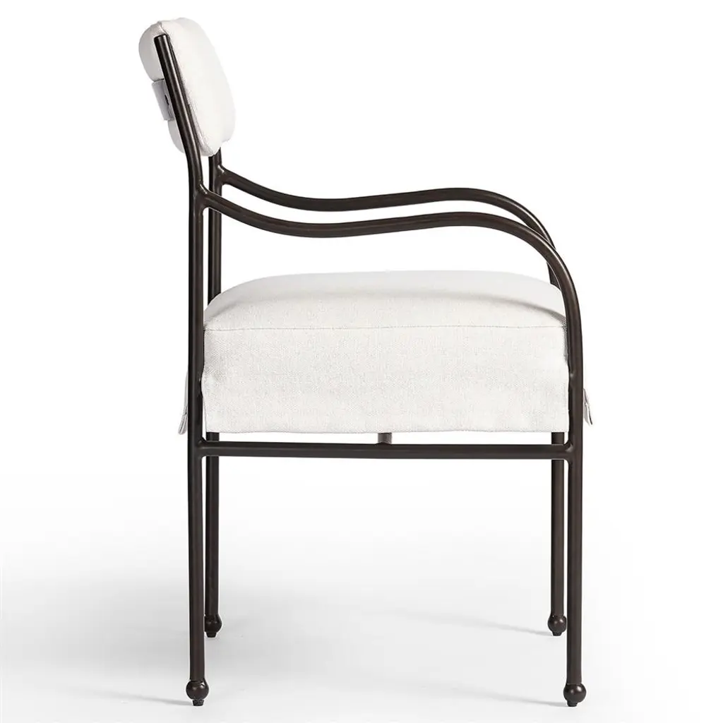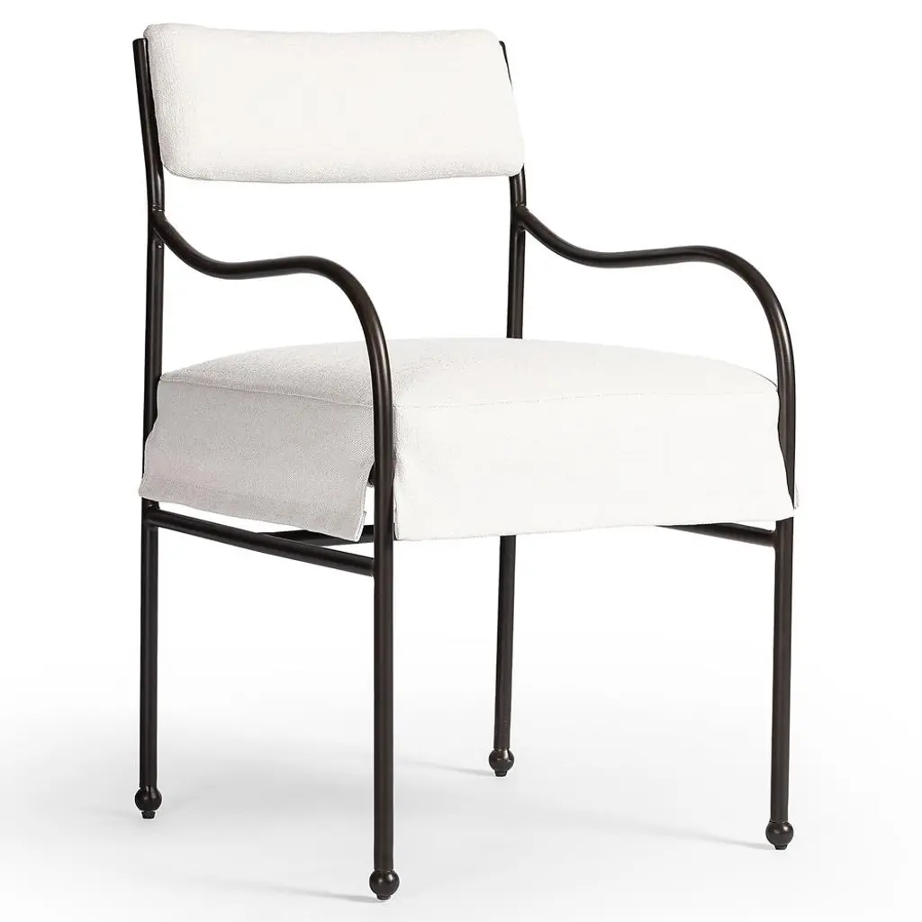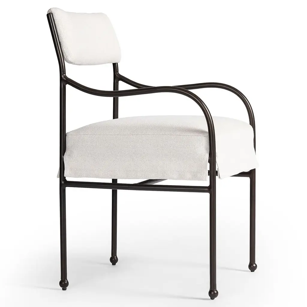 A design collaboration by Amber Lewis and Four Hands. A French-inspired dining chair that plays on shape and contrast. The matte gunmetal frame features gently curved arms and finial details at the feet. A white slipcover back and seat, finished with a short skirt, brings subtle movement. Sustainably made with zero waste, luxurious Italian upholstery places a new and unique spin on indoor/outdoor seating, offering soft, durable fabric that's highly resistant to sun, stains, mold and abrasion.