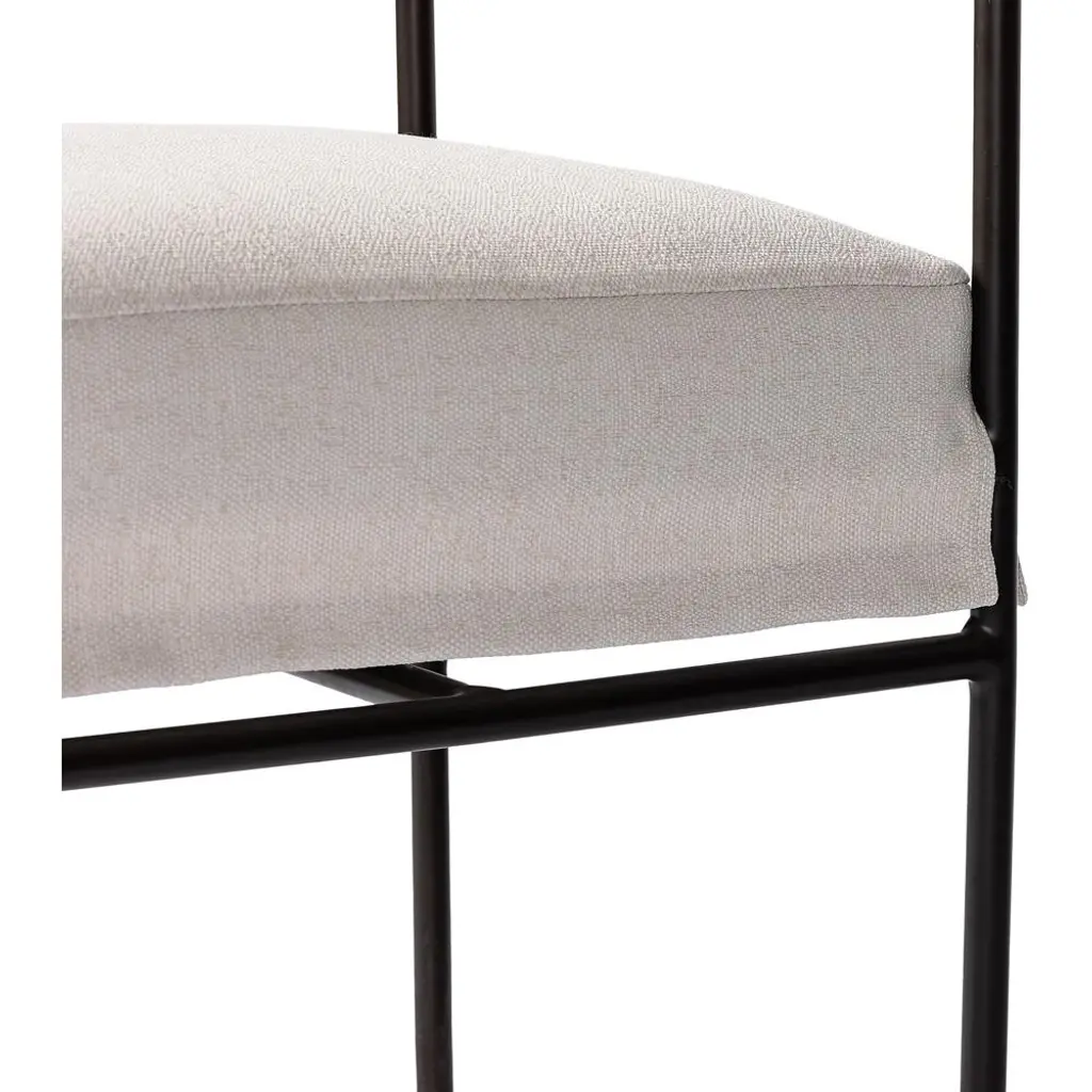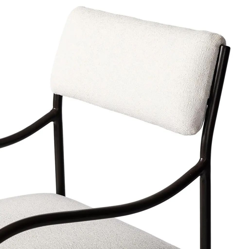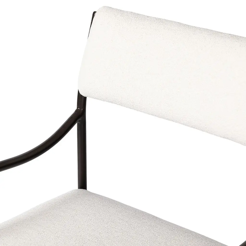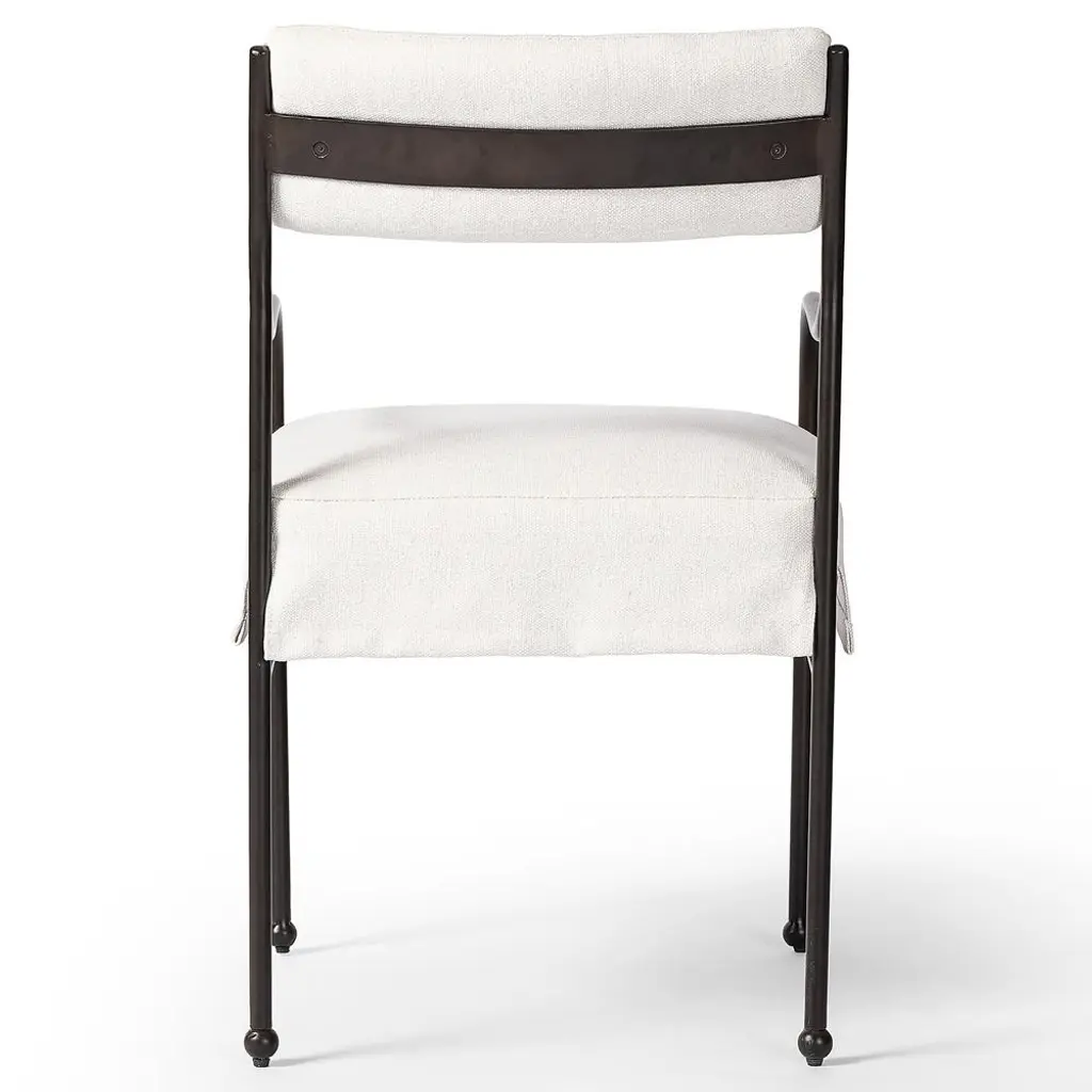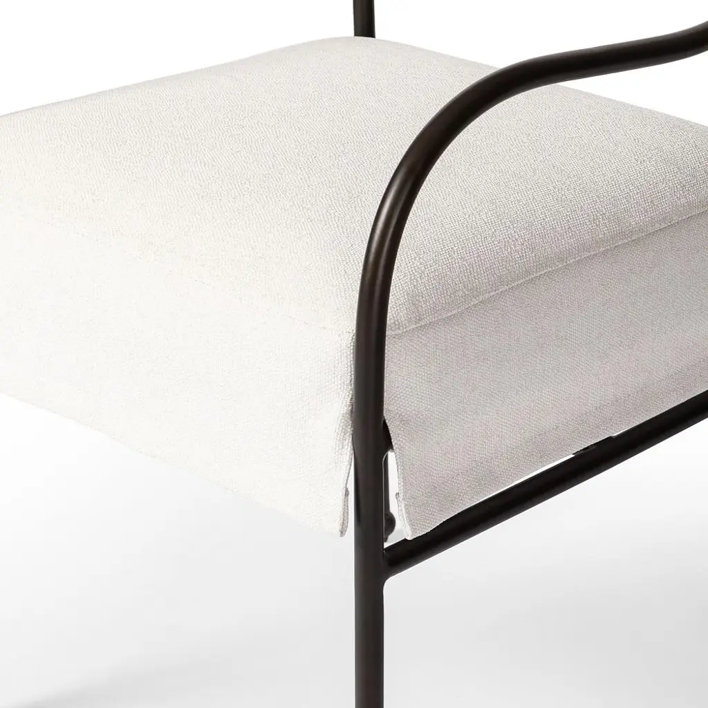 A design collaboration by Amber Lewis and Four Hands. A French-inspired dining chair that plays on shape and contrast. The matte gunmetal frame features gently curved arms and finial details at the feet. A white slipcover back and seat, finished with a short skirt, brings subtle movement. Sustainably made with zero waste, luxurious Italian upholstery places a new and unique spin on indoor/outdoor seating, offering soft, durable fabric that's highly resistant to sun, stains, mold and abrasion.