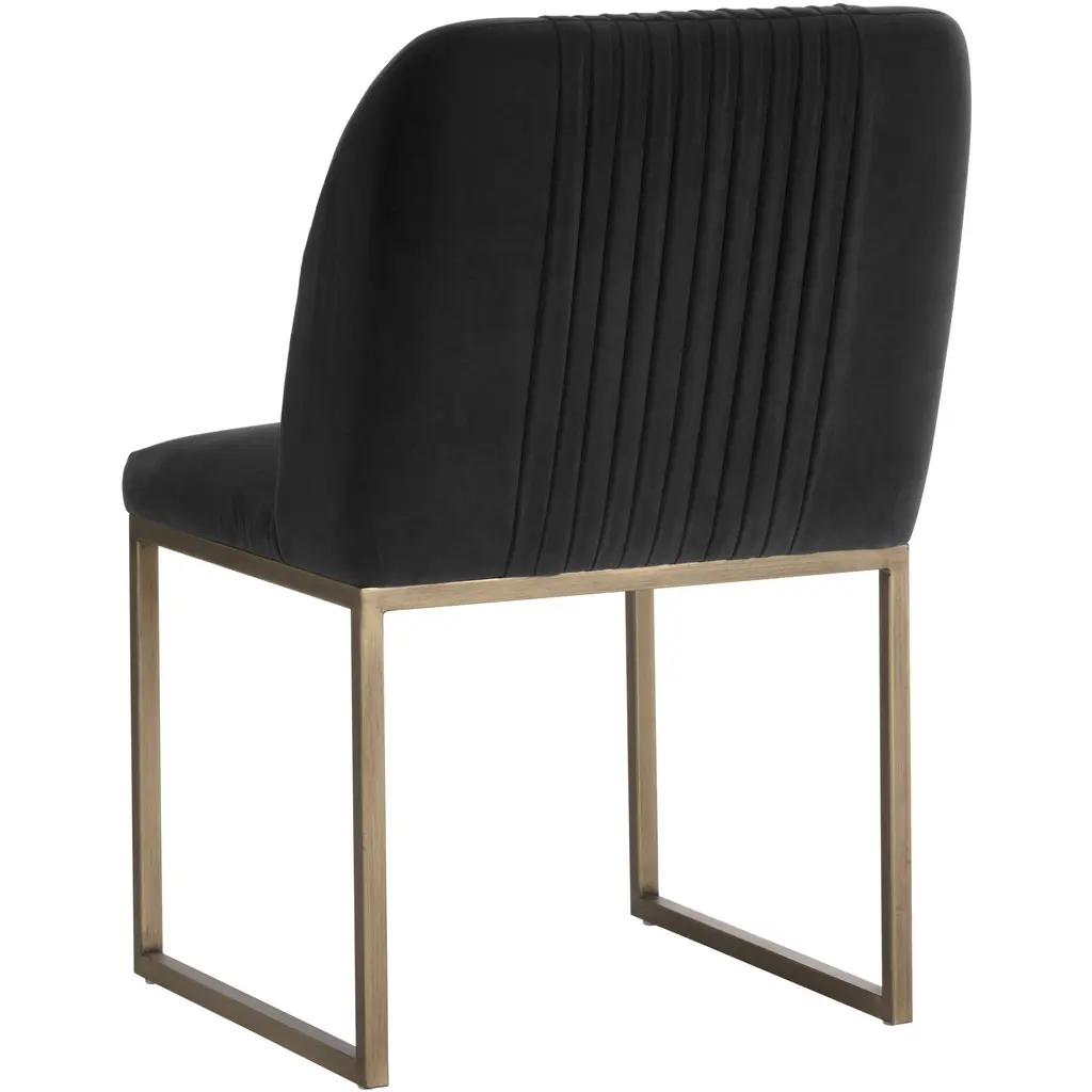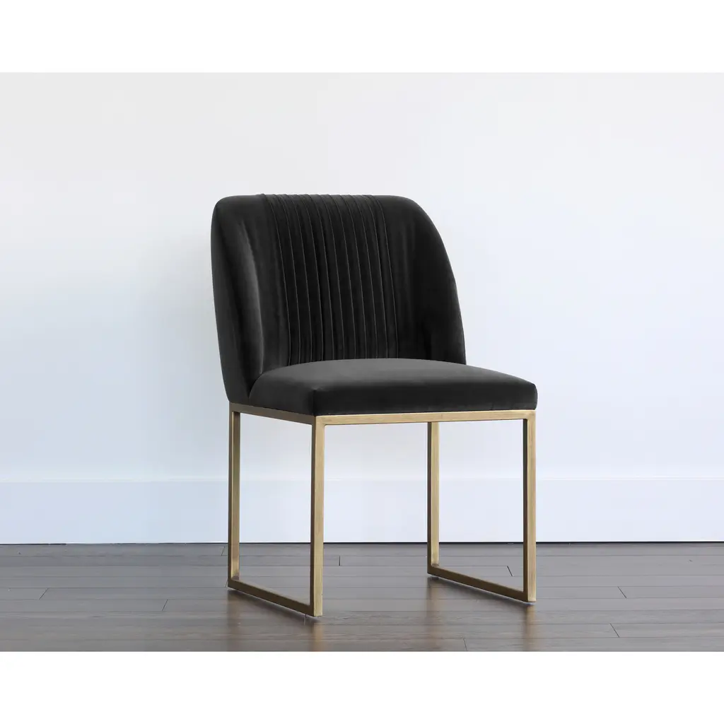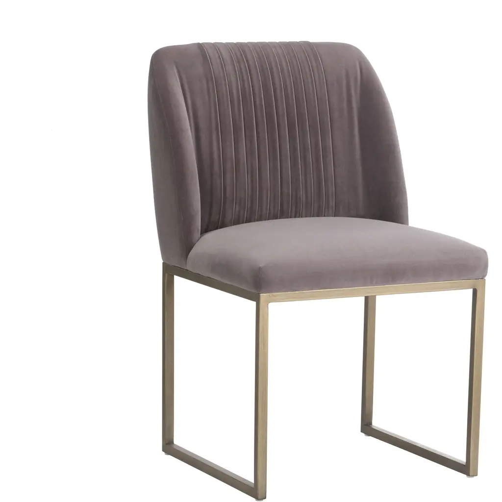 A transitional dining chair that offers style and comfort. Features delicate ruching on the rounded seatback and exposed antique brass legs. Stocked in shadow grey fabric.