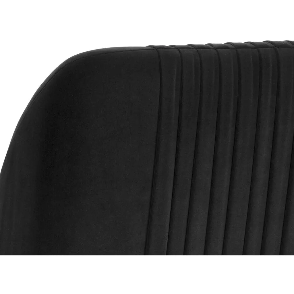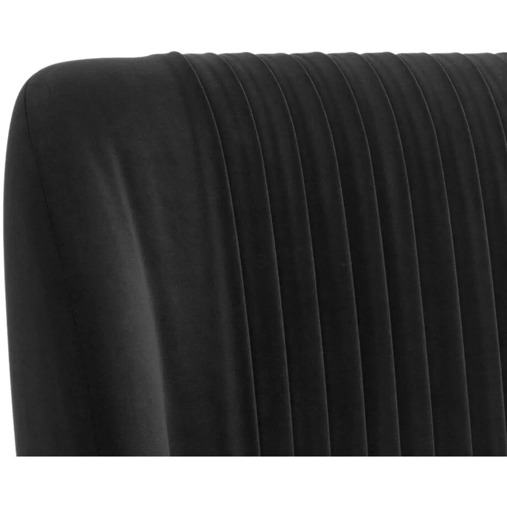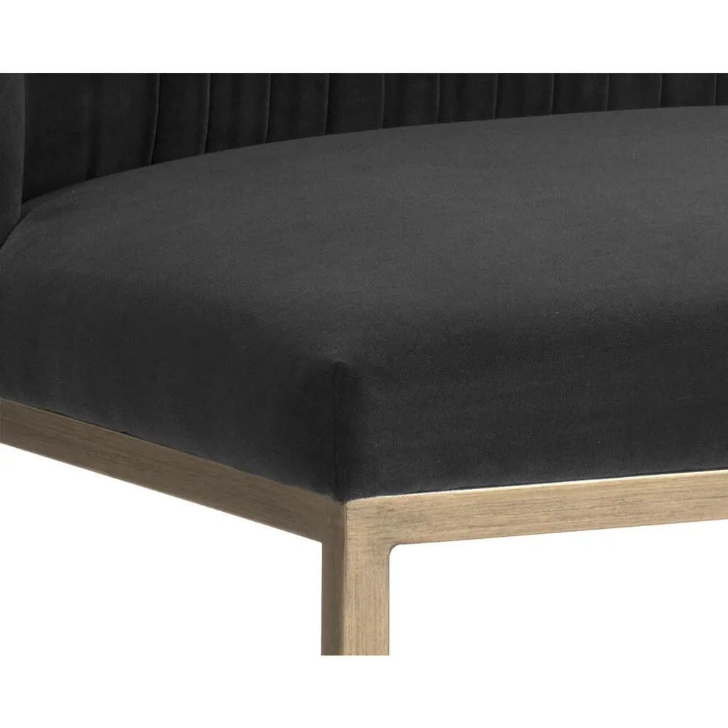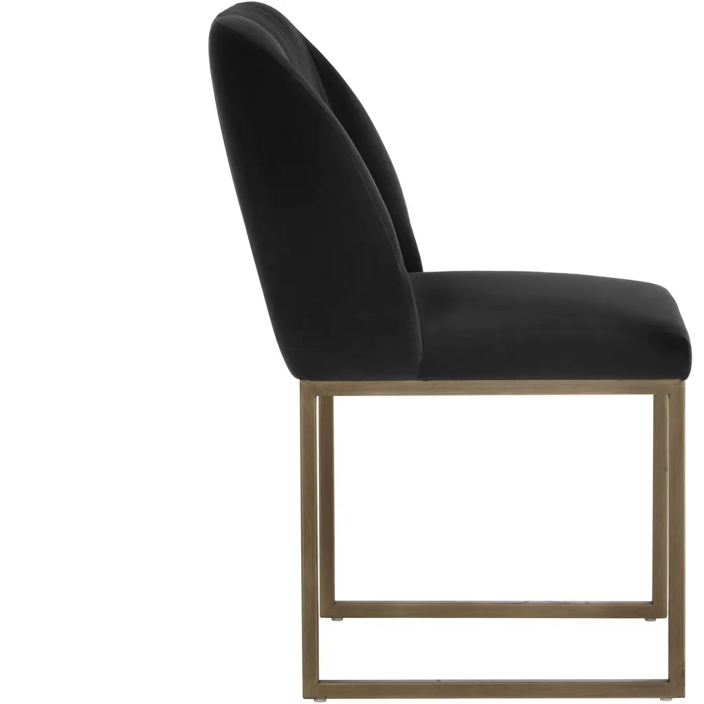 A transitional dining chair that offers style and comfort. Features delicate ruching on the rounded seatback and exposed antique brass legs. Stocked in shadow grey fabric.