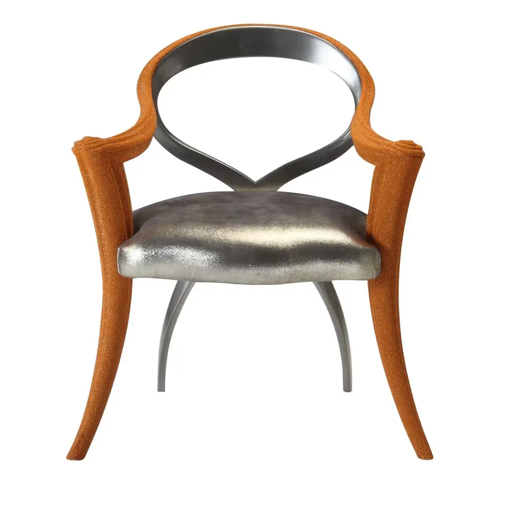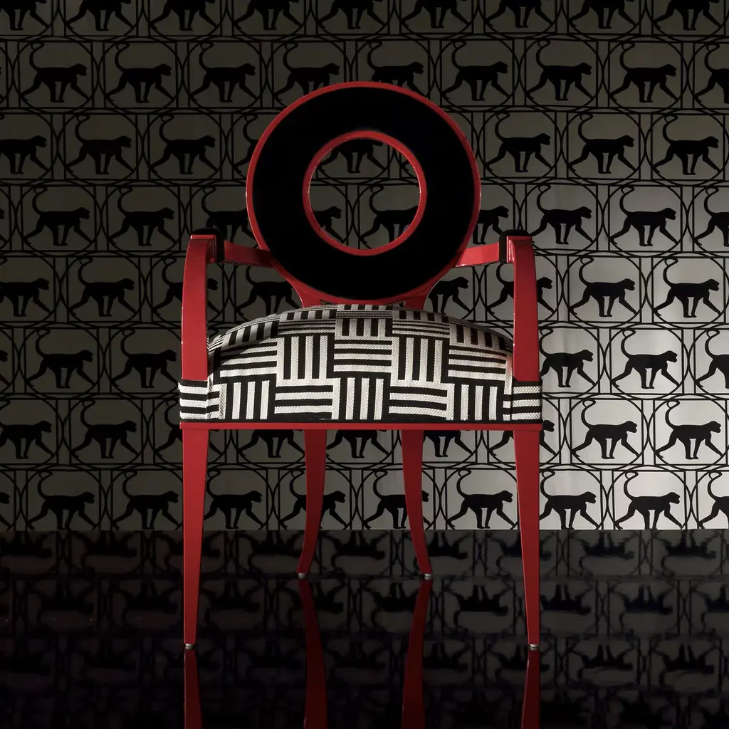 Designed by Giannella Ventura, this stunning armchair features strong lacquered colors and graphic fabric that highlight its timeless elegance. The soft lines of the wood frame with curved armrests, flared and tapered legs and round backrest are highlighted by the lacquered vivid red color while adding comfort and elegance. Completed by a refined upholstery in Alhambra fabric with black and white geometric lines, this armchair will be a stand-out addition to a modern dining room decor, and a perfect accent piece in an entryway, bedroom or living room.