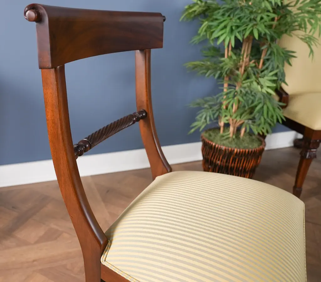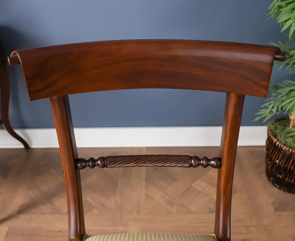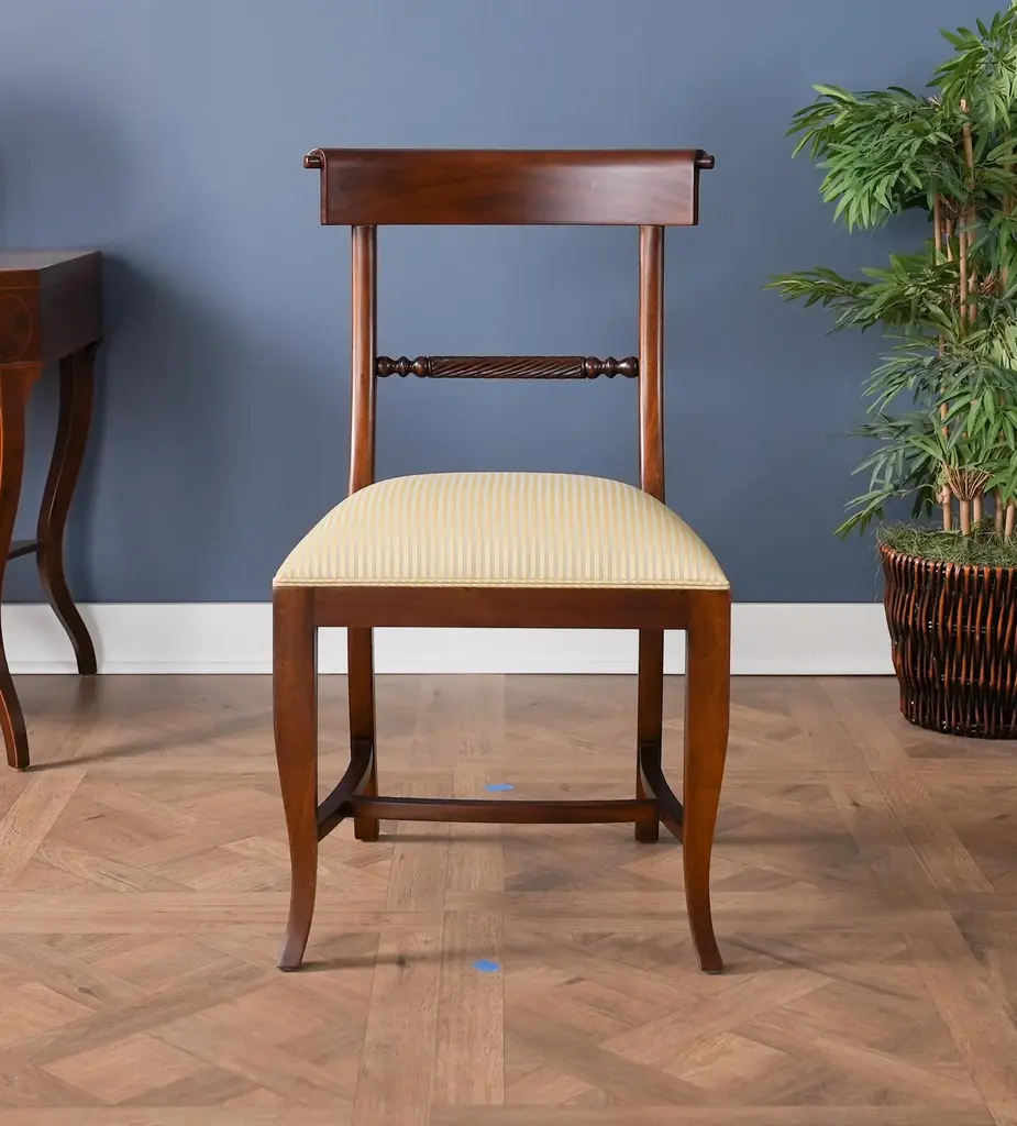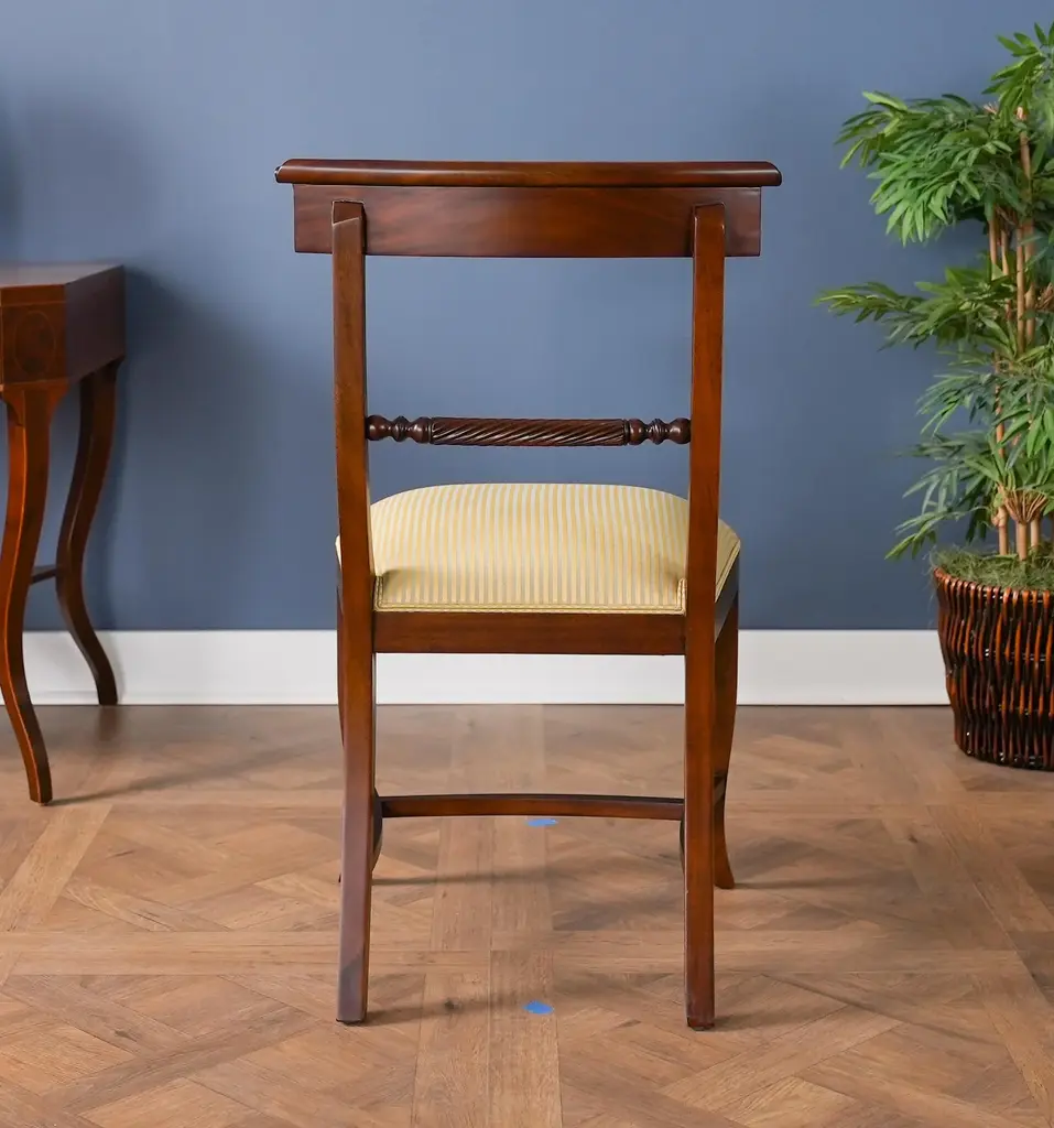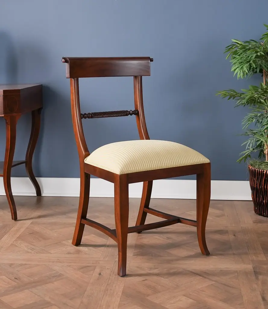 The Niagara Twist Back Side Chair is a federal style dining chair hand carved from great quality, plantation grown solid mahogany. The shaped crest rail fits nicely against your back when seated, the chair is supported on a tapered and curved saber leg. Deceptively simple at first glance the turned and carved back (twist back) adds detail and charm to the Twist Back Side Chair overall appearance. The H stretcher lends strength and stability to a chair for years of daily use and makes the item ideally suited for maximum seating capacity around the table during holiday occasions. Seat Height approximately 20.5 inches. Side Chair Measures 19″w x 20″d x 35″h metric 48 50 89