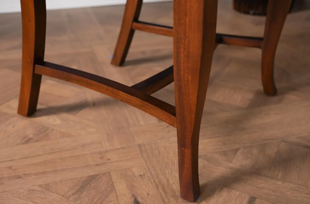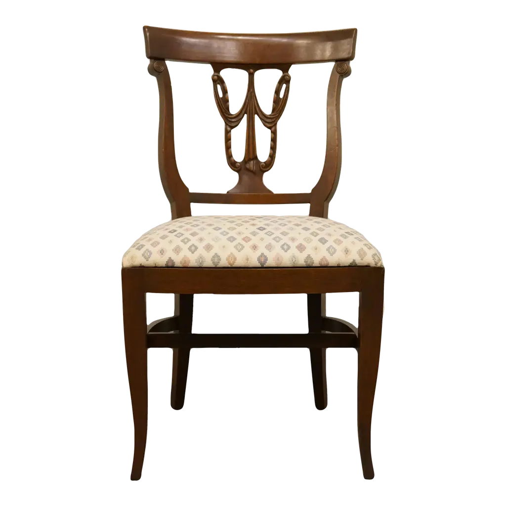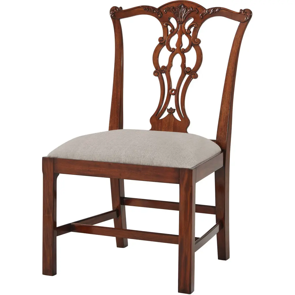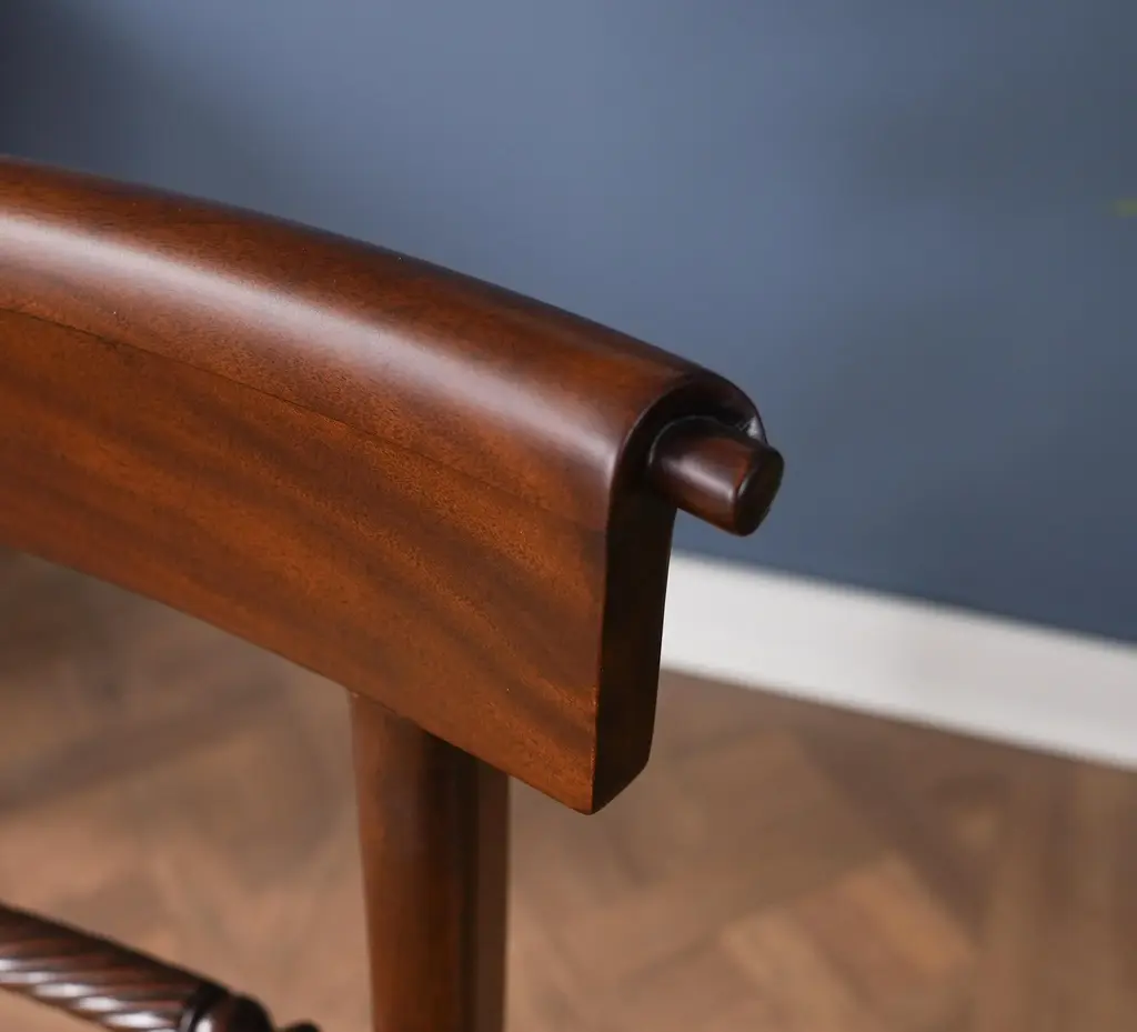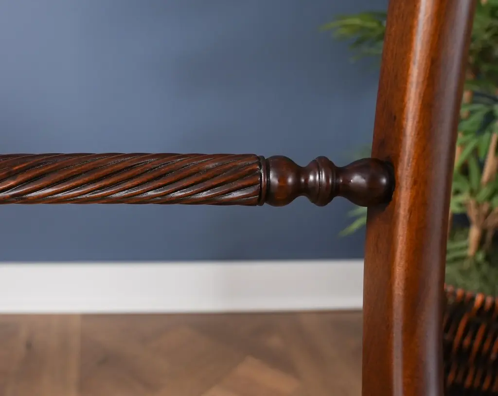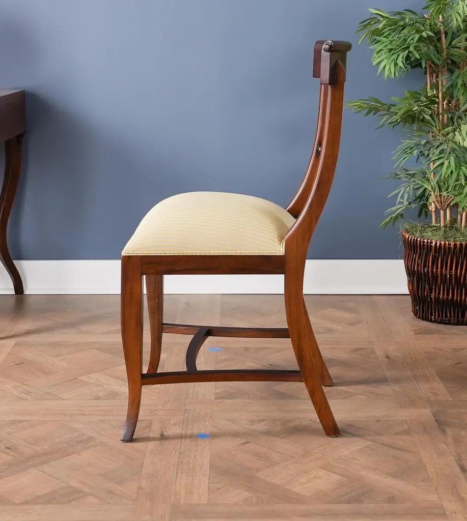 The Niagara Twist Back Side Chair is a federal style dining chair hand carved from great quality, plantation grown solid mahogany. The shaped crest rail fits nicely against your back when seated, the chair is supported on a tapered and curved saber leg. Deceptively simple at first glance the turned and carved back (twist back) adds detail and charm to the Twist Back Side Chair overall appearance. The H stretcher lends strength and stability to a chair for years of daily use and makes the item ideally suited for maximum seating capacity around the table during holiday occasions. Seat Height approximately 20.5 inches. Side Chair Measures 19″w x 20″d x 35″h metric 48 50 89