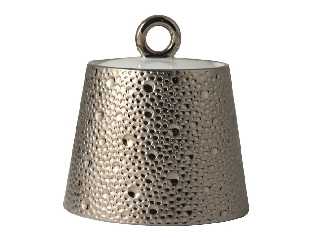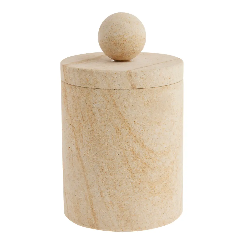 Adding an eclectic touch to any look is achieved with this adaptable nickel finished round container. Topped with an earthy hide leather lid and stone accent, it's a perfect decorative storage solution.