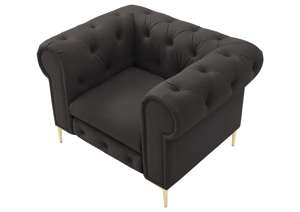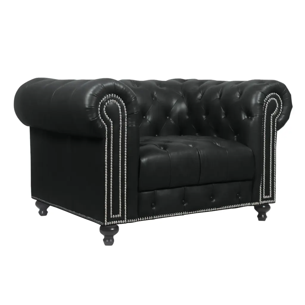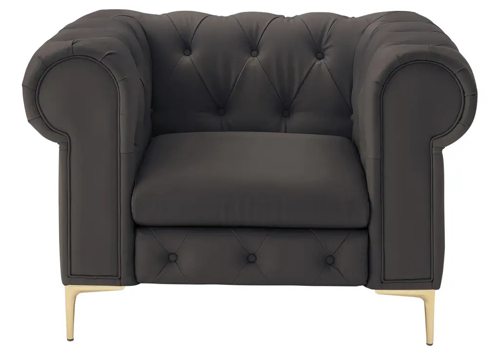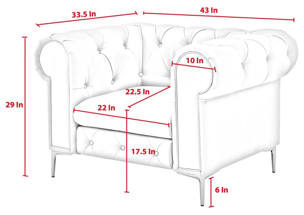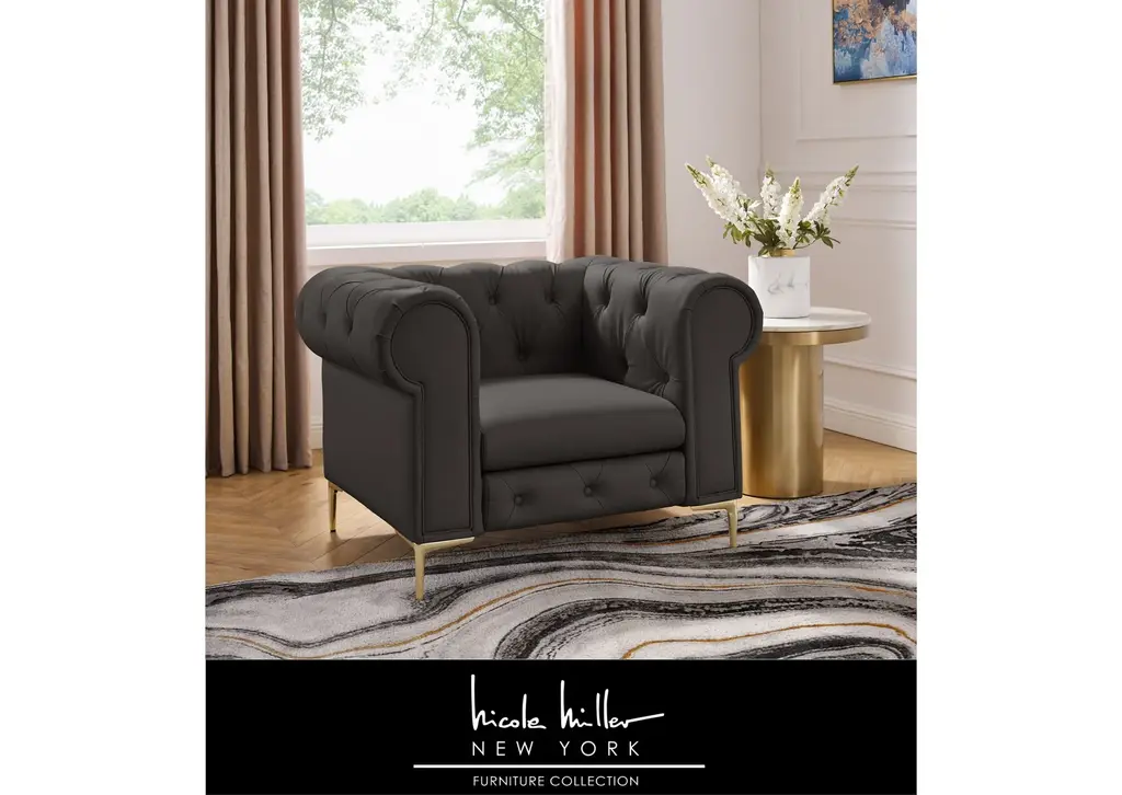 Sure to grab glances in any space, this classic club chair is a perfect match for aesthetics. The chesterfield design is complete with this sofa's rolled arms and button-tufted details. It also instantly elevates even the simplest interiors. Aside from these stylish features, this club chair prioritizes a comfortable seating experience with its sturdy wood support and soft leather PU. It's the perfect combination of elegance and functionality!FEATURES:CLASSIC DESIGN - Bring an understated appeal to your aesthetic with this eye-catching chair. Featuring a chesterfield style, modernized with a golden Y-leg, this accent chair makes a subtle addition to any modern, traditional, transitional style.COMFORTABLE SEATING EXPERIENCE - Elevate your seating experience with this amazing piece. Enjoy luxurious comfort thanks to a high-quality composition from leather PU, Foam and sinuous springsEXPERTLY MADE - The design features button-tufted details surrounding the back and a lower apron for a note of texture. Its tufted backrest boasts perfectly stitched detailing, and the base is polished into sturdy Y-legs.VERSATILE USE - The classic design of this chair complements most home ensembles. You can put it in the living room and entryway for you and your guest. Also, it's the best piece to place in your office as a relaxation place after a long day of work.PRODUCT DIMENSION - Overall: 43" x 33.5" x 29". Seat: 22"W x 22.5"D x 17.5"H. Back: 12"H. Leg: 6"HSPECIFICATIONS:FABRIC and MATERIALS: Leather PU, Foam, Fiber, Solid Wood, Manufactured Wood, IronATTRIBUTES: Button Tufted, Y-leg, Rolled Arms, Sinuous SpringsINTENDED ROOMS: Living Room, Entryway, OfficeSTYLE: Modern, Traditional, TransitionalABOUT THE BRAND:NICOLE MILLER IS A GLOBAL BRAND, DESIGNED IN NEW YORK CITY WITH A SIGNATURE OF GRAPHIC PRINTS, LUXE FABRICS AND INNOVATIVE SILHOUETTES.SINCE LAUNCHING IN 1982, THE NICOLE MILLER BRAND HAS GROWN GREATLY AND IS NOW COMPRISED OF NUMEROUS CATEGORIES INCLUDING SHOES, JEWELRY, ACTIVE WEAR AND HOME DECOR. OUR FURNITURE COLLECTION CONSISTS OF UPHOLSTERED OTTOMANS, BENCH'S, BEDS, HEADBOARDS, SOFAS, SIDE-TABLES, NIGHT STANDS, BEDROOM FURNITURE, ACCENT CHAIRS, BAR STOOLS, DINING CHAIRS AND TABLES, WE SET OUT TO DELIVER A SENSE OF HOME WITH STYLE and COMFORT!