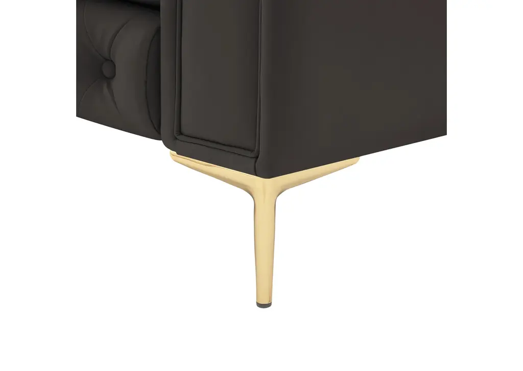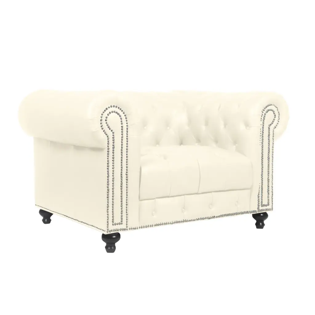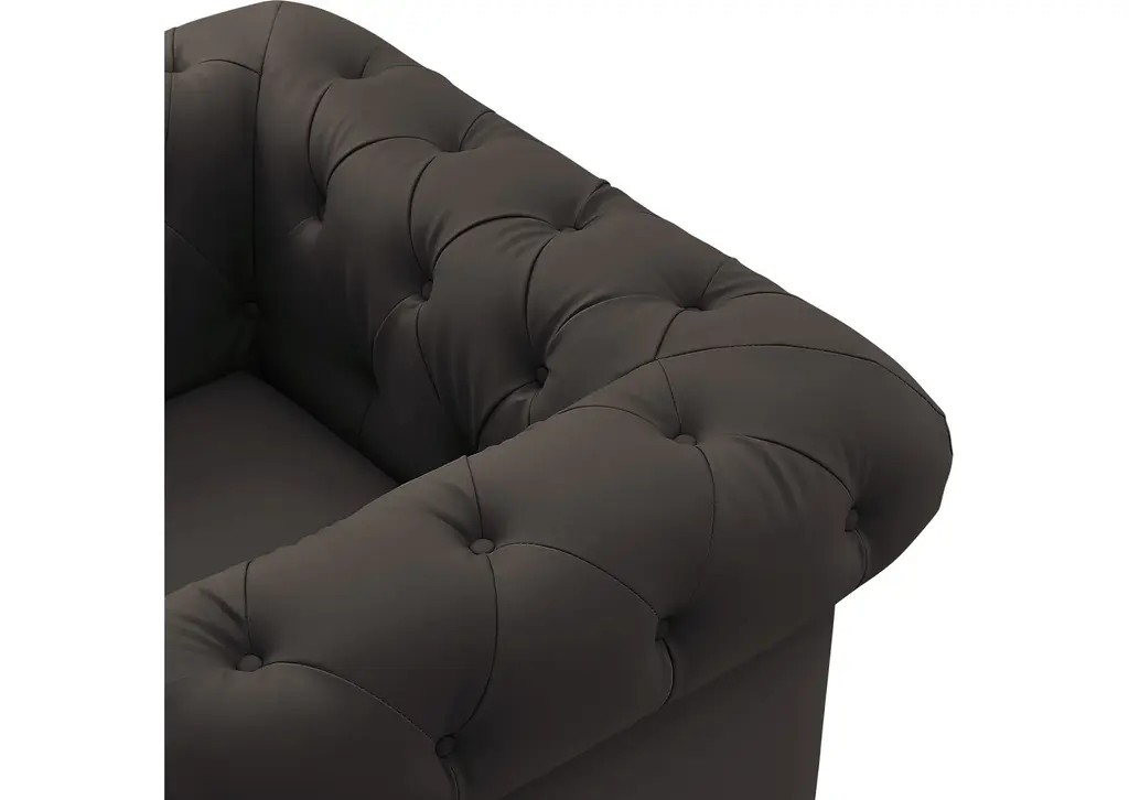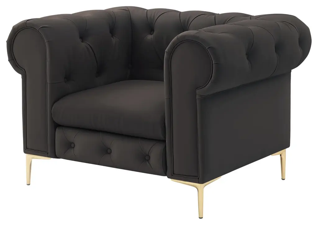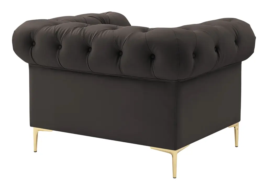 Sure to grab glances in any space, this classic club chair is a perfect match for aesthetics. The chesterfield design is complete with this sofa's rolled arms and button-tufted details. It also instantly elevates even the simplest interiors. Aside from these stylish features, this club chair prioritizes a comfortable seating experience with its sturdy wood support and soft leather PU. It's the perfect combination of elegance and functionality!FEATURES:CLASSIC DESIGN - Bring an understated appeal to your aesthetic with this eye-catching chair. Featuring a chesterfield style, modernized with a golden Y-leg, this accent chair makes a subtle addition to any modern, traditional, transitional style.COMFORTABLE SEATING EXPERIENCE - Elevate your seating experience with this amazing piece. Enjoy luxurious comfort thanks to a high-quality composition from leather PU, Foam and sinuous springsEXPERTLY MADE - The design features button-tufted details surrounding the back and a lower apron for a note of texture. Its tufted backrest boasts perfectly stitched detailing, and the base is polished into sturdy Y-legs.VERSATILE USE - The classic design of this chair complements most home ensembles. You can put it in the living room and entryway for you and your guest. Also, it's the best piece to place in your office as a relaxation place after a long day of work.PRODUCT DIMENSION - Overall: 43" x 33.5" x 29". Seat: 22"W x 22.5"D x 17.5"H. Back: 12"H. Leg: 6"HSPECIFICATIONS:FABRIC and MATERIALS: Leather PU, Foam, Fiber, Solid Wood, Manufactured Wood, IronATTRIBUTES: Button Tufted, Y-leg, Rolled Arms, Sinuous SpringsINTENDED ROOMS: Living Room, Entryway, OfficeSTYLE: Modern, Traditional, TransitionalABOUT THE BRAND:NICOLE MILLER IS A GLOBAL BRAND, DESIGNED IN NEW YORK CITY WITH A SIGNATURE OF GRAPHIC PRINTS, LUXE FABRICS AND INNOVATIVE SILHOUETTES.SINCE LAUNCHING IN 1982, THE NICOLE MILLER BRAND HAS GROWN GREATLY AND IS NOW COMPRISED OF NUMEROUS CATEGORIES INCLUDING SHOES, JEWELRY, ACTIVE WEAR AND HOME DECOR. OUR FURNITURE COLLECTION CONSISTS OF UPHOLSTERED OTTOMANS, BENCH'S, BEDS, HEADBOARDS, SOFAS, SIDE-TABLES, NIGHT STANDS, BEDROOM FURNITURE, ACCENT CHAIRS, BAR STOOLS, DINING CHAIRS AND TABLES, WE SET OUT TO DELIVER A SENSE OF HOME WITH STYLE and COMFORT!