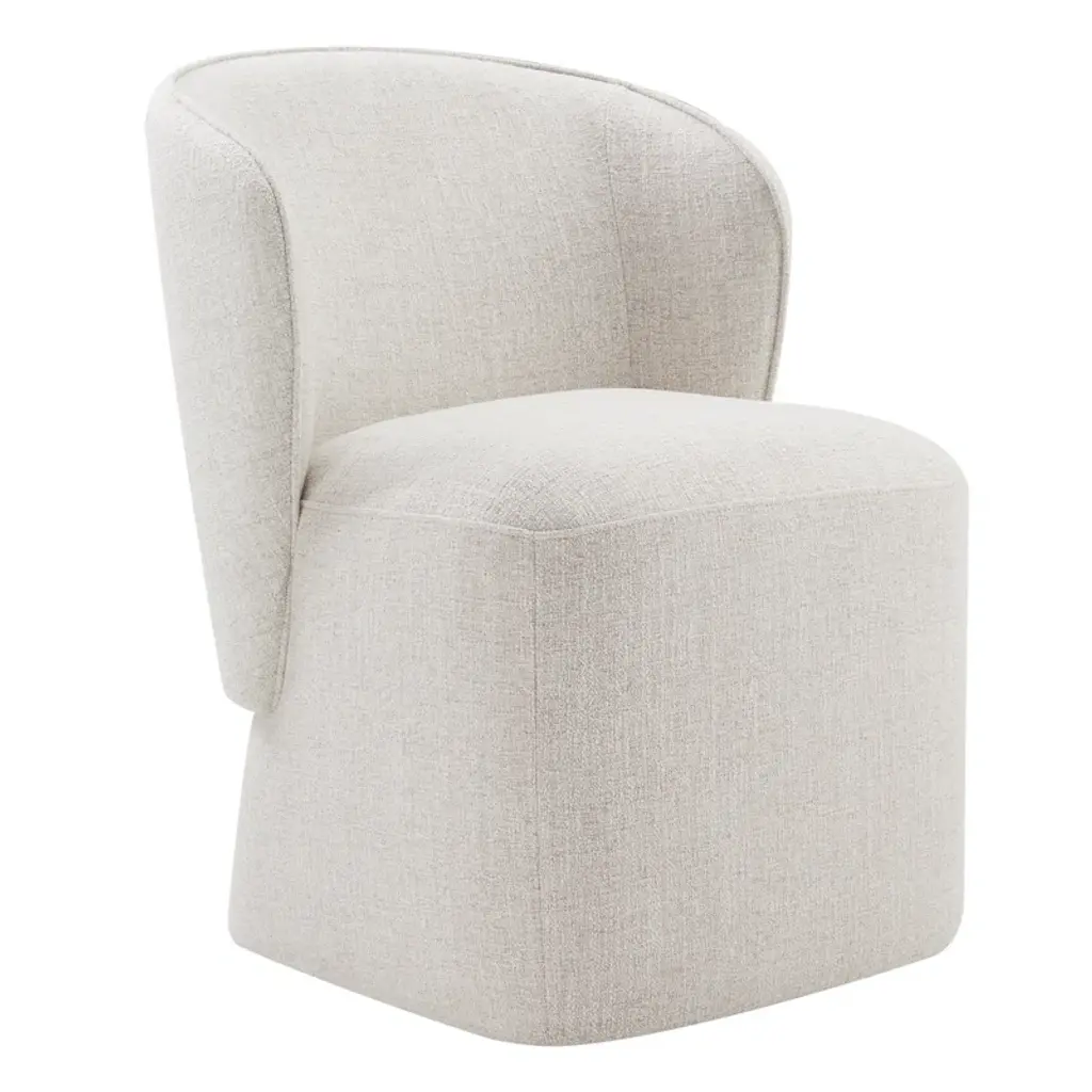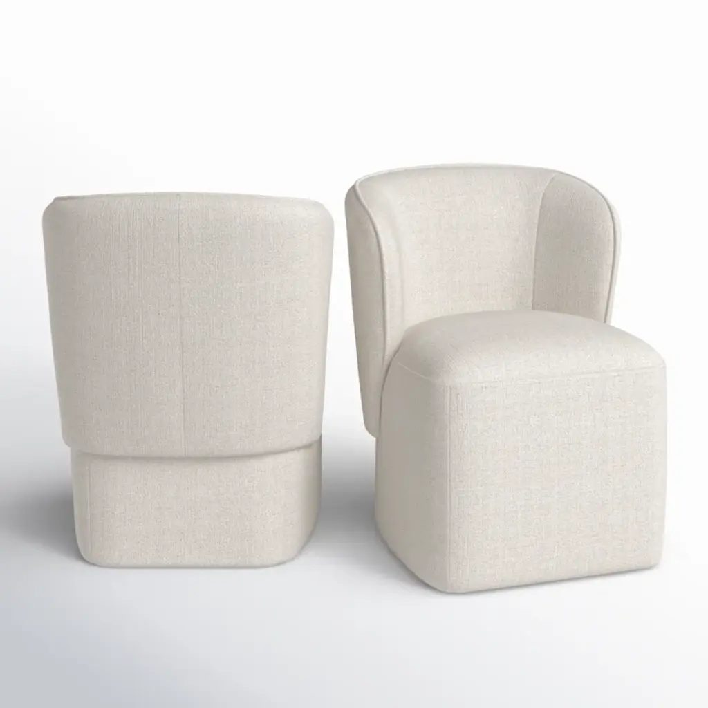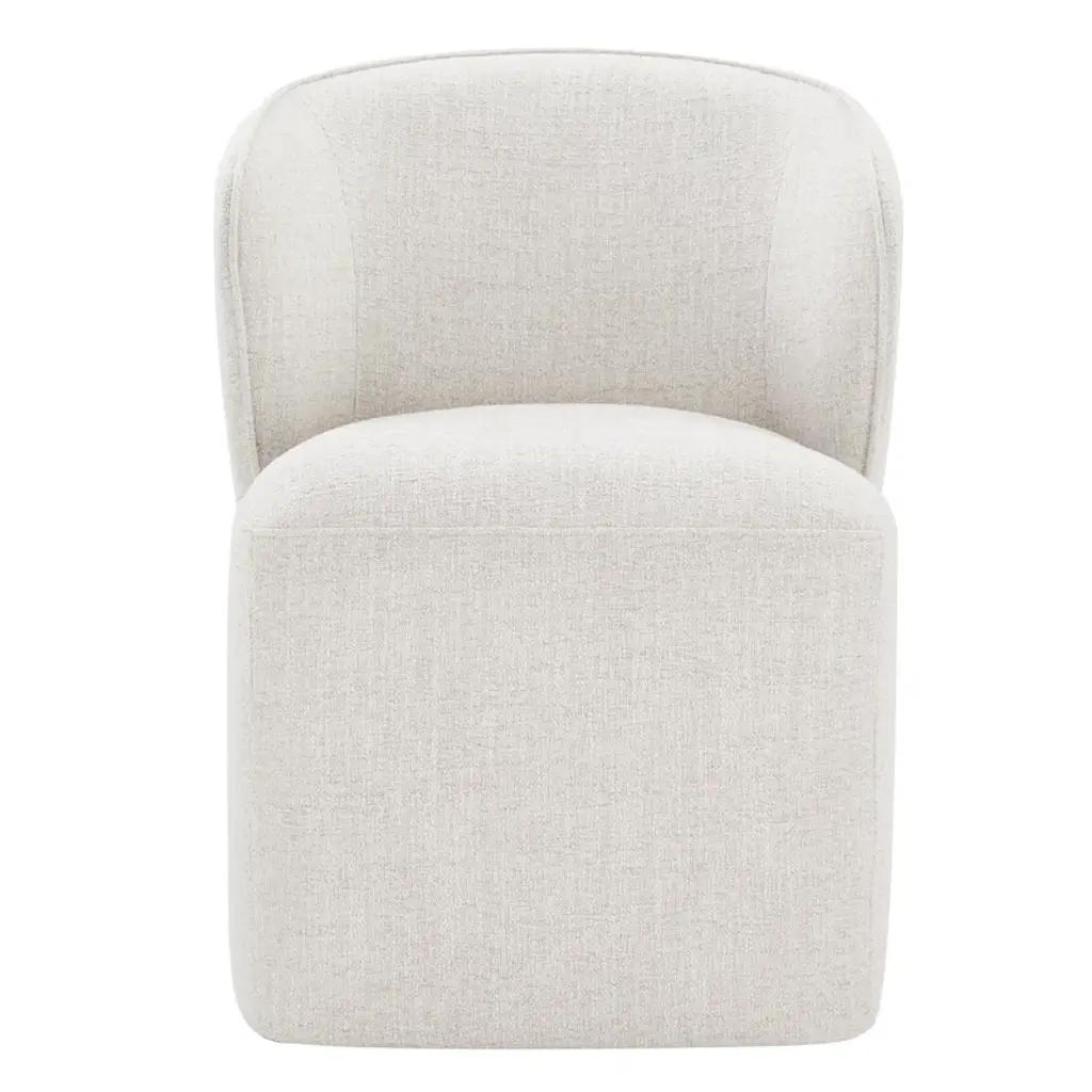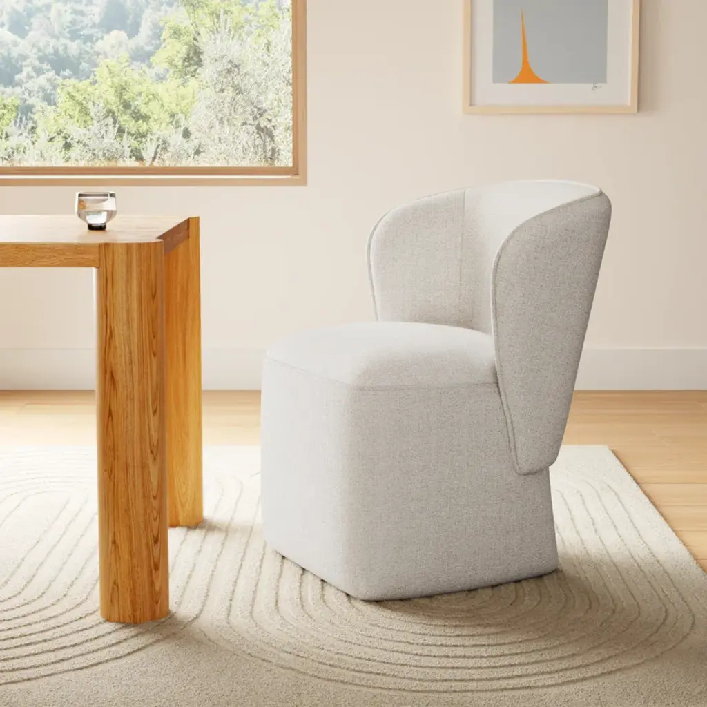 Your home should be a reflection of your personality. With its sophisticated, approachable, and functional design, the upholstered dining chair will do just that. Perfect for those looking to add something special to their space, the cube-shaped frame is contemporary and fun. Fully upholstered in a neutral, easy-to-clean upholstery, this chair looks great from every angle. The barrelback curves around you, so you can sit back supported while you converse. High-density foam and fiber cushioning create a comfortable sitting experience. Kiln-dried wood and quality techniques, like mortise and tenon joints, give the frame durability and longevity. Effortlessly transport this chair, including over carpet, with the out-of-sight caster wheels. Whether around the dining table, in the living room, or wheeled in your home office, the versatility and chic style of the dining chair will instantly transform your room.