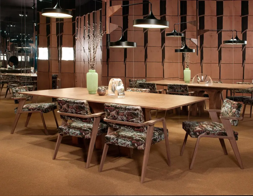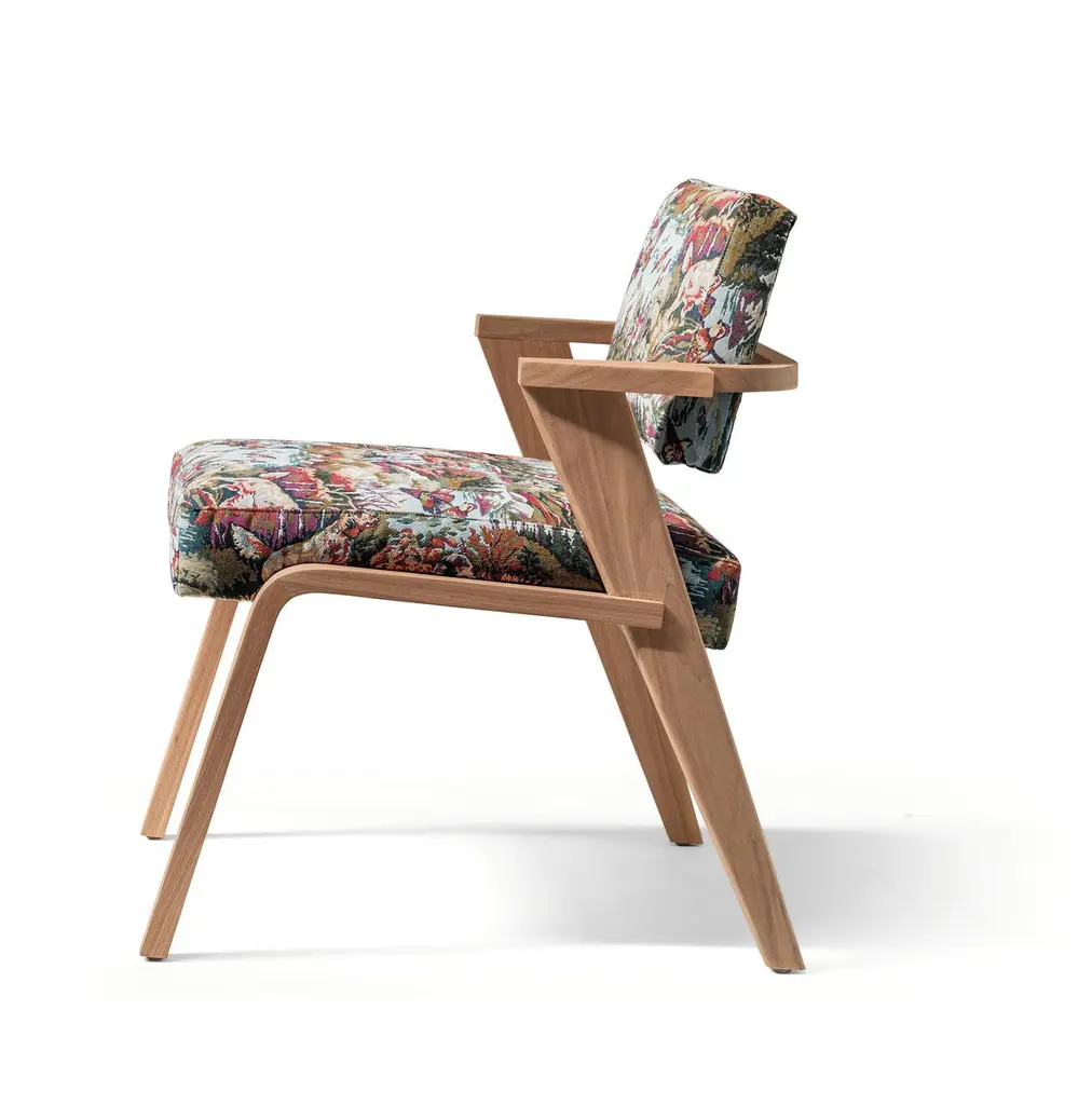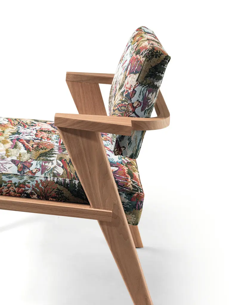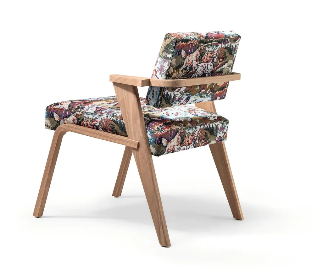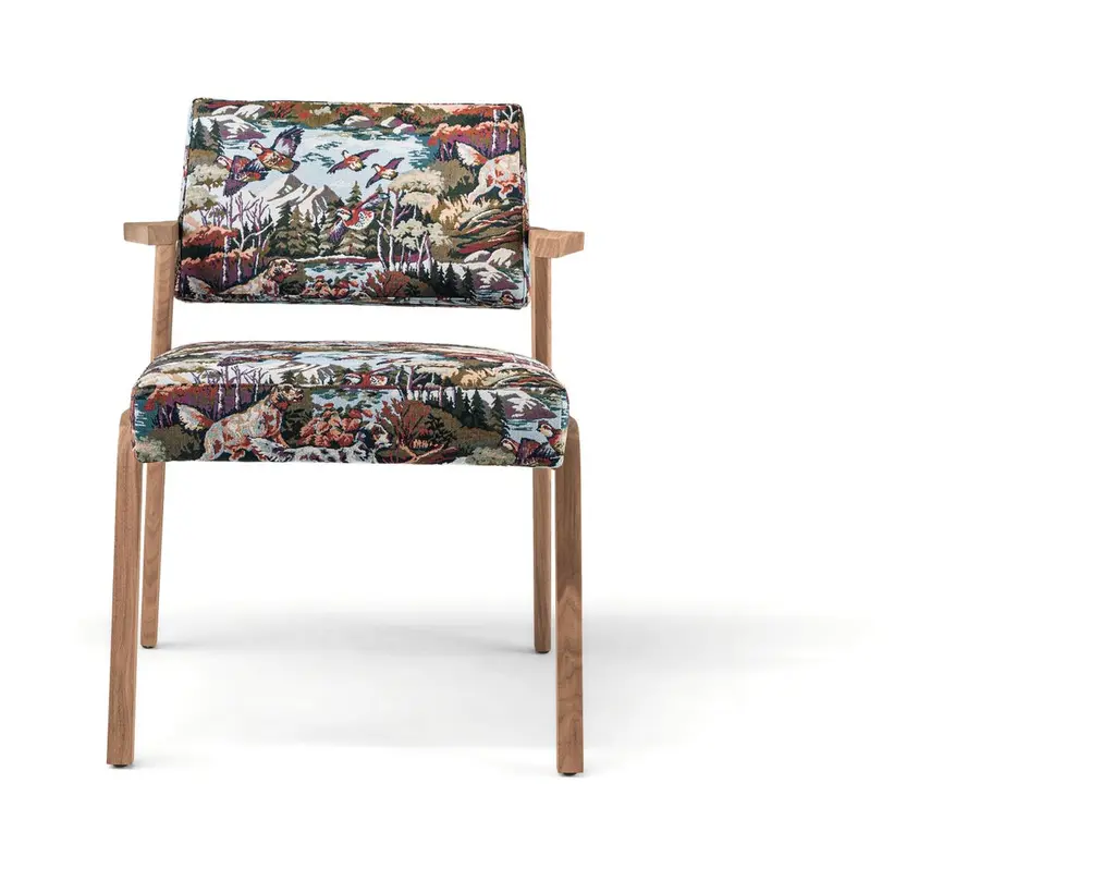 NOCINA/D is a dining armchair completely made from solid Canaletto walnut wood, then finished in matt natural (2% gloss). The seat and the backrest are covered with a fabric depicting a hunting scene.