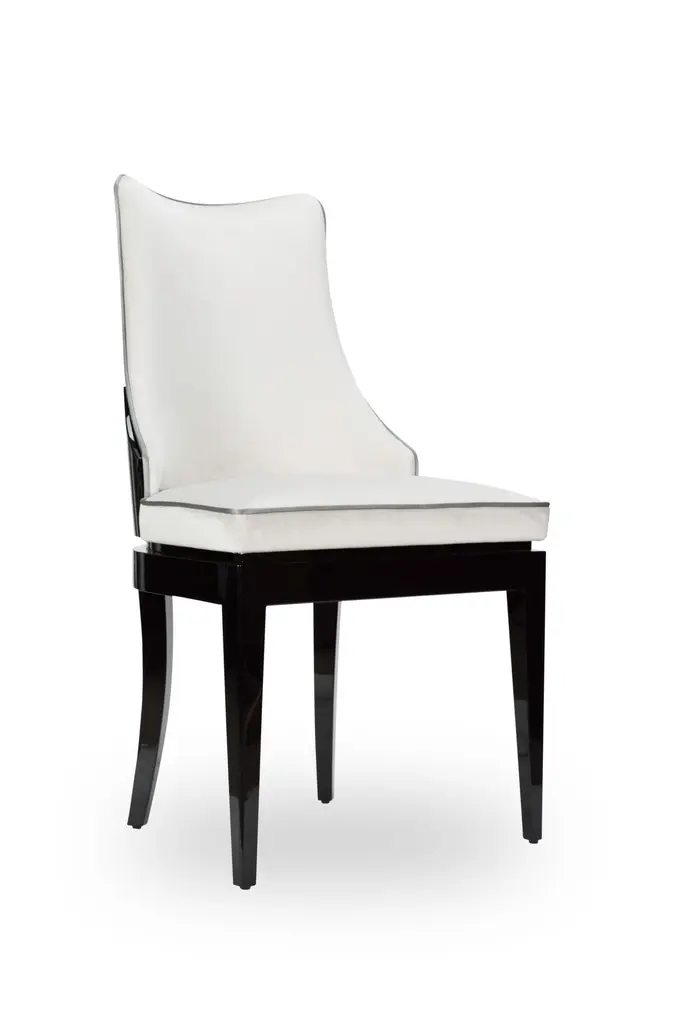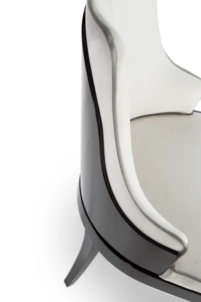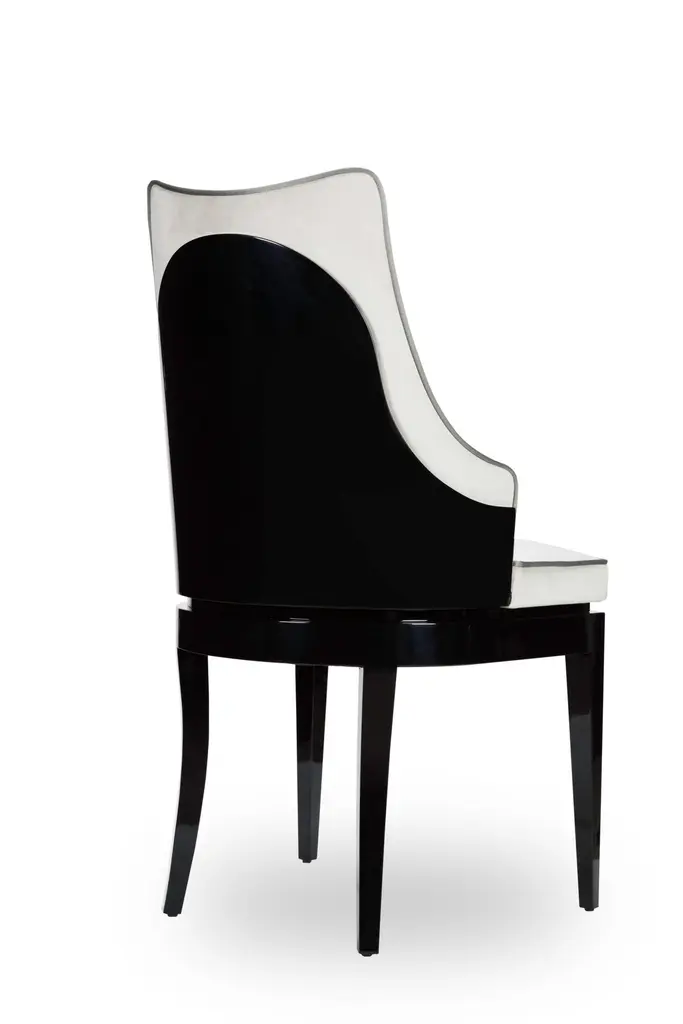 Noir I Dining Chair by Memoir EssenceDimensions: D 60 x W 55 x H 95 cm.Materials: High gloss black lacquered finish, velvet fabric SCSS 04 and satin fabric AB G066/05.Also available in client's fabric. Please contact us.Inspired in the imponent instrument grand piano black, in piano sheets and in a classical music environment the dining chairs Noir were born. Classical and dynamic these dining chairs have two versions, one in a long curvilinear black lacquer back and the second in a low curvilinear black lacquer back. Available separately you can choose and mix as you wish and like to your projects.Memoir Essence Interiors has been writing its memoirs day by day, inspired in every detail lived through a feminine world, this world brings the most delicate imaginary. Jewelry, fashion, architecture, music, art and materials are Memoir’s inspirations to materialize a collection of design pieces of furniture, upholstery, lighting and accessories.The use of noble materials like marble, brass, veneers, gold and silver leaf, Swarovski crystals as other decorative and fine materials, combined with handwork techniques as casted brass, hand-whickered fabric ribbons, gold leaf appliance, marble cutted and puzzled pieces, provide the needed essence to tell memoirs through the designed pieces and the interiors they fulfill.This collection mostly handmade and focused on details and material nobility is made in Portugal, bringing handwork techniques that are part of Portuguese history, applied in a current and differentiated way, delivering timeless pieces to your special projects. Acquire Memoir is the opportunity to travel through the feminine essence over design and experience a unique “memoir” of timelessness and exclusivity.Writing is first chapter in 2016, after a journey of inspirational research, forecasting and design, Memoir made its first appearance at Maison et Objet, Paris.Since then Memoir is “writing” memories adding new materials, designs, techniques and appearances around the world, as in Paris, London or UAE.Memoir will continue this journey, always motivated by the inspiration possibilities in the many delicate details found in feminine world.Tell your memoires with this collection and be a memorialist yourself…