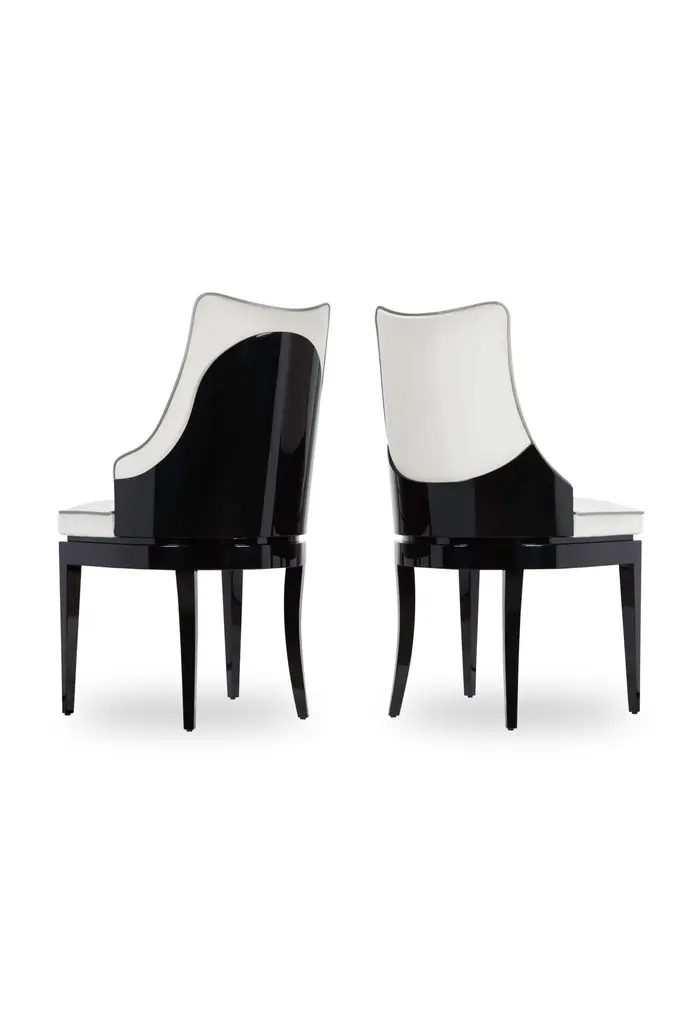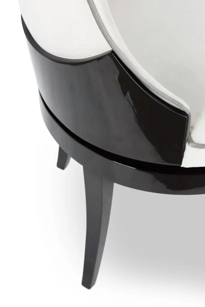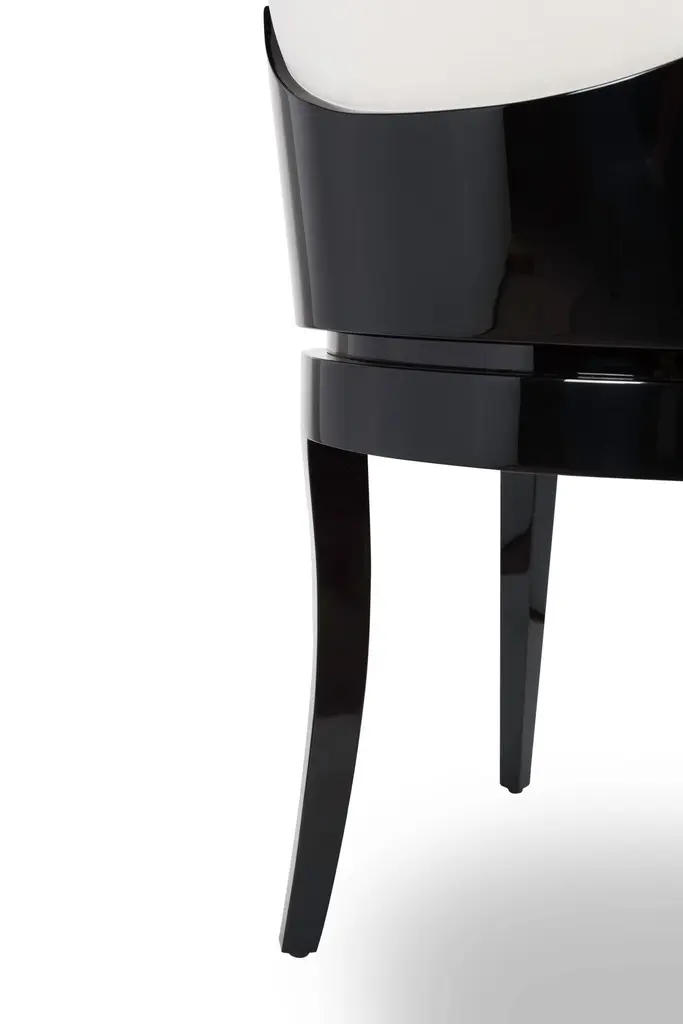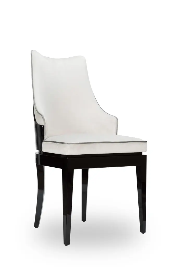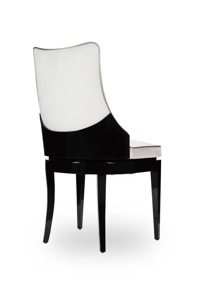 Noir II Dining Chair by Memoir EssenceDimensions: D 60 x W 55 x H 95 cm.Materials: High gloss black lacquered finish, velvet fabric SCSS 04 and satin fabric AB G066/05.Also available in client's fabric. Please contact us.Inspired in the imponent instrument grand piano black, in piano sheets and in a classical music environment the dining chairs Noir were born. Classical and dynamic these dining chairs have two versions, one in a long curvilinear black lacquer back and the second in a low curvilinear black lacquer back. Available separately you can choose and mix as you wish and like to your projects.Memoir Essence Interiors has been writing its memoirs day by day, inspired in every detail lived through a feminine world, this world brings the most delicate imaginary. Jewelry, fashion, architecture, music, art and materials are Memoir’s inspirations to materialize a collection of design pieces of furniture, upholstery, lighting and accessories.The use of noble materials like marble, brass, veneers, gold and silver leaf, Swarovski crystals as other decorative and fine materials, combined with handwork techniques as casted brass, hand-whickered fabric ribbons, gold leaf appliance, marble cutted and puzzled pieces, provide the needed essence to tell memoirs through the designed pieces and the interiors they fulfill.This collection mostly handmade and focused on details and material nobility is made in Portugal, bringing handwork techniques that are part of Portuguese history, applied in a current and differentiated way, delivering timeless pieces to your special projects. Acquire Memoir is the opportunity to travel through the feminine essence over design and experience a unique “memoir” of timelessness and exclusivity.Writing is first chapter in 2016, after a journey of inspirational research, forecasting and design, Memoir made its first appearance at Maison et Objet, Paris.Since then Memoir is “writing” memories adding new materials, designs, techniques and appearances around the world, as in Paris, London or UAE.Memoir will continue this journey, always motivated by the inspiration possibilities in the many delicate details found in feminine world.Tell your memoires with this collection and be a memorialist yourself…