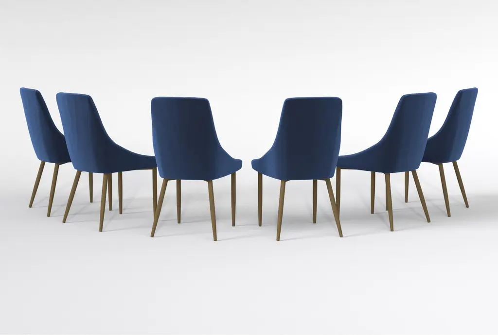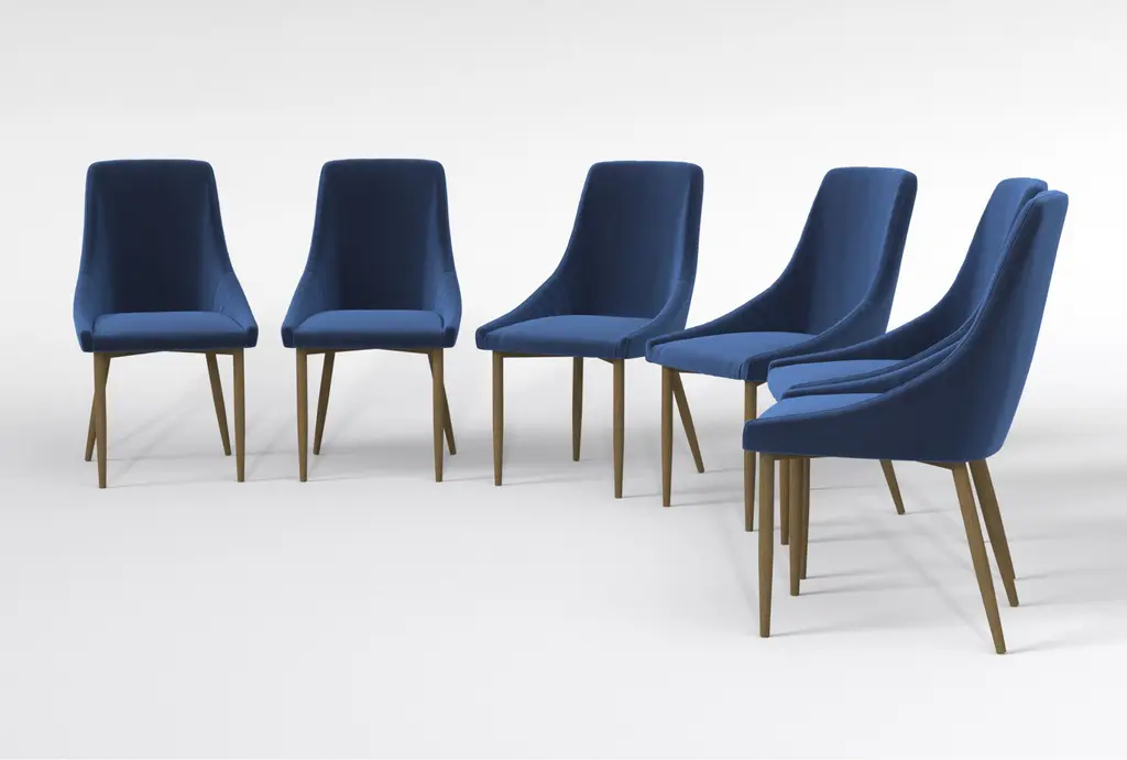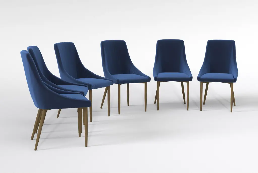 Enhance your dining experience with the Nora Blue Metal Fabric Swoop Arm Dining Side Chair Set of 6. These chairs are designed to provide comfort and style, making them a perfect addition to your dining room or kitchen. The deep blue fabric and metal tapered legs add a modern touch to any space.