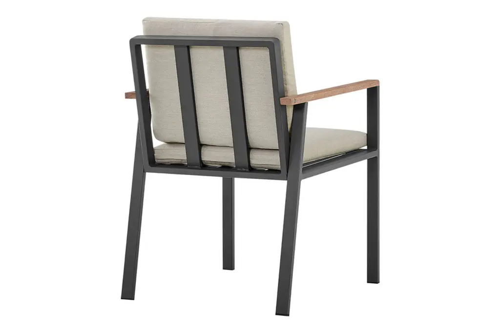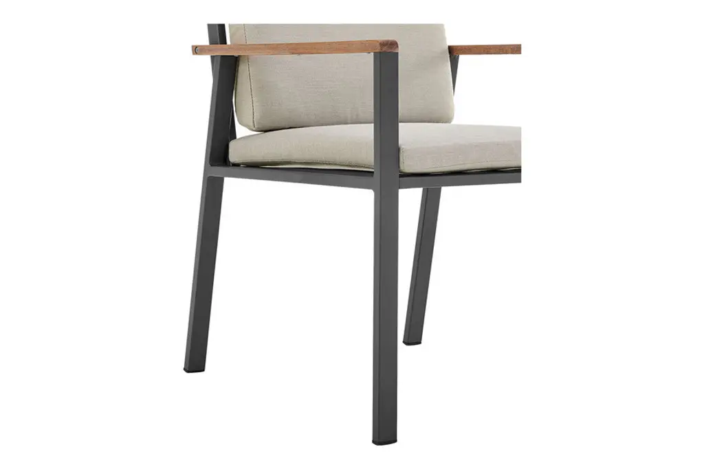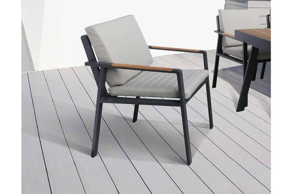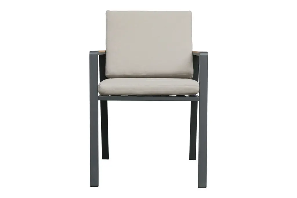 When you want to dine outside, this handsome Norfolk Dining Chair is the ideal choice. It has an elegant look and a lightweight metal frame with a charcoal finish to make it easy to transport. The chairs seat and back cushions are detachable and olefin upholstered. This means that they are resistant to chemicals, fading and water. The chairs arms feature accents of teak wood to further offer beauty. Combine this chair with the Nofi dining table for a complete look.