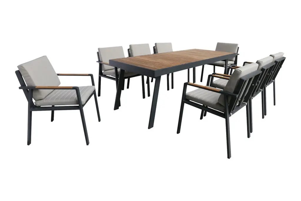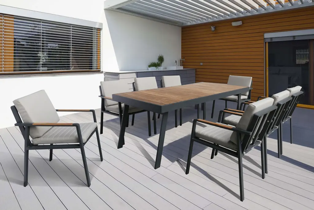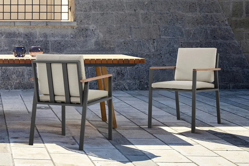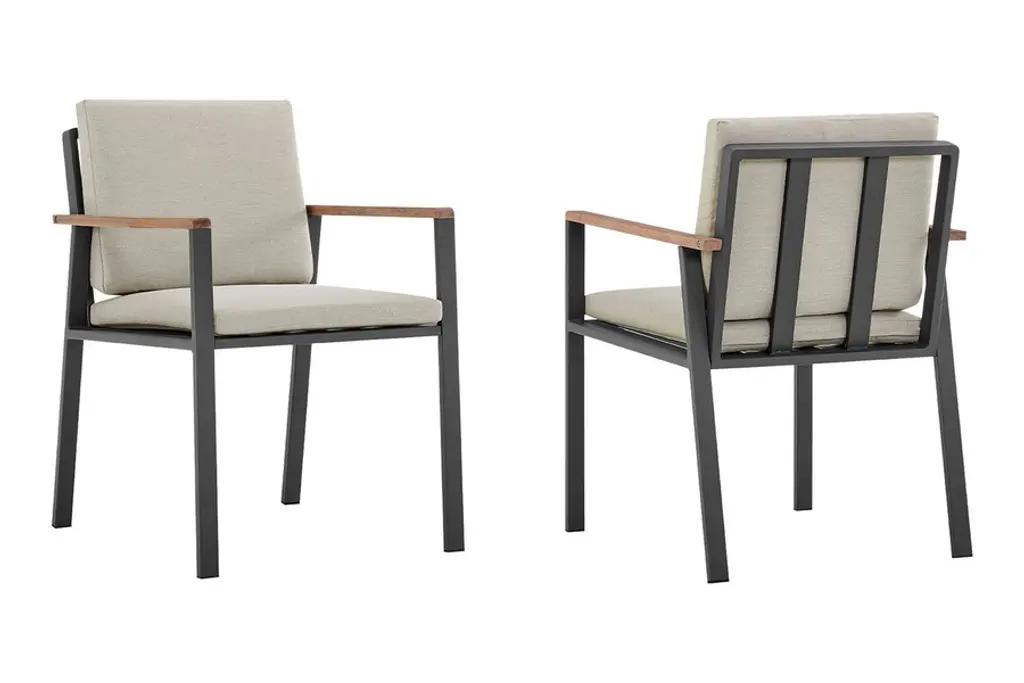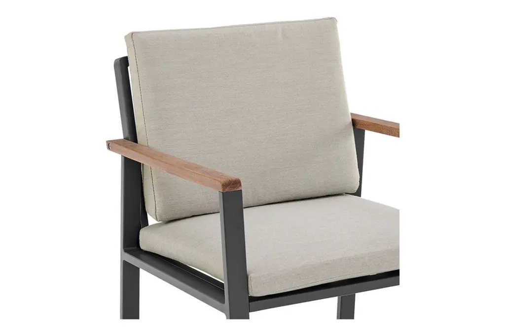 When you want to dine outside, this handsome Norfolk Dining Chair is the ideal choice. It has an elegant look and a lightweight metal frame with a charcoal finish to make it easy to transport. The chairs seat and back cushions are detachable and olefin upholstered. This means that they are resistant to chemicals, fading and water. The chairs arms feature accents of teak wood to further offer beauty. Combine this chair with the Nofi dining table for a complete look.